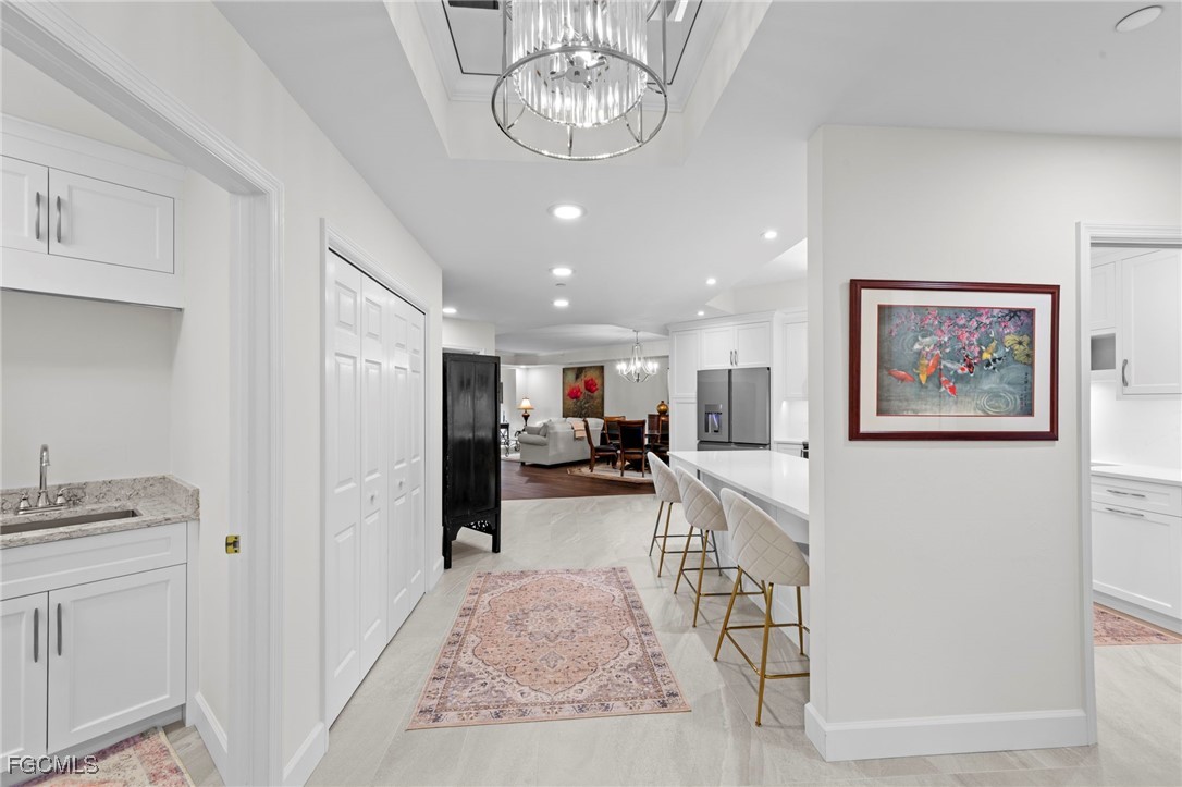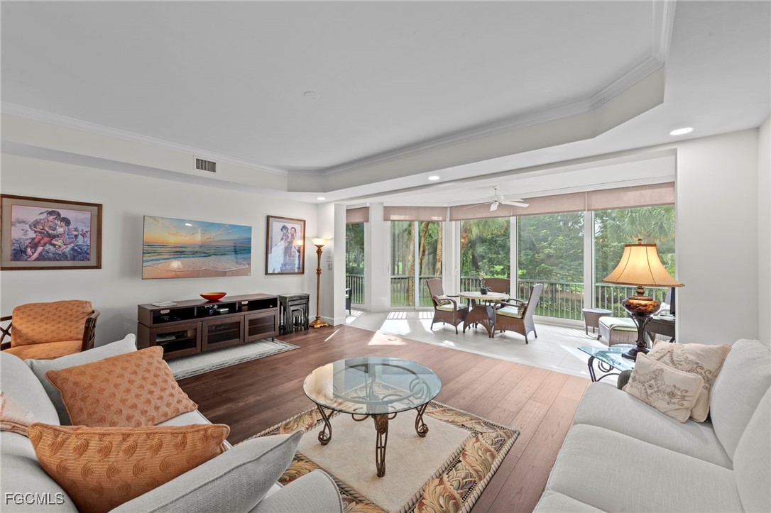 Welcome to this beautifully renovated condo at The Crescent in Pelican Bay, where modern upgrades meet the best of resort-style living in Naples. From the inviting entry you are drawn through the unit to the glass & screened enclosed sunroom offering tropical vistas over the garden areas and fairway. The redesigned kitchen shines with white cabinetry, quartz countertops, and premium stainless appliances, while new hardwood and tile floors flow seamlessly throughout. Expanded living areas with hurricane-rated doors add both space and security. The primary suite offers a relaxing retreat with a remodeled bath, quartz counters, updated shower and tub, and custom closets. Guests will feel right at home with spacious bedrooms, including one with its own ensuite. Recent updates like new A/C and hot water heater (2023) keep the home efficient and worry-free. The Crescent offers its own clubhouse, pool, spa, and fitness center, plus all the Pelican Bay perks—private beach access with beachfront dining, tennis, miles of walking and biking paths, with canoes and kayaks for residents. Just minutes to Waterside Shops and Mercato. This is the perfect blend of comfort, convenience, and Florida lifestyle in one of Naples’ most sought-after communities. The Crescent in Pelican Bay received no damage from last 3 hurricanes and no water intrusion in garage.