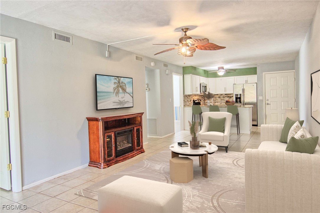 This first-floor end-unit condo in Cape Coral offers immediate rental income and strong long-term potential. Ideally situated between Pine Island Road and US-41, the home features tile flooring throughout, an updated kitchen with granite countertops, stainless steel appliances, soft-close cabinetry, and a breakfast bar. The split floor plan provides privacy, with the primary ensuite at the back of the home offering a spacious walk-in closet and step-in shower, while the guest bedroom and full bath are at the front. The living area flows to a screened lanai with tropical views, and covered parking is conveniently just steps from the door.