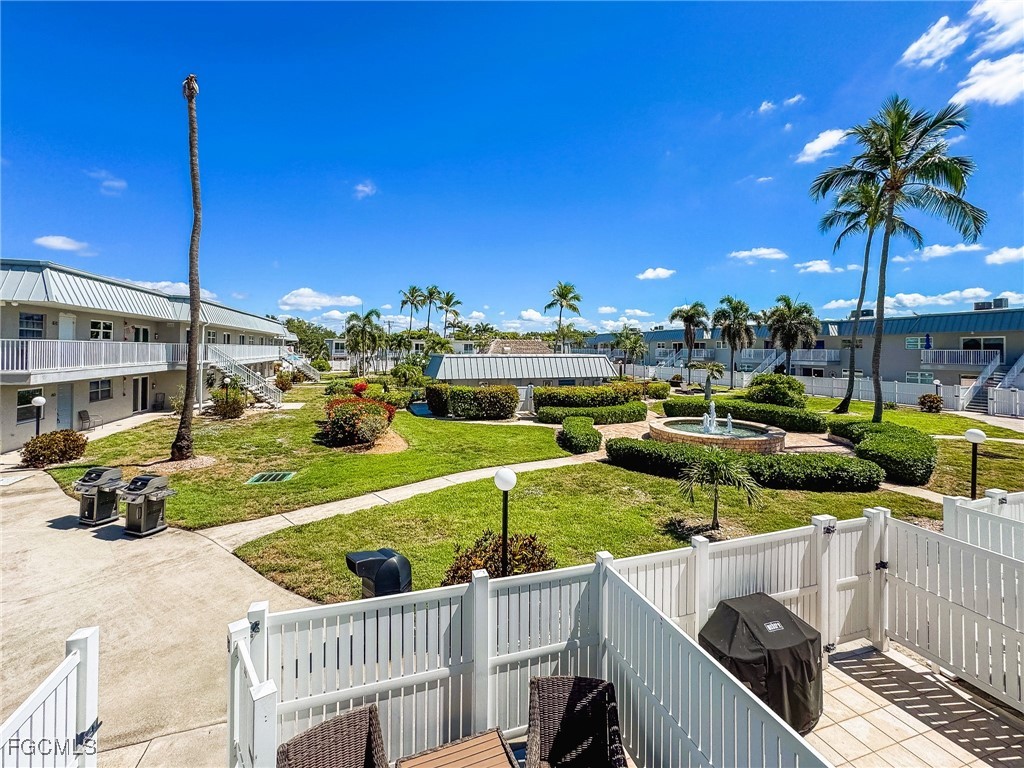 The first floor features durable tile and vinyl flooring, a convenient half bath, and a laundry area tucked inside for added ease. Upstairs, you’ll find two comfortable bedrooms and a full bathroom. The primary bedroom opens to a balcony overlooking the courtyard and the beautifully landscaped community grounds — complete with tranquil fountains and tropical greenery. Both bedrooms feature large closets for plenty of storage.