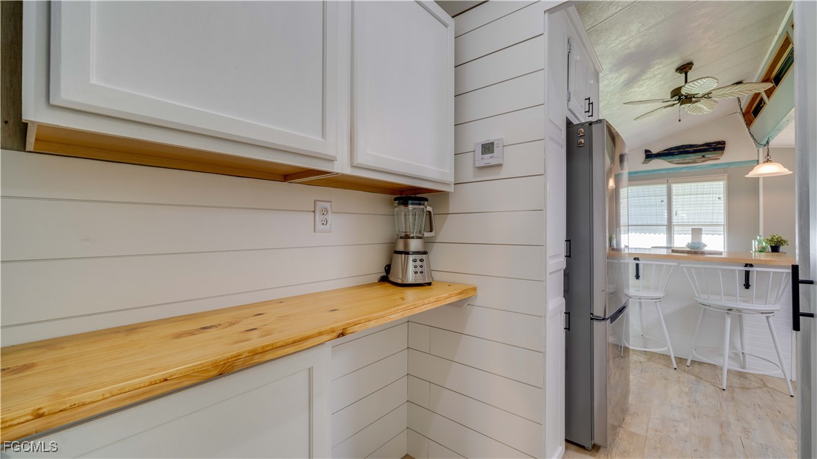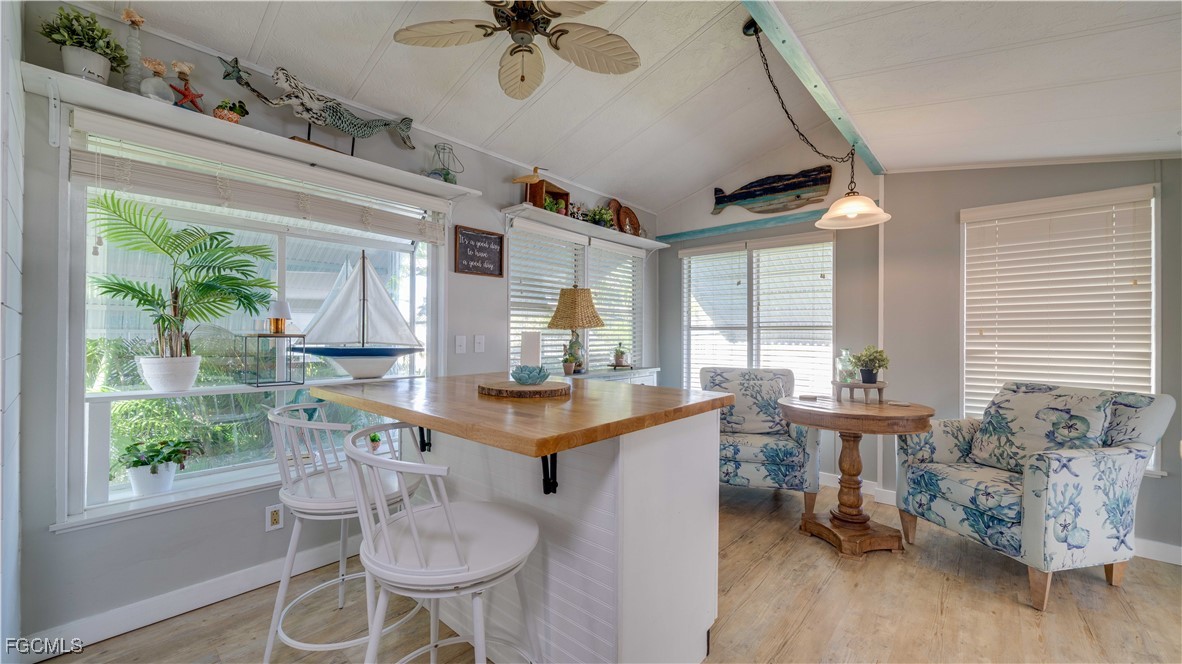 Light, Bright, and Move-In Ready! This turnkey 1-bedroom, 1.5-bath home is a true oasis. Featuring brand-new LVP flooring and fully remodeled kitchen, bedroom, and baths, every detail has been thoughtfully designed. The kitchen boasts beautiful butcher block-style countertops, a matching island with ample storage, and all-new appliances. A convenient, butler’s pantry adds even more space for organization. The bedroom has been reconfigured with a modern layout and includes a new ceiling fan for added comfort. The full bath features a new vanity and fresh subway tile in the shower, creating a clean, coastal feel. Neutral tones with beachy accents flow throughout, giving this home a relaxed, inviting atmosphere. Enjoy a private laundry room with a utility sink, additional storage, and direct access to your patio—perfect for soaking up the Florida sunshine. Close proximity to the community pool, clubhouse, and shuffleboard courts. LOW HOA fees include cable, Wi-Fi, and water! Pets are welcome, and best of all—you own the land! Pine Ridge Palms is a 55+ community located in South Fort Myers, close to beaches, shopping, dining, and entertainment. Whether you’re looking for a winter retreat or a full-time residence, this home offers the perfect slice of paradise.