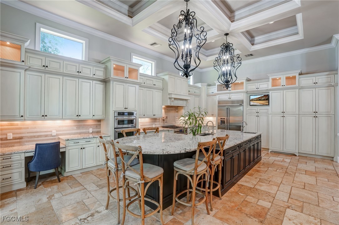 Located in the highly sought-after Monterey neighborhood—renowned for its A-Rated schools and unbeatable proximity to the beach, shopping, and dining—this beautifully updated home delivers exceptional living both inside and out. Remodeled in 2012–2013, it boasts a newer roof and soaring 13-ft. ceilings that elevate the open-concept floor plan, creating an airy, modern feel ideal for everyday living and effortless entertaining. At the heart of the home is a true chef’s kitchen featuring an impressive 15-ft. island, dual ovens, dual dishwashers, and premium JennAir appliances—perfect for cooking, gathering, and hosting in style. All bedrooms are generously sized with newly added walk-in closets, and a versatile bonus room offers endless possibilities as a media room, playroom, or den. Step outside to your private resort-style oasis. The newly remodeled (2024) patio and pool area includes a fully equipped outdoor kitchen, designed for year-round enjoyment and unforgettable gatherings. Additional highlights include newer A/C units (all under 5 years old) and two garages providing parking for up to four cars. Modern upgrades, expansive living spaces, and luxury amenities come together to create a truly exceptional property—this is one you won’t want to miss! Newly updated chandeliers to kitchen and dinning room not pictured