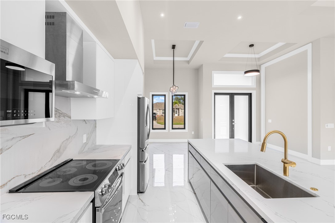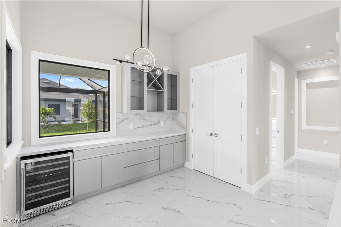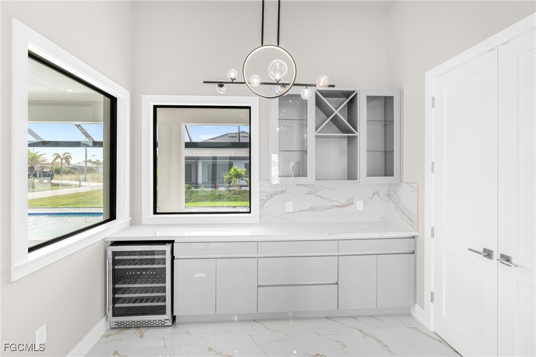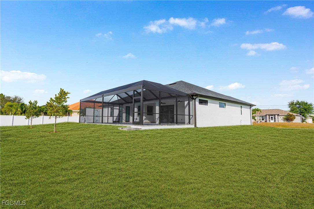 Exceptional craftsmanship defines this brand-new, move-in-ready pool home, ideally located in a desirable area of Southwest Cape Coral on an oversized corner lot, surrounded by beautiful newer homes. The open great-room floor plan showcases 12-foot ceilings with elegant tray details soaring to 14 feet, complemented by 8-foot interior doors throughout. The home features quartz countertops, European-style cabinetry, and 32x32 porcelain tile flooring, creating a modern and refined aesthetic. The kitchen is equipped with stainless steel appliances, contemporary fixtures, and convenient floor outlets in the living area. The spacious primary suite offers a true spa-like retreat, featuring a freestanding deep soaking tub and a modern walk-in shower with multiple shower heads. Outdoor living is exceptional, highlighted by a 12' x 30' swimming pool with sun deck and bubblers, a screened enclosure, and an expansive nearly 40-foot lanai providing cooling shade. The outdoor kitchen includes a grill, sink, and quartz countertops, along with a hot and cold outdoor shower, making it ideal for entertaining. Additional features include impact-resistant windows and doors, an impact-rated insulated garage door, gutters surrounding the home, epoxy-finished garage floors,Garage has Literal Motor with wifi and Bluetooth, outdoor soffit lighting, and wide pavered walkways from the driveway to the front entrance. The laundry room is well appointed with cabinetry, sink, and closet. Kitchen Has a Wine Cooler and Coffee Bar Setup of a Kind Home Enjoy a prime location with the ability to walk, bike, or drive to Surfside shops, restaurants, gyms, and favorite stores. Miles of sidewalks extend in all directions, with close proximity to all of Cape Coral and easy access to Fort Myers.