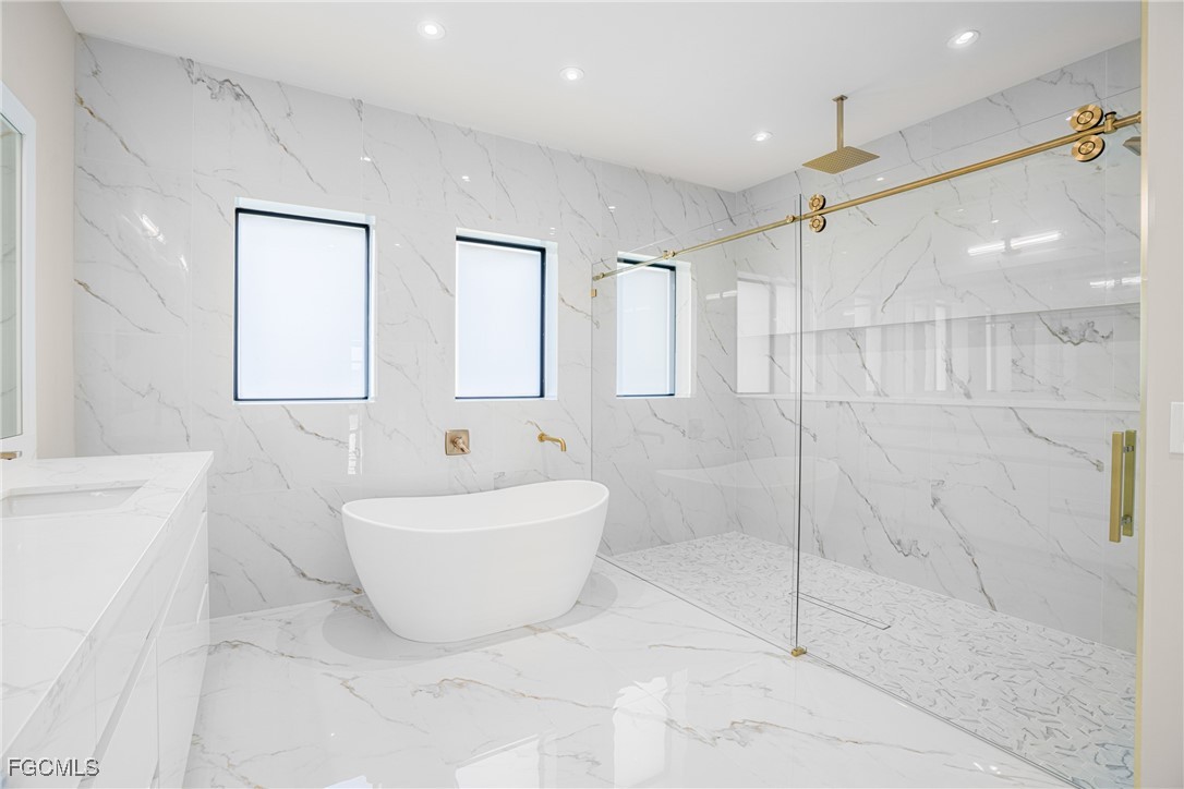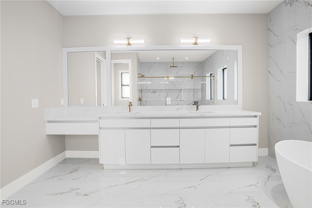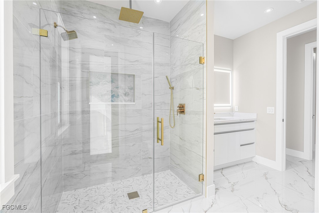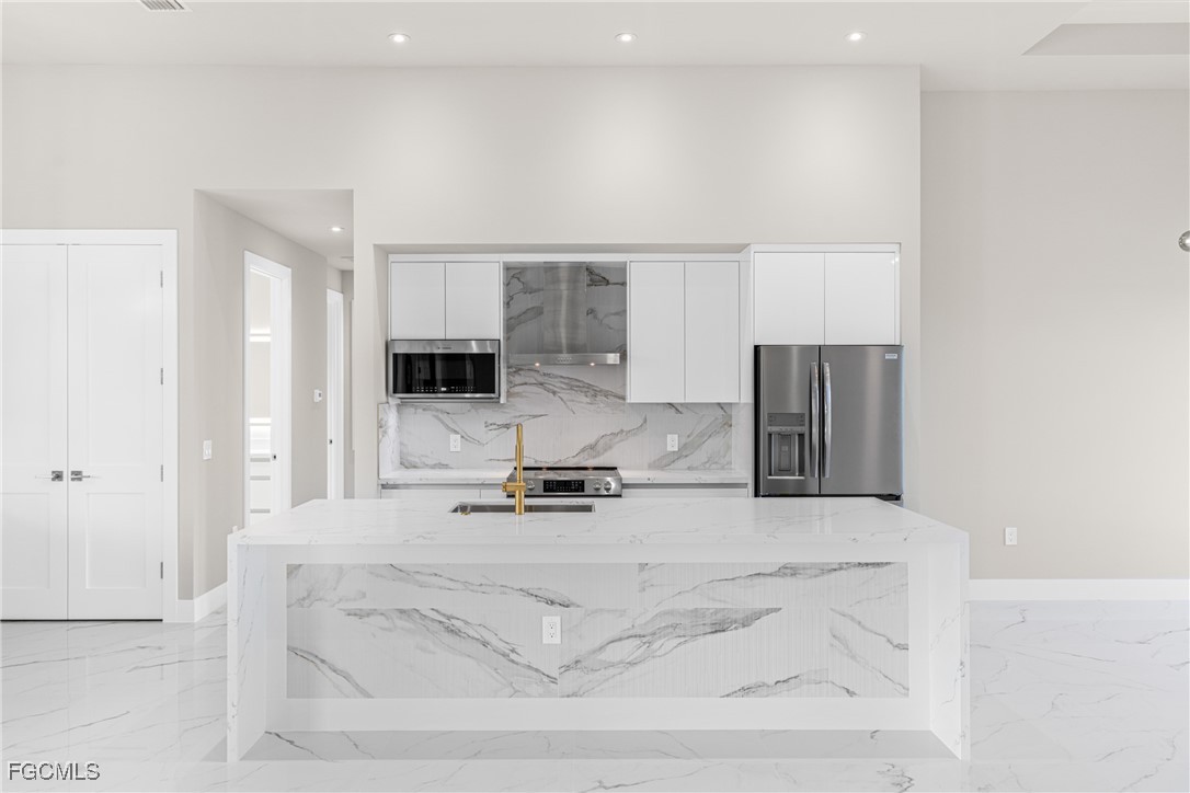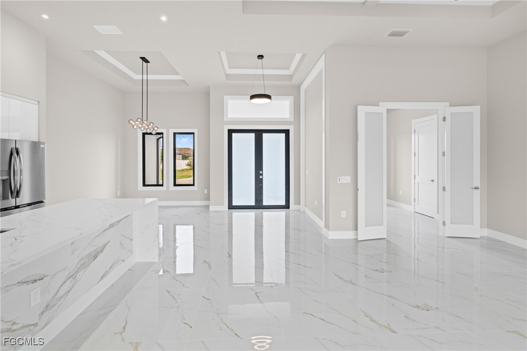 Exceptional craftsmanship defines this brand-new, move-in-ready pool home, ideally located in a desirable area of Southwest Cape Coral on an oversized corner lot, surrounded by beautiful newer homes. The open great-room floor plan showcases 12-foot ceilings with elegant tray details soaring to 14 feet, complemented by 8-foot interior doors throughout. The home features quartz countertops, European-style cabinetry, and 32x32 porcelain tile flooring, creating a modern and refined aesthetic. The kitchen is equipped with stainless steel appliances, contemporary fixtures, and convenient floor outlets in the living area. The spacious primary suite offers a true spa-like retreat, featuring a freestanding deep soaking tub and a modern walk-in shower with multiple shower heads. Outdoor living is exceptional, highlighted by a 12' x 30' swimming pool with sun deck and bubblers, a screened enclosure, and an expansive nearly 40-foot lanai providing cooling shade. The outdoor kitchen includes a grill, sink, and quartz countertops, along with a hot and cold outdoor shower, making it ideal for entertaining. Additional features include impact-resistant windows and doors, an impact-rated insulated garage door, gutters surrounding the home, epoxy-finished garage floors,Garage has Literal Motor with wifi and Bluetooth, outdoor soffit lighting, and wide pavered walkways from the driveway to the front entrance. The laundry room is well appointed with cabinetry, sink, and closet. Kitchen Has a Wine Cooler and Coffee Bar Setup of a Kind Home Enjoy a prime location with the ability to walk, bike, or drive to Surfside shops, restaurants, gyms, and favorite stores. Miles of sidewalks extend in all directions, with close proximity to all of Cape Coral and easy access to Fort Myers.