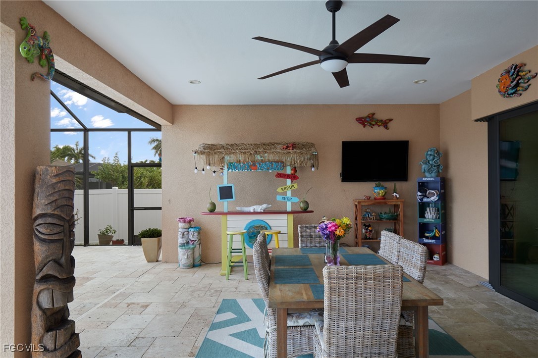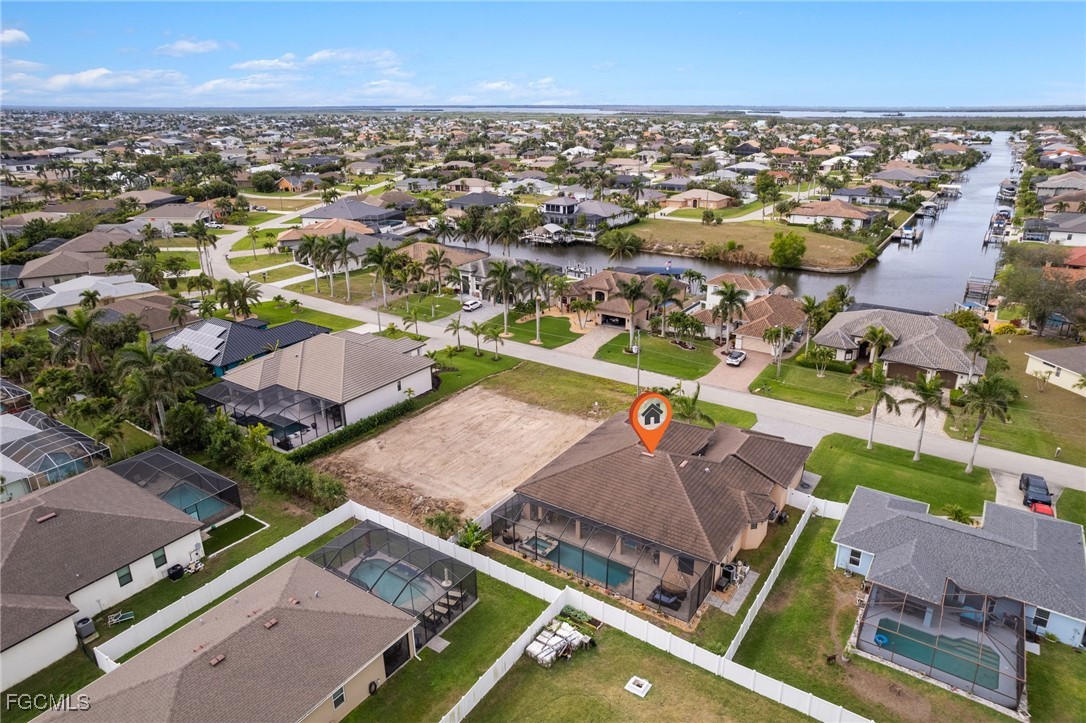 Welcome to luxury living in the desirable Surfside Blvd area of Cape Coral! This stunning move-in ready custom home offers 4 spacious bedrooms, 3.5 bathrooms, and a versatile den/flex room, all within a thoughtfully designed open-concept layout. The home features elegant travertine flooring throughout, soaring 12-foot ceilings in the main living area, and a showstopping great room with a coffered ceiling and expansive 16-foot sliding doors that open to your private outdoor oasis. Enjoy not one, but two luxurious master suites perfect for multi-generational living, extended guests, or ultimate privacy. The primary master suite features a tray ceiling, spacious custom walk-in closet, and a spa-inspired bathroom with dual sinks, granite countertops, a jetted bathtub, and a large dual walk-in shower. The second master suite includes its own private en-suite bathroom with granite counters and a tiled shower. The chef’s kitchen is ideal for entertaining and everyday living, offering 42” soft-close wood cabinets, a large granite island, tile backsplash, stainless steel appliances, a glass cooktop, wall oven, and microwave. Step outside to a covered lanai featuring a resort-style heated saltwater pool with a spillover spa, private pool bath, screen enclosure, and plenty of space for relaxing or entertaining. Additional features include a split bedroom floor plan for enhanced privacy, an extra deep garage with 8-foot-tall doors for large vehicles, a pavered driveway, impact-resistant windows and doors, lush landscaping with an irrigation system, and a fully fenced yard ideal for pets or added seclusion. This home truly combines comfort, style, and functionality in one exceptional package. Don’t miss your chance to own this beautiful Cape Coral home schedule your private showing today! Utility Assesments Paid In Full