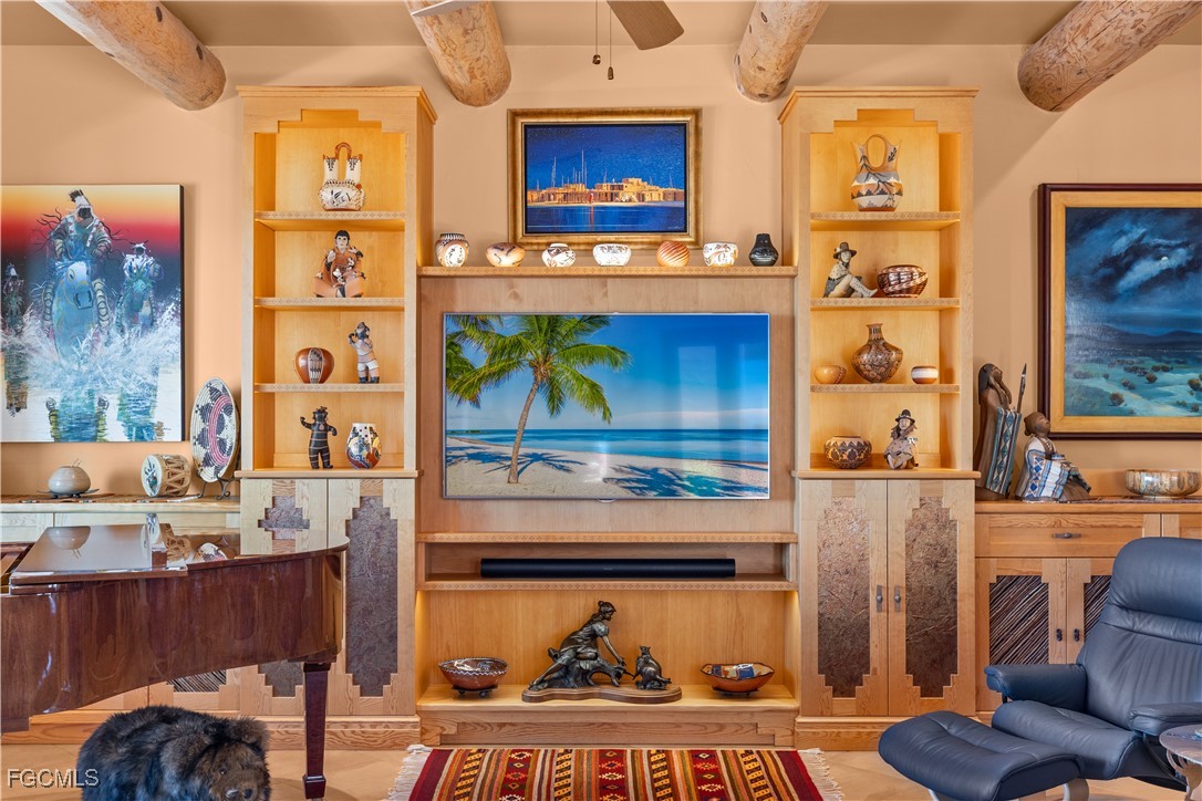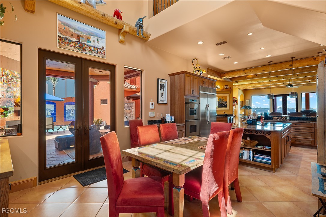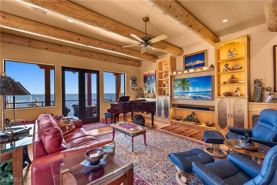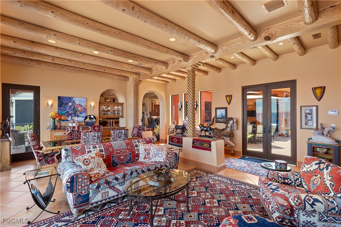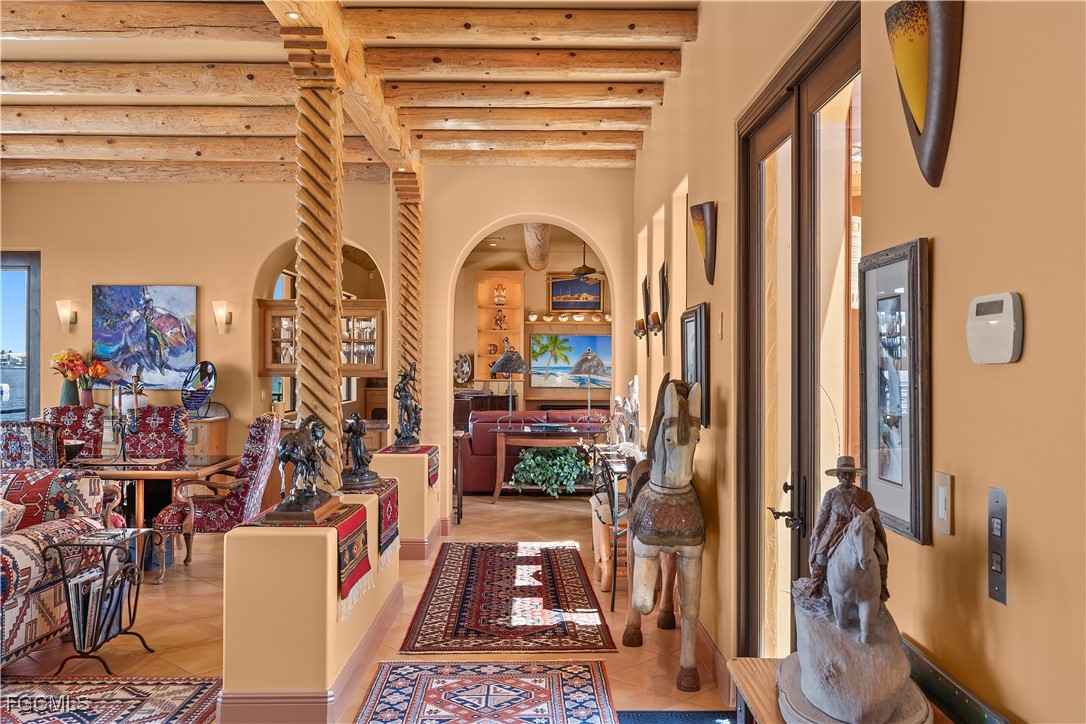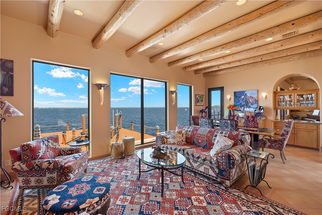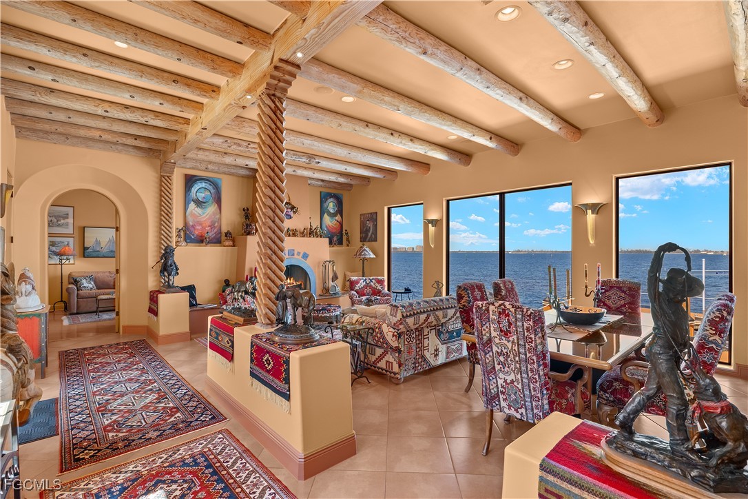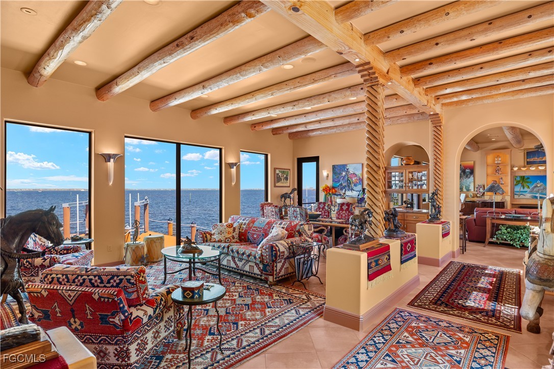 Offered for the first time, this extraordinary custom-built waterfront estate is a rare architectural expression inspired by the timeless beauty and heritage of Santa Fe. Thoughtfully designed by renowned Southwest Florida architect Bud Lawrence and constructed by a highly respected custom home builder, the residence reflects a true labor of love, craftsmanship, and intentional design rarely found in today’s market. Set within a private, gated waterfront community just minutes from Sanibel and Captiva Islands, the home is arranged in a secluded courtyard-style layout with a separate guest casita, creating a resort-like sense of privacy and tranquility. Warm, hand-troweled stucco, classic clay tile roofing, arched entries, decorative ironwork, and rich architectural textures define the exterior, evoking the charm of authentic Santa Fe estates while blending seamlessly into the Southwest Florida coastal environment. At the heart of the home, the private courtyard serves as a central gathering space, complete with a beautifully designed pool and spa, custom tile accents, covered seating areas, and inviting outdoor living spaces ideal for both quiet relaxation and entertaining. Multiple lanais and balconies extend the living experience outdoors, while mature landscaping and palm trees enhance privacy and ambiance. Inside, the home is a true celebration of Santa Fe craftsmanship. Extensive custom woodwork, exposed beam ceilings, sculpted ceiling details, carved columns, arched openings, and artisan tile accents create layers of character and authenticity that can only be fully appreciated by those who truly value the architectural heritage of the Southwest. Custom built-ins, nichos, and thoughtfully curated finishes add depth and warmth throughout the living spaces.Indoor and outdoor living come together effortlessly, with expansive openings and well-placed glass doors drawing in natural light and framing breathtaking waterfront views from multiple rooms. The home offers multiple gathering areas designed to flow naturally from one space to the next, perfect for everyday living, hosting family and friends, or entertaining on a grand scale. Fireside seating areas, art-filled living rooms, and open entertaining spaces all connect seamlessly to the outdoor courtyards, lanais, and balconies. Boating enthusiasts will appreciate the home’s prime waterfront setting with quick access to the bay and Gulf of Mexico, offering world-class fishing, island hopping, and waterfront dining by boat. This is a one-of-a-kind opportunity to own a custom architectural residence where Santa Fe soul, Southwest Florida lifestyle, and waterfront living come together in perfect harmony