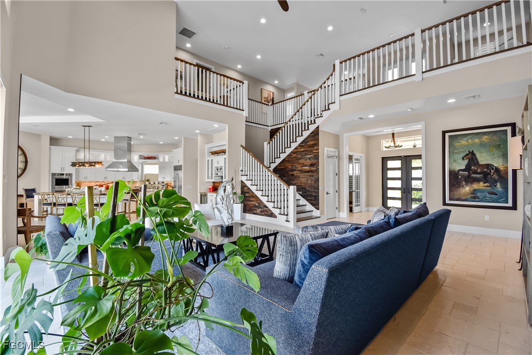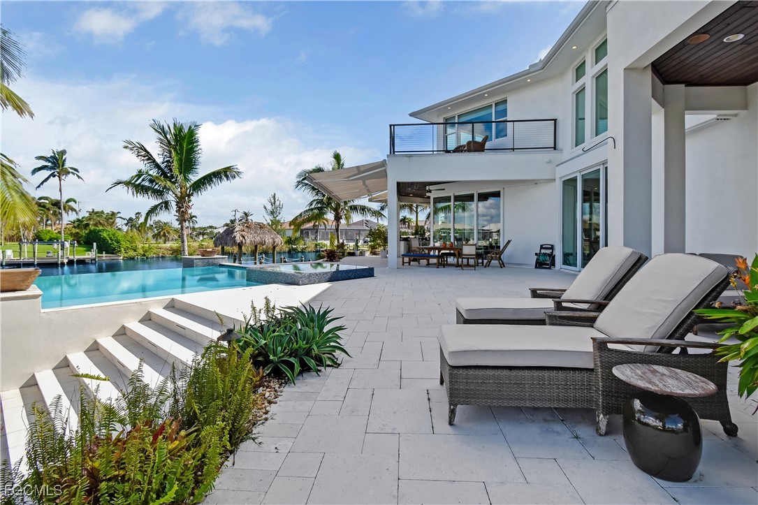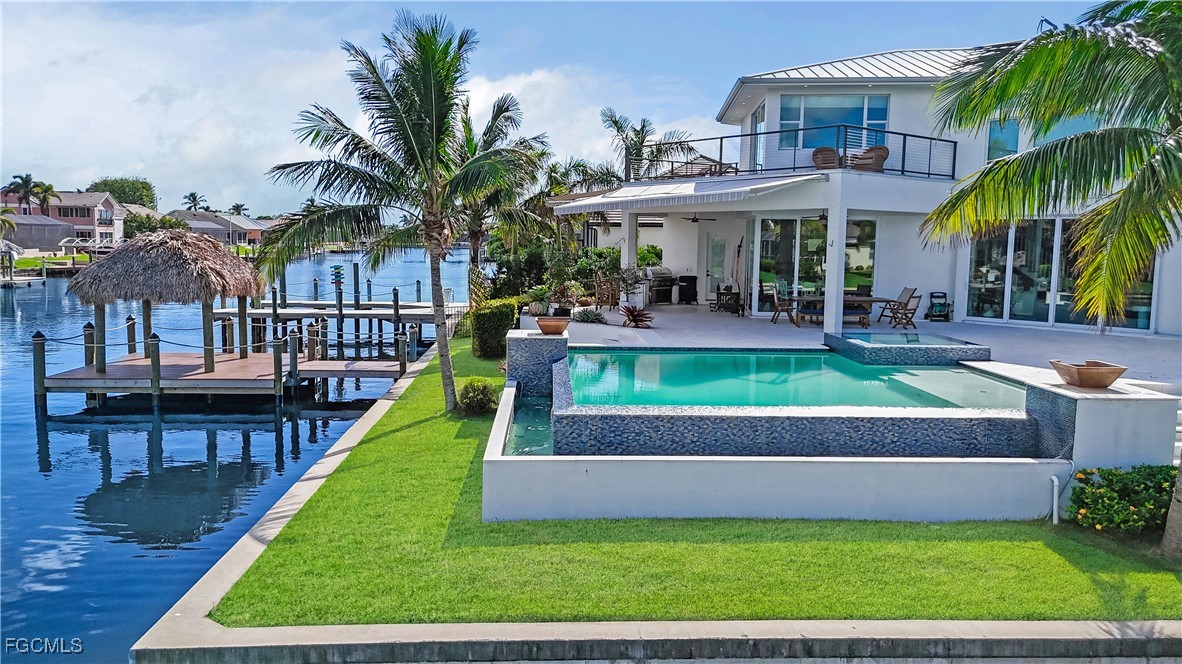 Waterfront 2018 custom-built luxury estate located in the highly sought-after SW Cape Coral, just off Surfside Blvd. This rare gem is perfectly situated at the end of a cul-de-sac, offering over 190 ft of Gulf-access waterfrontage with stunning intersecting canal views and a northern/northeastern rear exposure. Designed with meticulous attention to detail and modern finishes, this home embodies Florida's finest lifestyle, with boating, fishing, golfing, and easy access to marinas, shopping, airports, and beaches. Inside, you will be greeted by abundant natural light, serene water views from every angle, and impact windows throughout. The home is fully equipped with Savant smart home technology, seamlessly connecting the TVs, alarm security system, and lighting. The spacious and open gourmet kitchen features top-of-the-line appliances: the oven and grill are Wolf, and all refrigerators and the wine cooler are Sub-Zero, and is complemented by a bar and a butler's pantry. All countertops are quartz in the kitchen and bathrooms. The oversized primary suite is conveniently located on the first floor, offering direct access to the patio, a boutique-style closet, and a spa-inspired bathroom. Upstairs, a spacious loft awaits, ideal for a home theater, game room, or relaxation area. The second floor also features a second primary bedroom and two additional bedrooms, each with private balconies to enjoy the breathtaking views. The outdoor space is an entertainer’s paradise, boasting an infinity-heated pool, a brand-new 2024 tiki hut, a fully equipped summer kitchen, and a fenced patio. Whether hosting gatherings or unwinding after a long day, this home’s outdoor oasis delivers the ultimate Florida experience. Don't miss this rare opportunity to own a trophy property with direct Gulf access in one of Cape Coral's most desirable neighborhoods. Schedule your private showing today