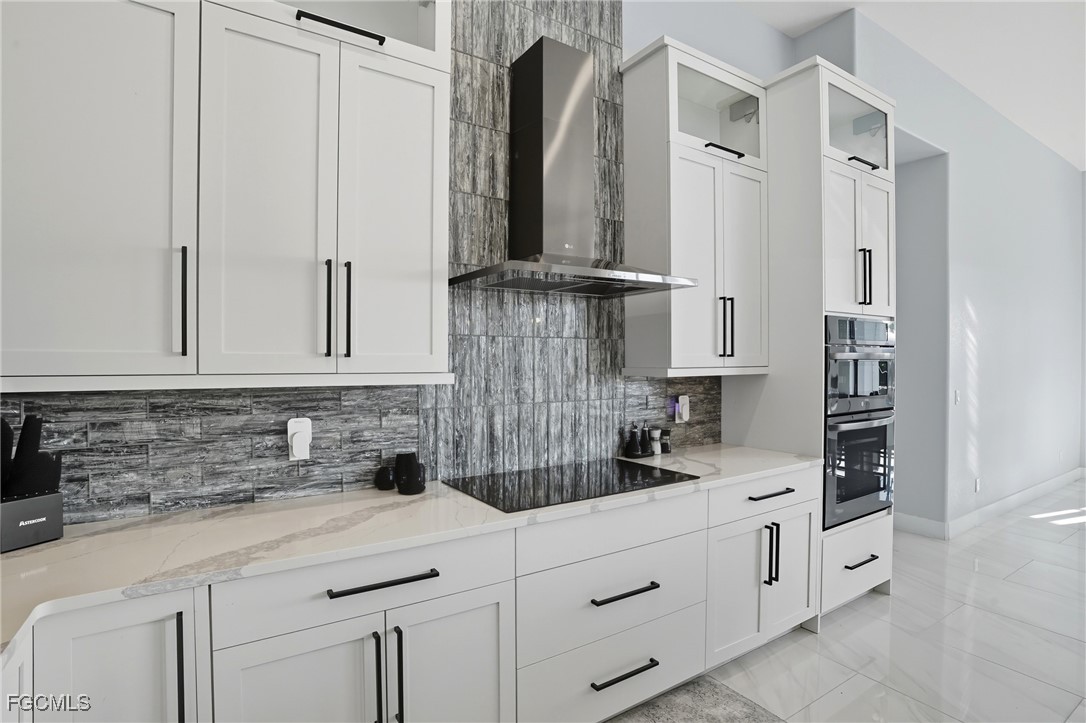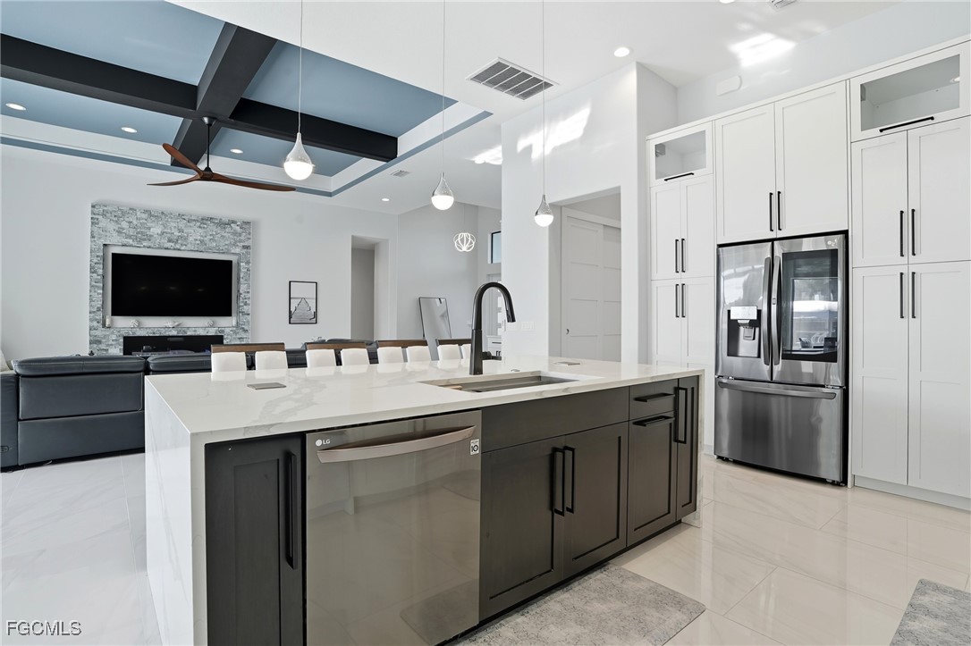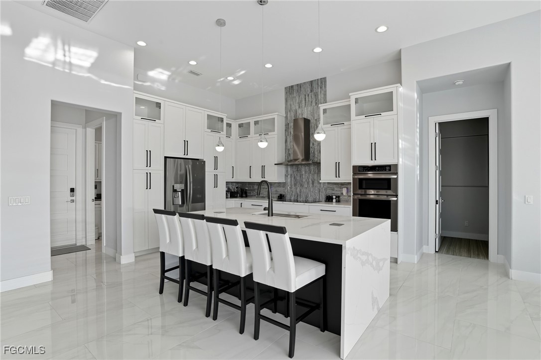 Inside, you’re welcomed by an open, airy floor plan showcasing high-end finishes throughout. The gourmet kitchen is a chef’s delight, featuring top-of-the-line stainless steel appliances, crisp white cabinetry with black hardware, and gorgeous quartz countertops. The kitchen flows seamlessly into the spacious living and dining areas, making it ideal for entertaining or everyday living.