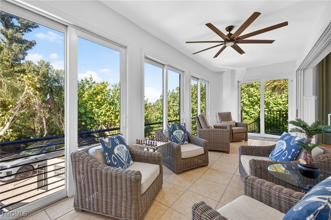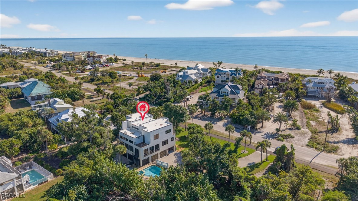 Located along the highly desirable West Gulf Drive corridor, this tri-level, 4 bedroom, 3.5 bath home offers an exceptional opportunity to enjoy refined island living on over half an acre of land directly across the street from the beach. This spectacular property spans 3,994 sq feet and showcases a striking contemporary design with distinctive art deco lines, defined by massive geometric forms, curving expanses of glass block, rounded corners, and an impressive six balconies and decks—creating a home that is both architecturally bold and uniquely coastal. The thoughtfully designed floor plan features expansive, light-filled interiors and open living spaces ideal for entertaining or everyday comfort. At the heart of the home, a gourmet kitchen anchors the main living area, offering a functional yet elegant space for hosting, and daily living. All impact windows and doors provide peace of mind, enhanced storm protection, and energy efficiency, while modern finishes and architectural details elevate the home’s sophisticated yet welcoming feel. The tri-level layout allows for excellent separation of space, with generous bedroom accommodations offering privacy and flexibility for family and guests. Outdoor living is a true highlight, featuring a screened lanai porch overlooking a private pool and spa. Adding exceptional functionality, the property includes a 3-car garage along with a large lower-level storage area, ideal for bikes, kayaks, beach gear, and island essentials. Deeded beach access places Sanibel’s white-sand shoreline just moments away, while the across-the-street beach location allows for effortless days of shelling, sunset walks, and coastal living. Set in one of Sanibel’s most sought-after locations, this residence offers convenient access to scenic bike paths, renowned dining, and the island’s natural beauty, all while maintaining a tranquil and private setting.