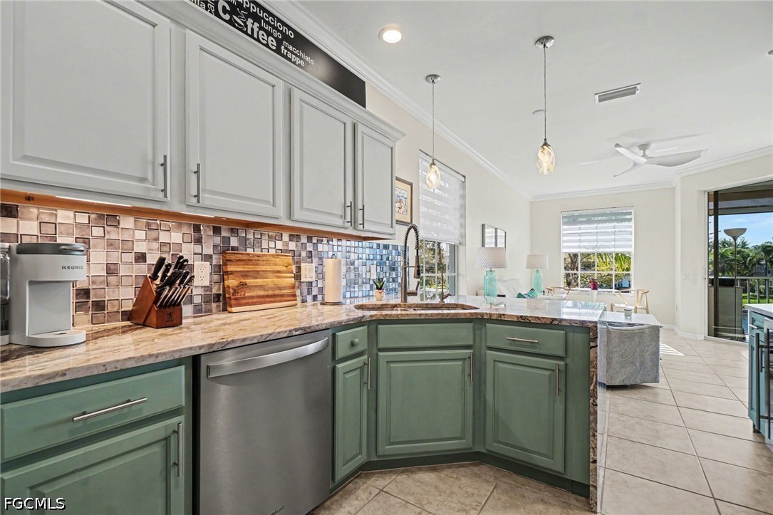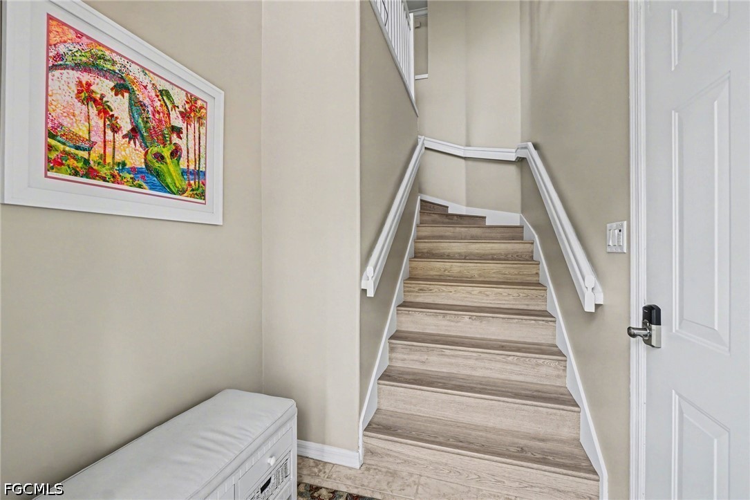 The finest attention to detail has been paid in this stunning remodel. As you enter the home via your private entrance, you will notice the luxury vinyl plank flooring on the oversized staircase. The beautifully appointed living room leads straight to the screened lanai via telescoping triple sliding doors and overlooks a sparkling lagoon with fountain where you can enjoy the spectacular sunrises. A formal dining space is adjacent to the remodeled kitchen with all the bells and whistles. Stainless steel appliances, a beverage cooler, waterfall granite countertops, glass tile backsplash, recessed lighting and custom cabinetry. Truly a chef's delight! A separate sitting area off the kitchen overlooks the water and includes an electric fire place for ambiance.