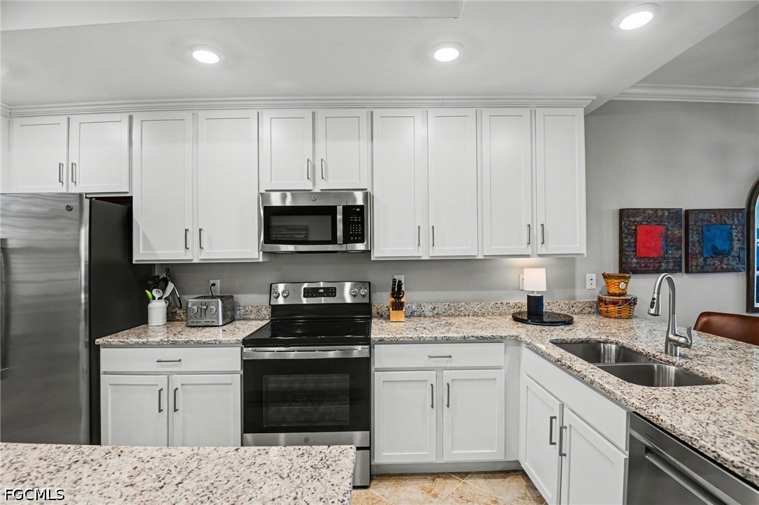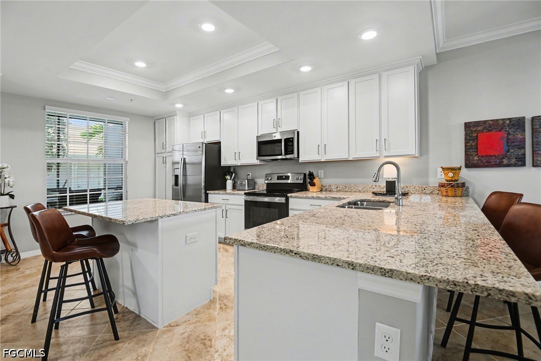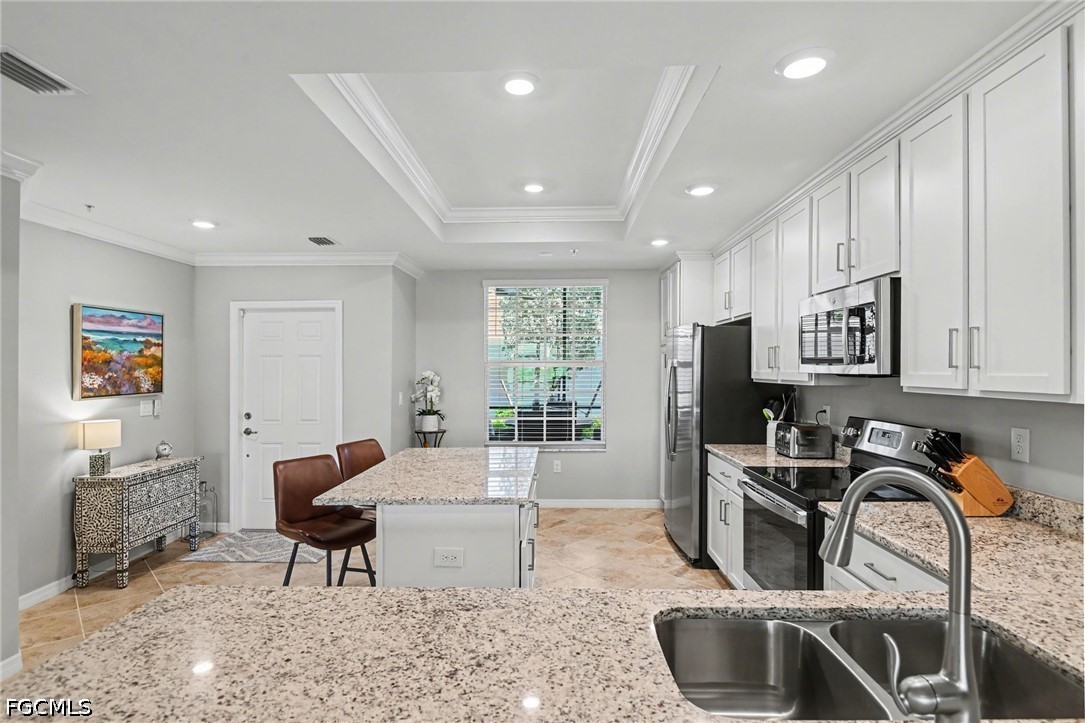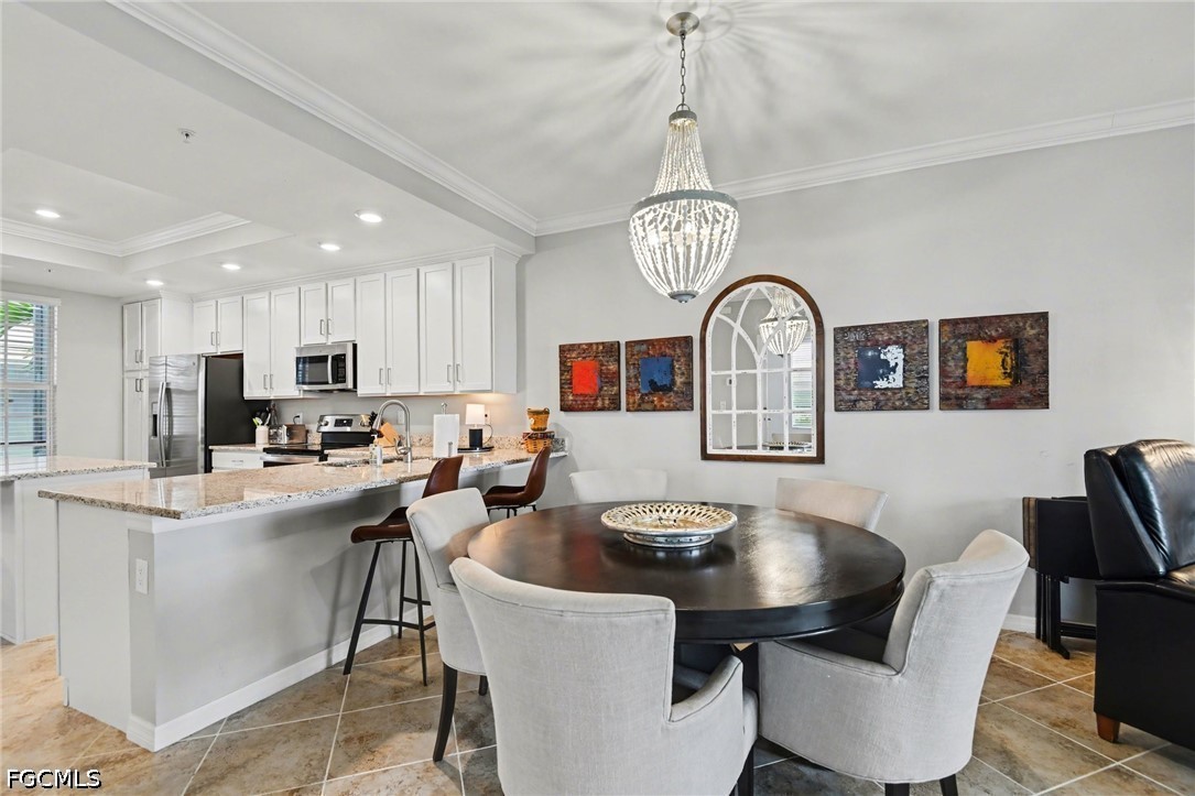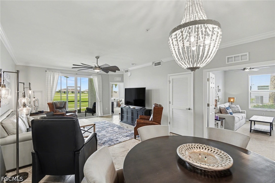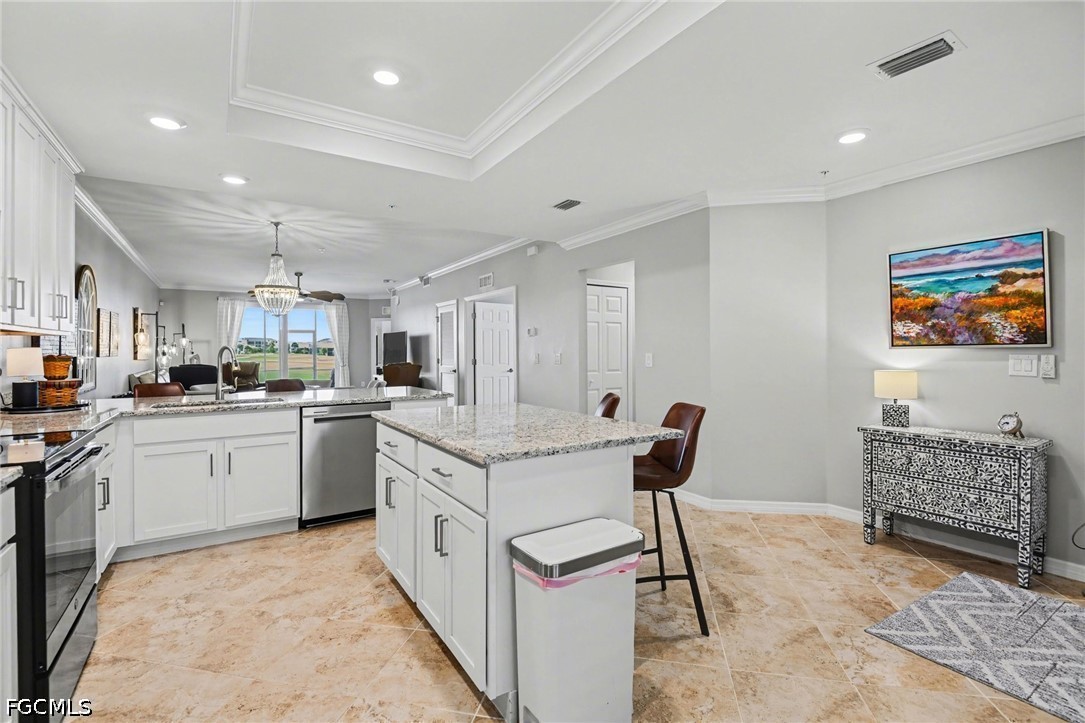 The kitchen offers a center island with seating and a breakfast bar for casual dining, beautiful granite counters, stainless appliances, plenty of cabinet space, and a newer dishwasher. Recessed lighting and a tray ceiling add a designer touch. The dining area easily accommodates a full dining set and flows into the living room with designer lighting. Sliding doors open from both sides to the golf-front screened lanai with ceiling fan and light.