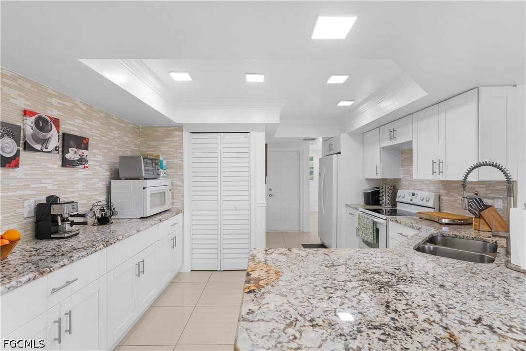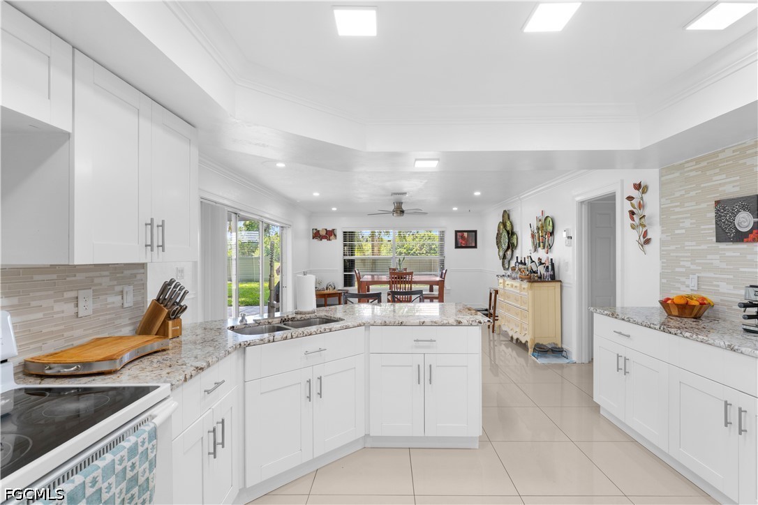 The kitchen boasts updated granite countertops, sinks, and faucets, while bathrooms have been refreshed with new vanities, fixtures, and showers. Additional upgrades include a new garage door and shutters on all windows for added protection and curb appeal.