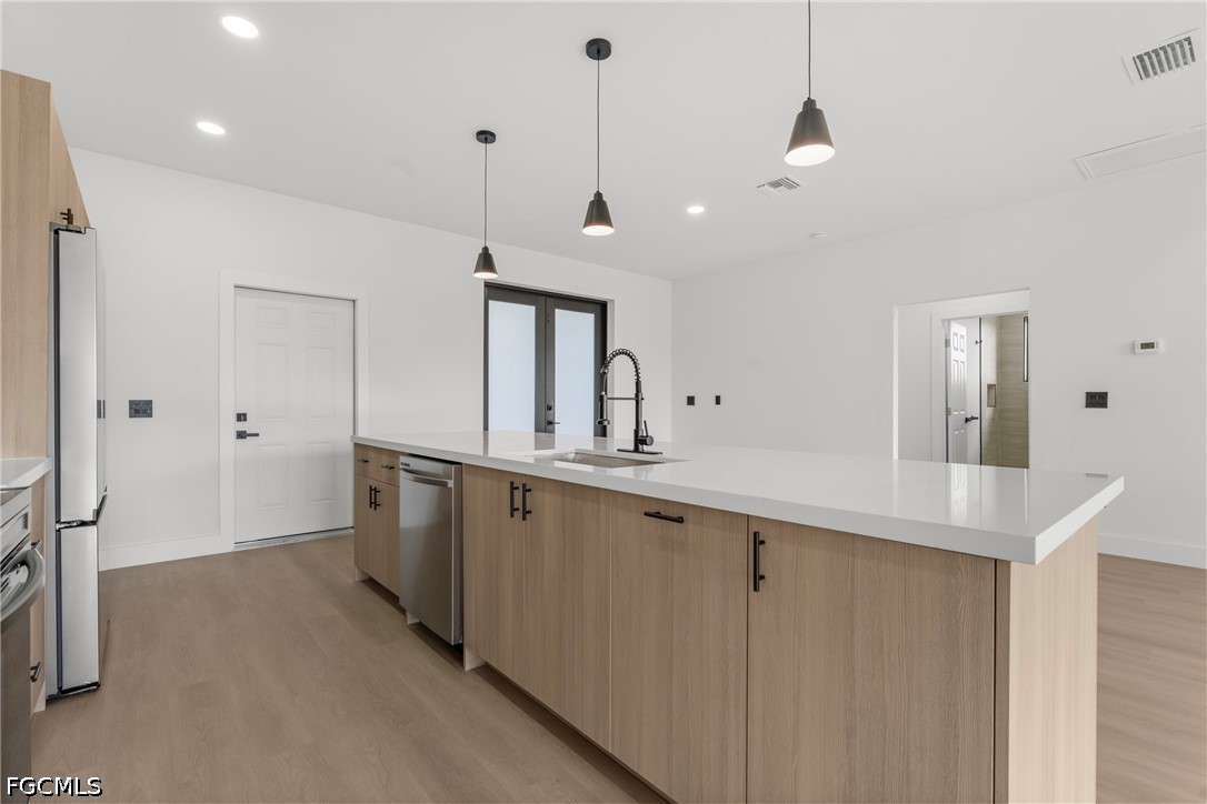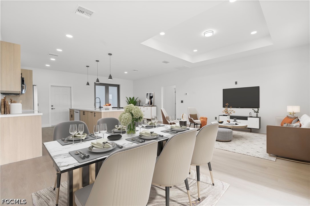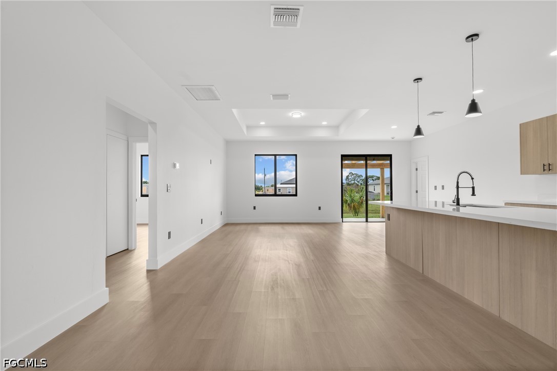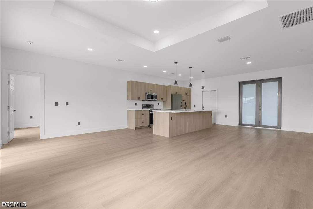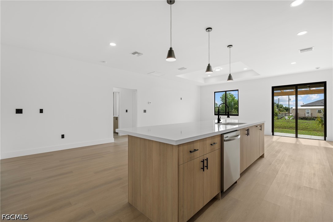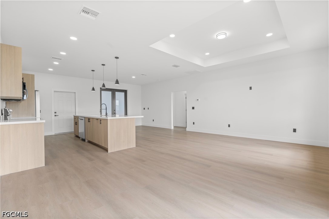 Inside, you’ll find laminate flooring throughout, tray ceilings in the living room, and a bright open layout centered around a spacious kitchen island. The kitchen is equipped with quartz countertops, real wood soft-close cabinetry, and stainless-steel appliances.