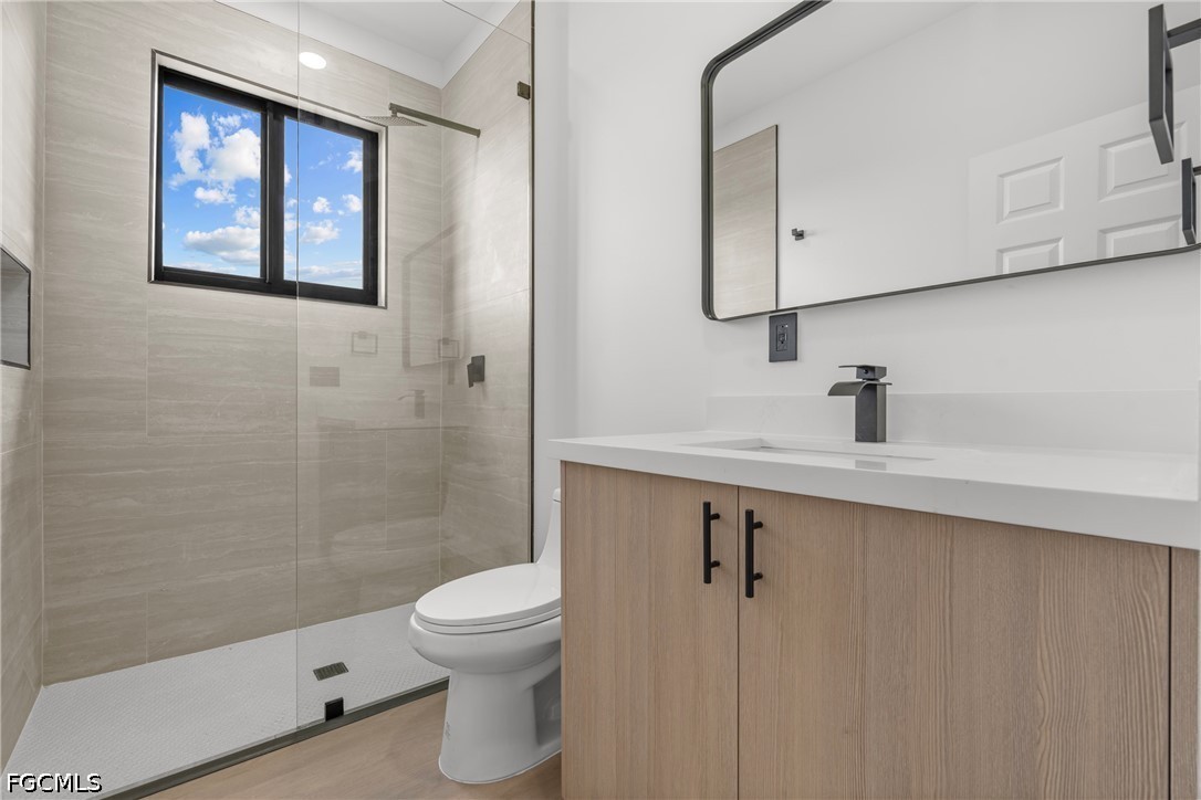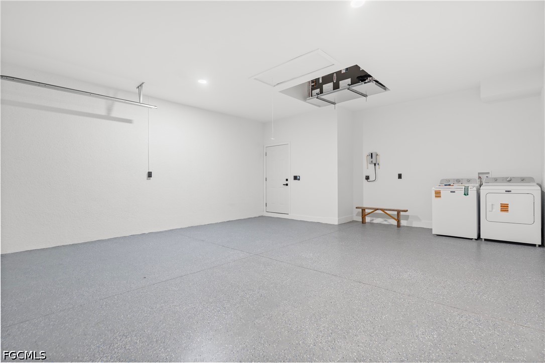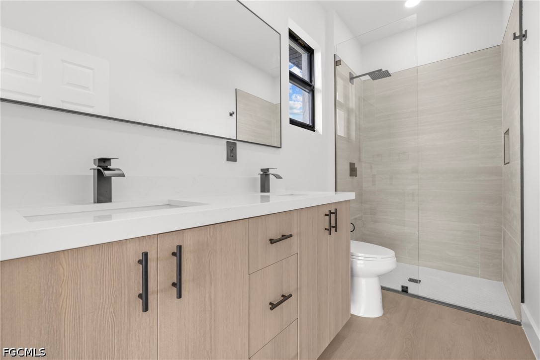 The primary suite includes a large custom walk-in closet and a well-appointed bathroom with dual vanities. The guest bathroom features a sleek walk-in shower with glass doors. Additional highlights include Impact Windows and Doors, Washer and Dryer included, and a 2-Car Garage with Epoxy Flooring.