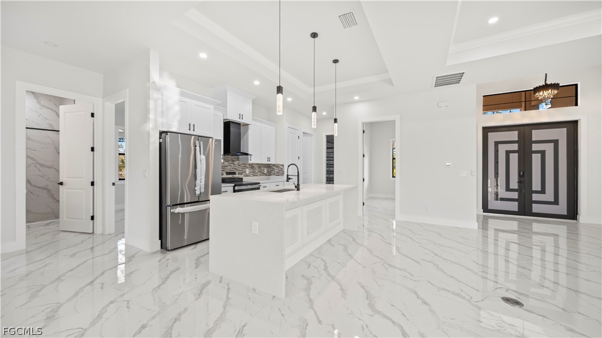 The home’s contemporary curb appeal features a neutral beige facade with modern trim, complemented by an inviting covered entryway and impressive 8-foot French doors. A brick-paved driveway leads to the two-car garage, which features a dark bronze door. Surrounded by fresh landscaping and lush greenery, this meticulously maintained lot offers ample outdoor space for future customizations or leisure activities. This house comes with a quartz countertop, gutter lights, and a complete set of GE APPLIANCES INCLUDING WASHER AND DRYER, COVERED WITH A 2-YEAR HOME WARRANTY.