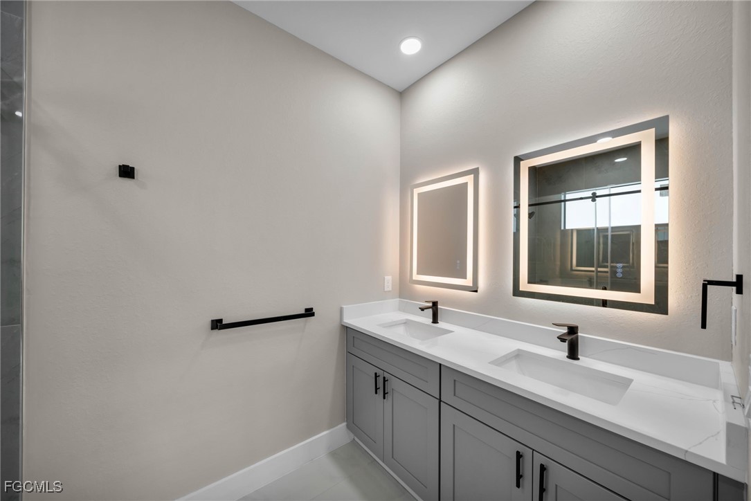 Introducing a stunning example of contemporary luxury living: this beautiful new construction boasts a modern aesthetic that is both chic and functional. Step into the spacious kitchen, featuring a sleek L island with samsung bespoke stainless steel appliances and touch screen samsung fridge and quartz countertops, perfect for cooking and entertaining. European-style kitchen cabinets provide ample storage, complementing the clean, minimalist look. Throughout the home, porcelain tile flooring adds elegance and durability. In the bathrooms, LED light mirrors combine style with practicality for a truly indulgent experience. With four bedrooms and two and a half bathrooms, including a master suite with his and hers walk-in closet and double sink and an elegant walk-in shower, comfort and luxury abound. From the floating modern vanities to the European style closet doors, every detail has been carefully curated for modern living at its finest. And with an extended lanai and sleek finishes, calling this paradise is an understatement. Automated water irrigation for grass included. Pictures are a model.