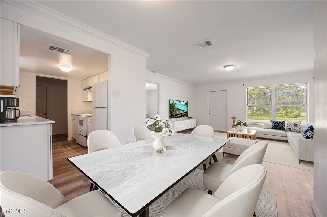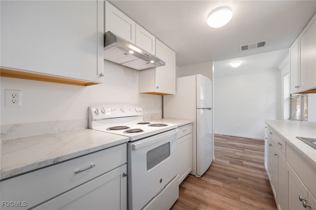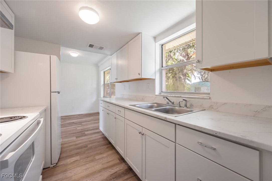 Inside, you’ll find wood-like luxury vinyl plank flooring throughout, a modern white kitchen with granite countertops, and matching white appliances. The bathroom has been fully updated with a new vanity, stylish fixtures, and beautiful tiled shower walls. A new metal roof, installed in 2020, provides peace of mind and long-term durability.