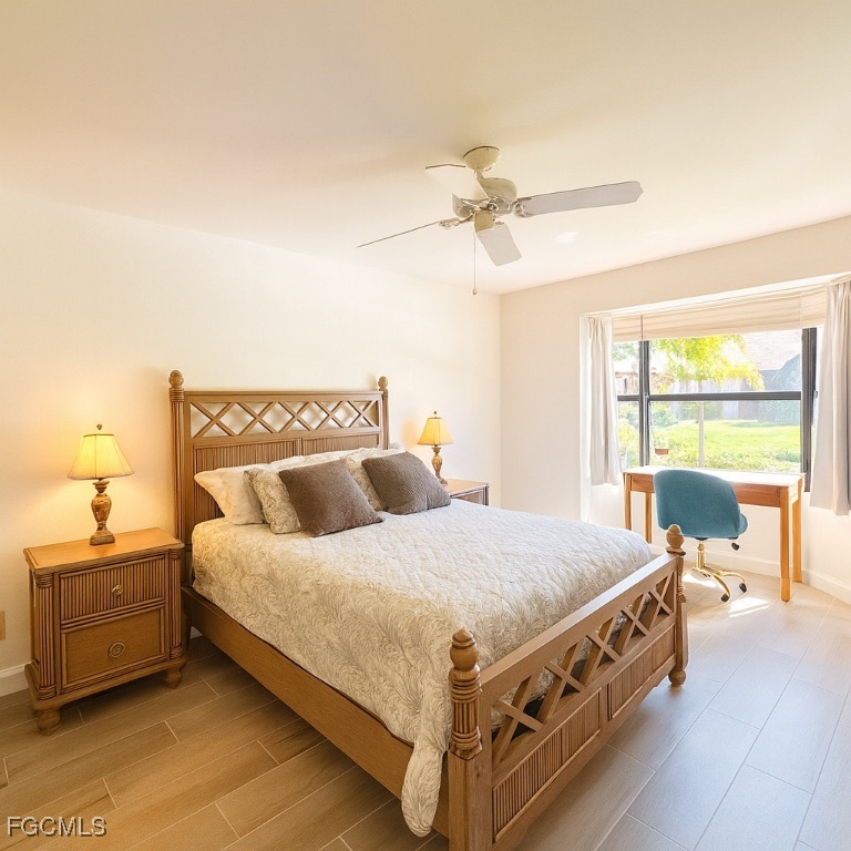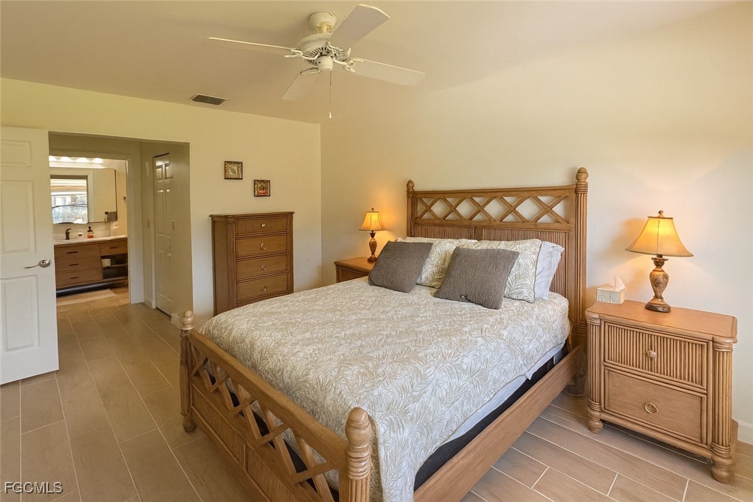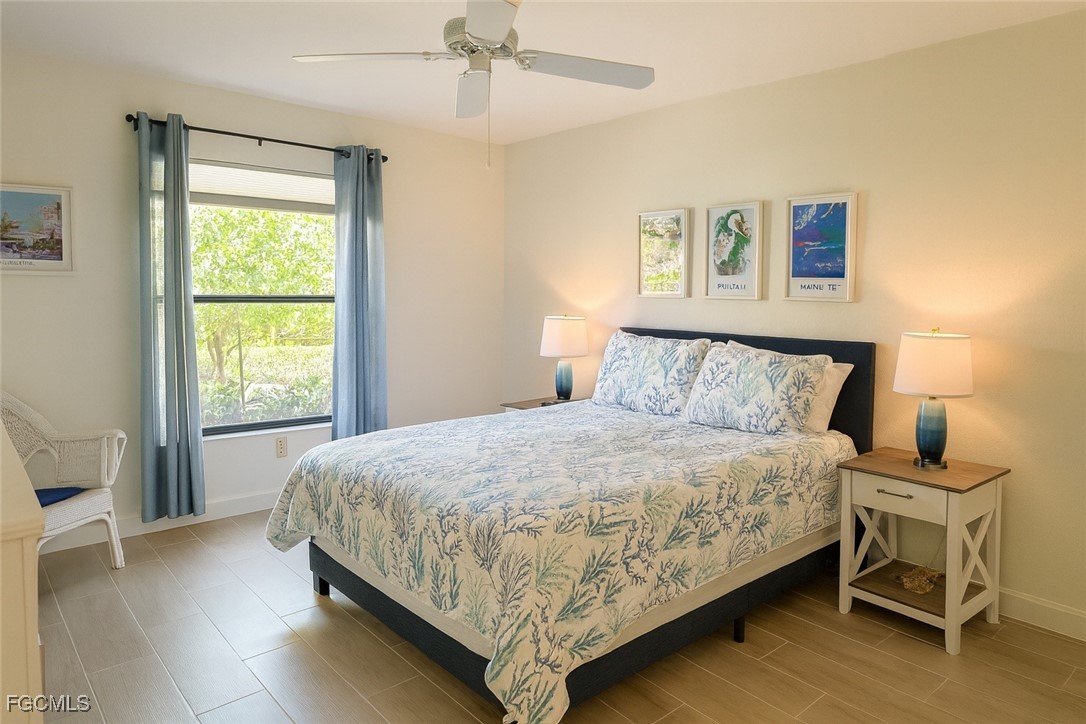 The primary suite offers a peaceful retreat with a large window overlooking lush greenery, warm natural light, and a spacious en-suite bath featuring a modern vanity and tiled walk-in shower. The guest bedroom is equally inviting, ideal for visitors or a home office setup.