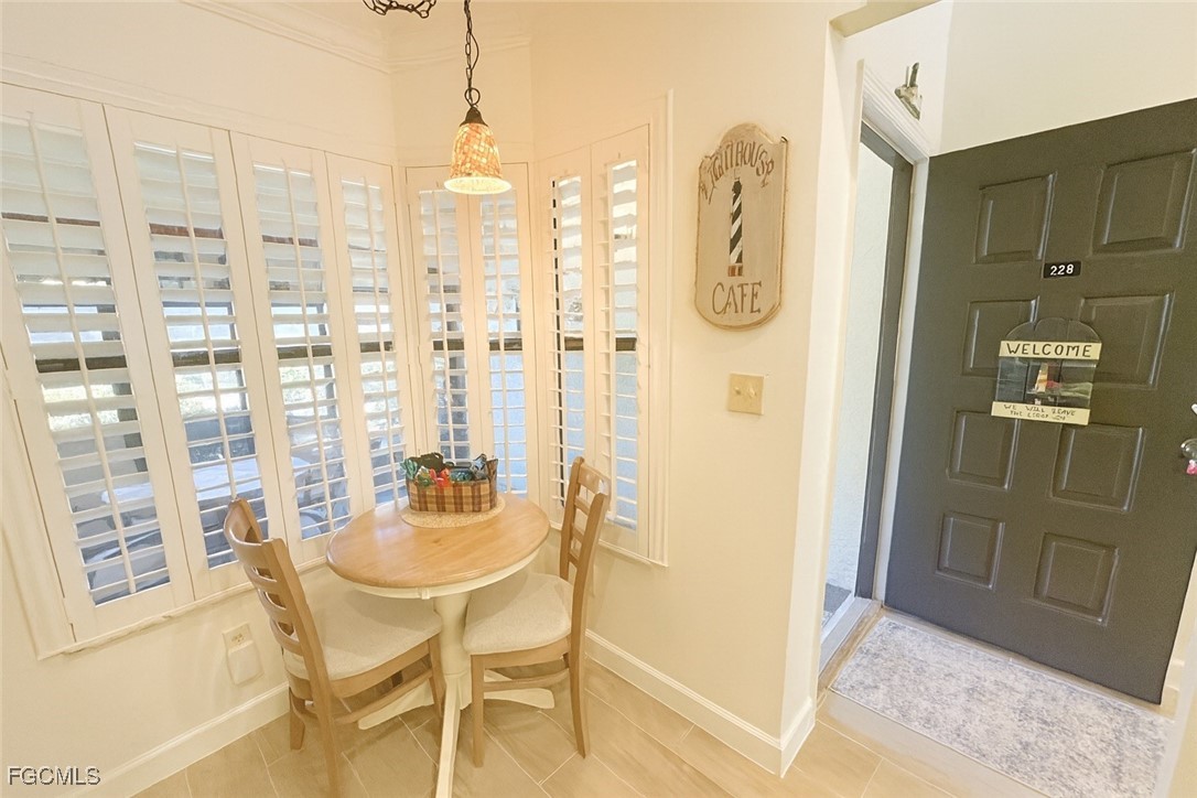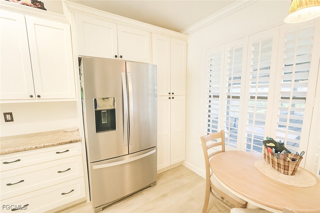 The kitchen is a standout, with shaker-style cabinetry, stainless steel appliances, granite countertops, and generous storage. A cozy breakfast nook surrounded by plantation shutters provides the perfect spot to enjoy morning coffee.