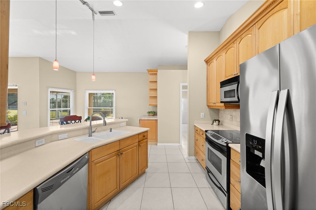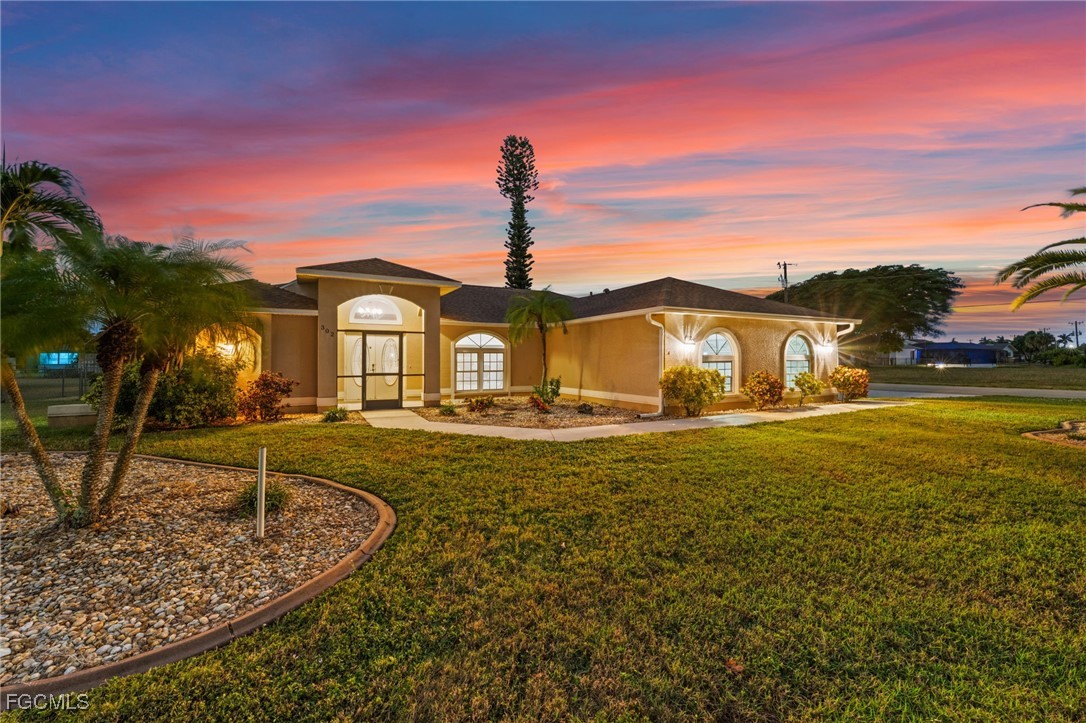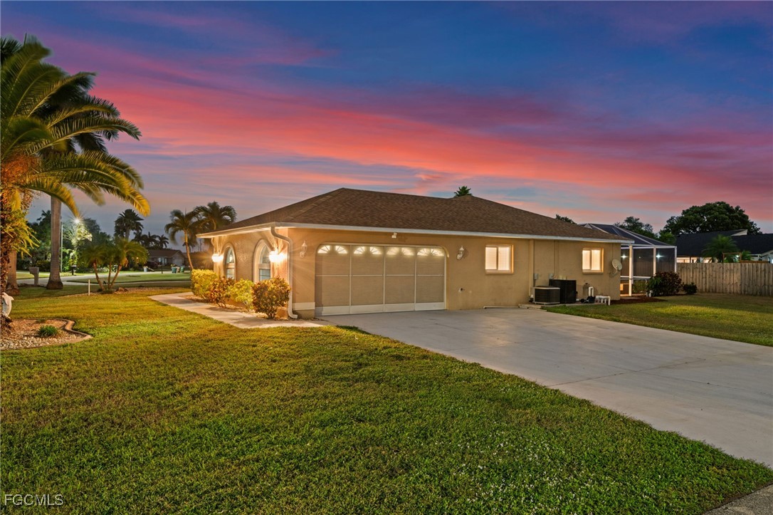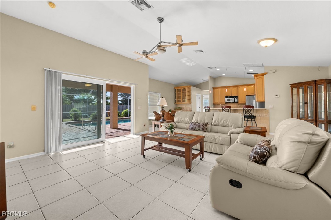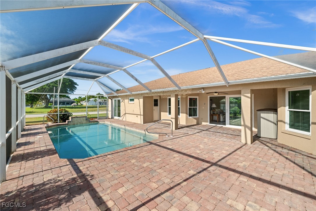 WHEELCHAIR ACCESSIBLE POOL HOME ON A CORNER LOT! Welcome to this thoughtfully designed Cape Coral home offering comfort, accessibility, and Florida lifestyle living. This 3-bedroom, 2-bath residence sits on an oversized lot of more than .25 acre and features a spacious open layout with vaulted ceilings. The kitchen includes stainless steel appliances, a breakfast bar, crown molding, a tile backsplash, and a coffee bar with a beverage fridge. The living area opens through impact sliding doors to a large screened lanai and inviting pool surrounded by pavers, perfect for entertaining or relaxing outdoors.