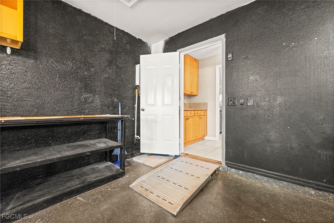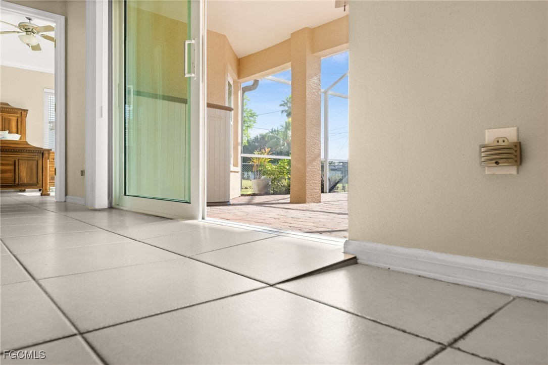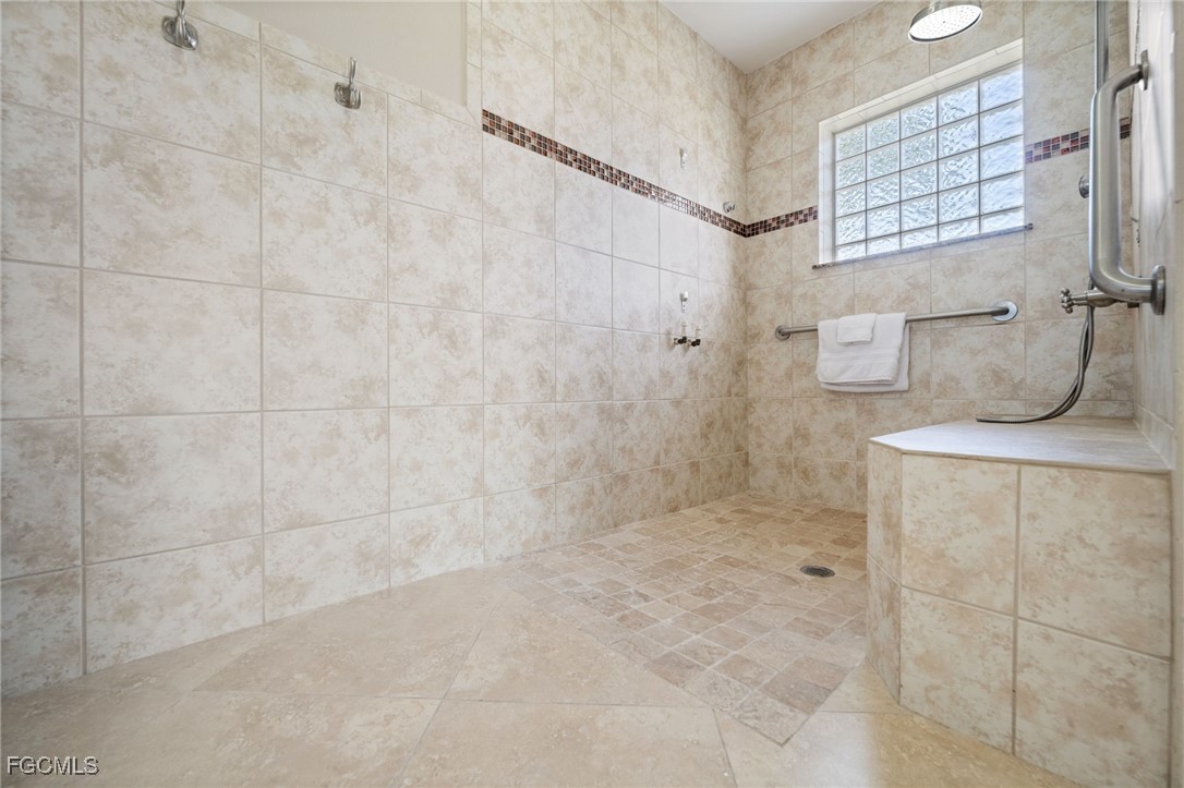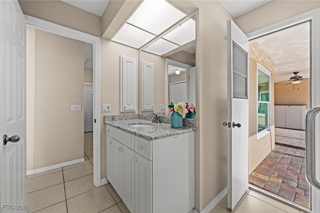 This home has been designed with accessibility in mind, featuring a ramp from the garage to the home, tiled ramps to the lanai and pool area, and a fully tiled roll-in shower with built-in bench and grab bars in the primary suite. The primary bath also includes dual sinks, a linen closet, and a private toilet room. The spacious primary bedroom offers high ceilings, a bay window sitting area, and dual closets. The second bedroom opens directly to the pool, while the guest bath offers pool access for convenience. Additional features include a tankless water heater, tile flooring throughout, inside laundry room, and an oversized 2-car garage. This home is storm-ready, with IMPACT WINDOWS AND SLIDERS THROUGHOUT. This home has NEVER FLOODED IN ANY STORM.