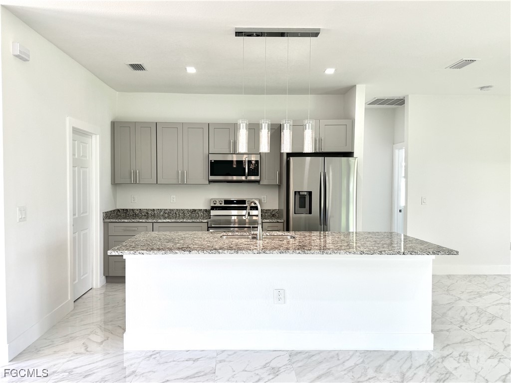 This three bed + den, three bath is not just a place to call home but a perfect way to position yourself for a future sale. The 2024 home is located across the street of properties on the canal, increasing the value of the property. The three bedroom home comes with an additional room that could serve as a home office, media room, den, etc. The vaulted ceilings and modern kitchen open to the living areas, giving the house a greater sense of space, visual continuity, and light. The kitchen is equipped with a wine cooler and adorned with granite counters, stainless steel appliances, and an island, perfect for guests. The backyard is spacious enough for a pool and is already equipped with an open lanai. As far as location, the house is located in the coveted area of SW Cape Coral, minutes away from shopping and dining. Whatever your need whether family, business investment, or both this lovely new home is a must see!