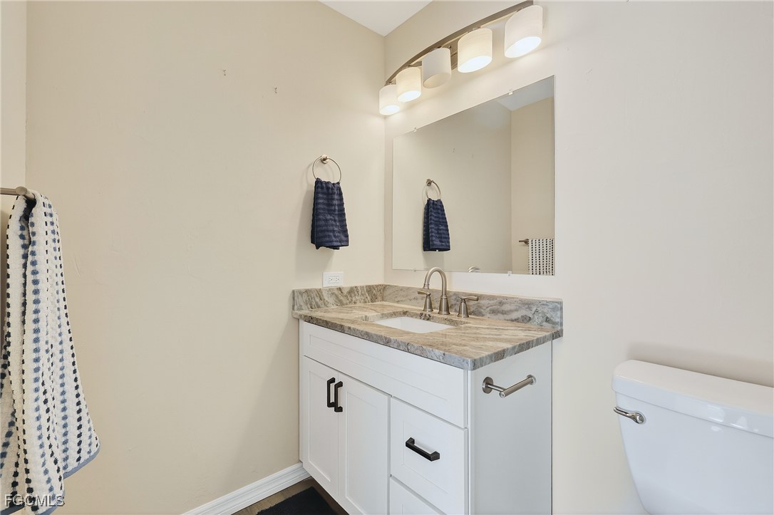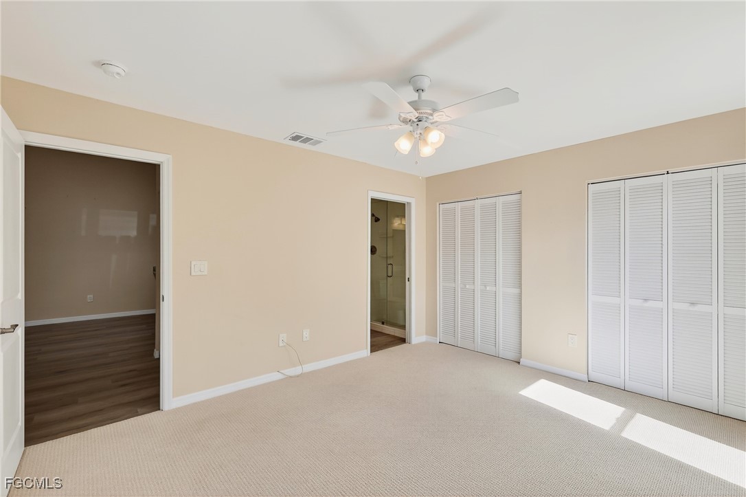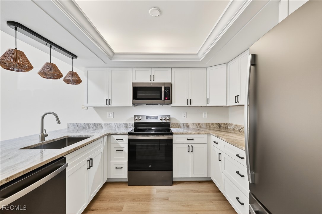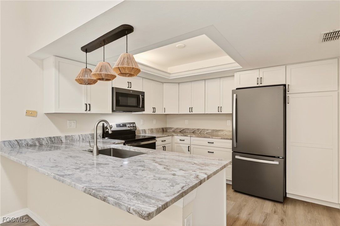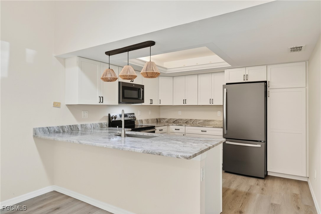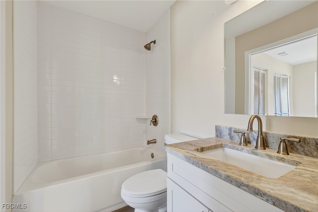 The stunning kitchen showcases custom white shaker cabinetry, Calacatta quartz countertops, stainless appliances, and abundant counter space — perfect for everyday living or entertaining. Both bedrooms feature en-suite baths highlighted by modern vanities and custom tiled showers. Elegant wood-look tile flooring runs throughout, offering both beauty and easy maintenance. Relax and unwind on your large screened lanai— ideal for soaking up the Florida warmth.. Foxmoor Lakes has GULF ACCESS via the Caloosahatchee River, where dock spaces may be available for lease. Residents enjoy three pools, tennis and pickleball, a clubhouse, and more. Conveniently located near I-75, shopping, dining, and entertainment — this move-in ready villa delivers the very best of Florida living!