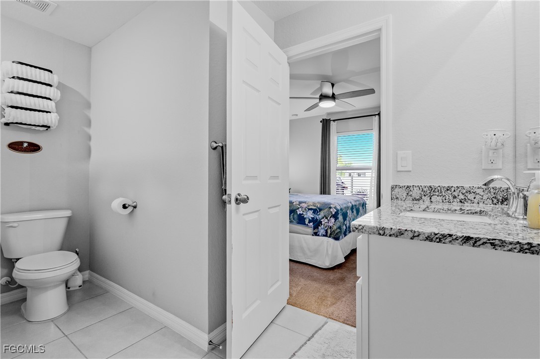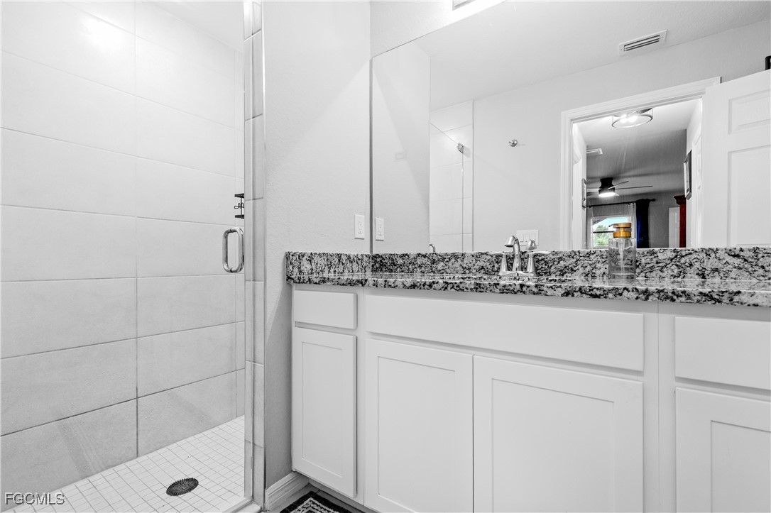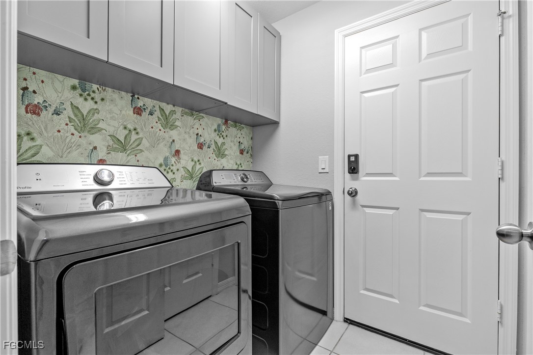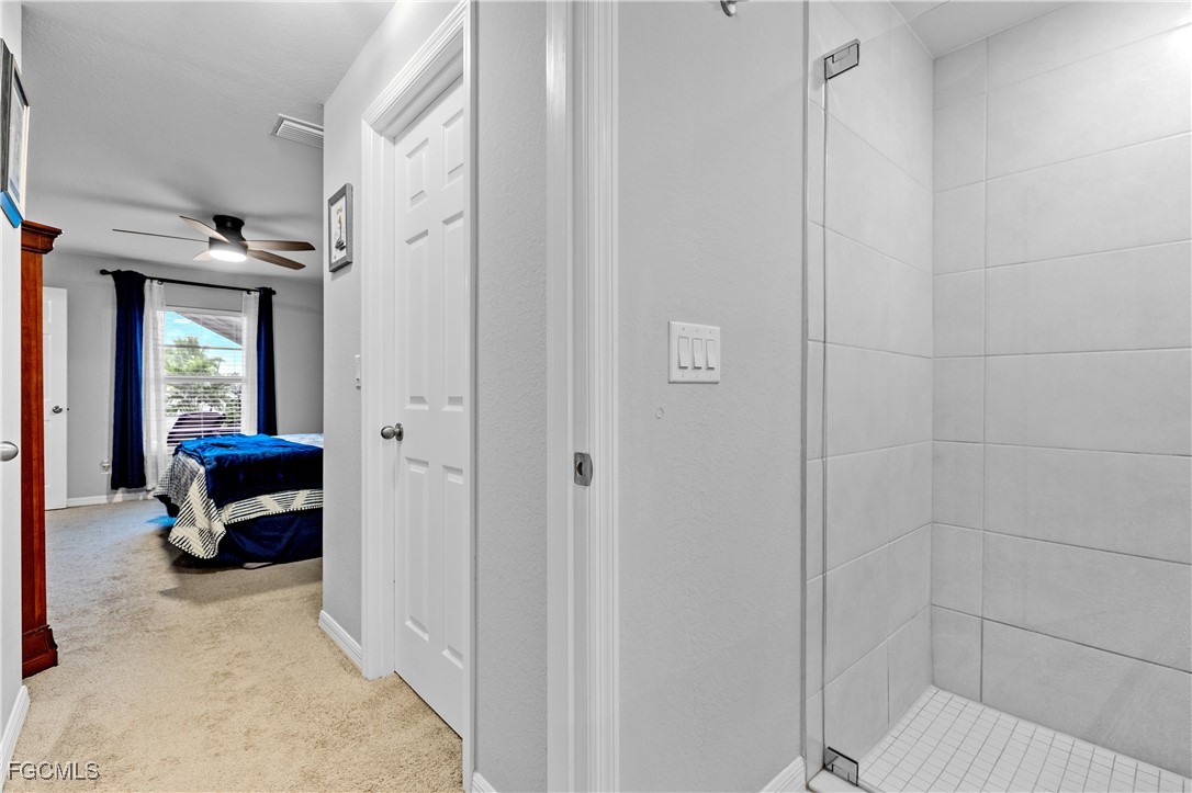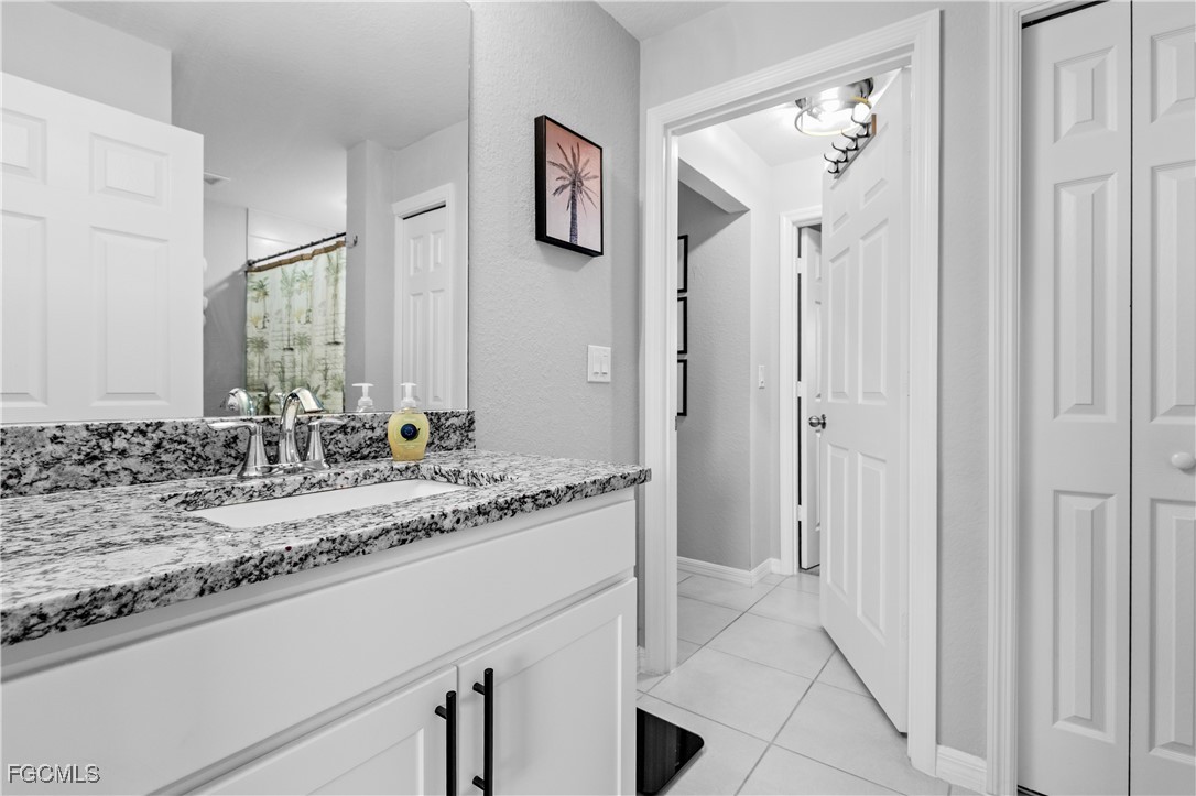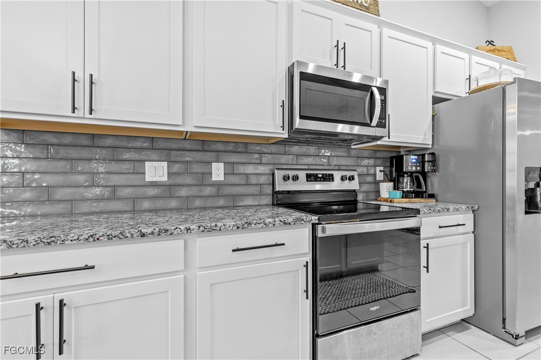 Inside, you’ll find granite countertops in the kitchen and baths, 36” upper cabinets with soft-close doors, stainless steel appliances, and tile flooring throughout the main living areas. The home includes PGT Low-E insulated impact windows, upgraded ceiling fans, custom blinds, custom shutter for the front door and slider, and elegant window treatments.