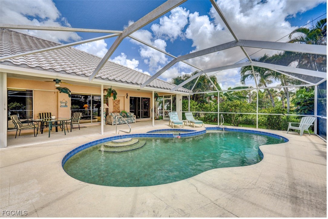 Discover effortless Florida living in this beautifully maintained, fully furnished home located in the heart of Southeast Cape Coral, just minutes from popular shops, restaurants, and everyday conveniences. Step inside to a bright, open floor plan featuring a cozy breakfast nook, perfect for morning coffee overlooking the sparkling pool and spa. The home is designed for comfort and peace of mind, offering full hurricane protection with impact windows and large set-up shutters, and a new tile roof installed in 2022/2023.