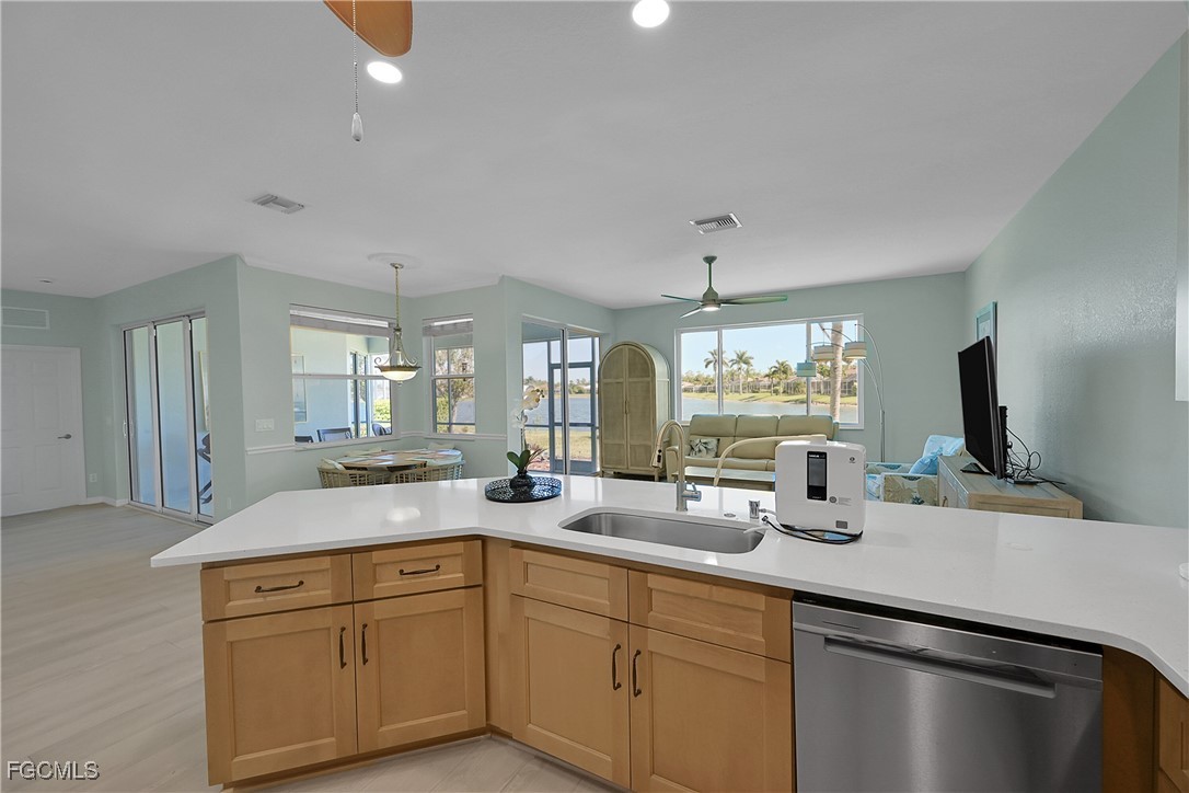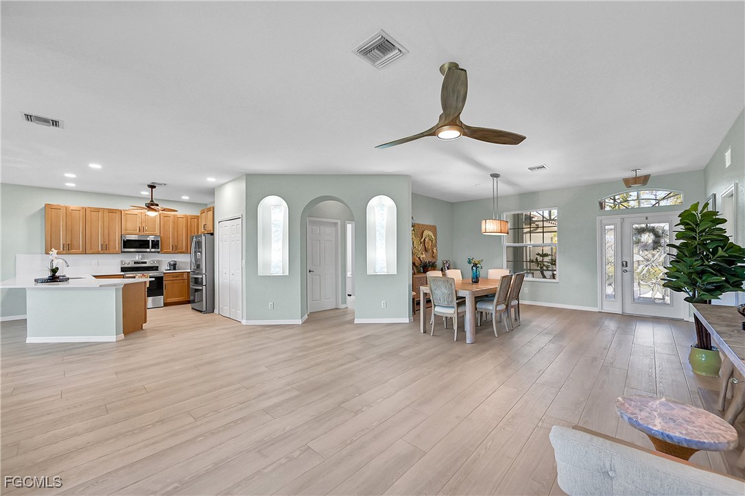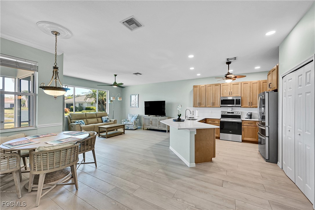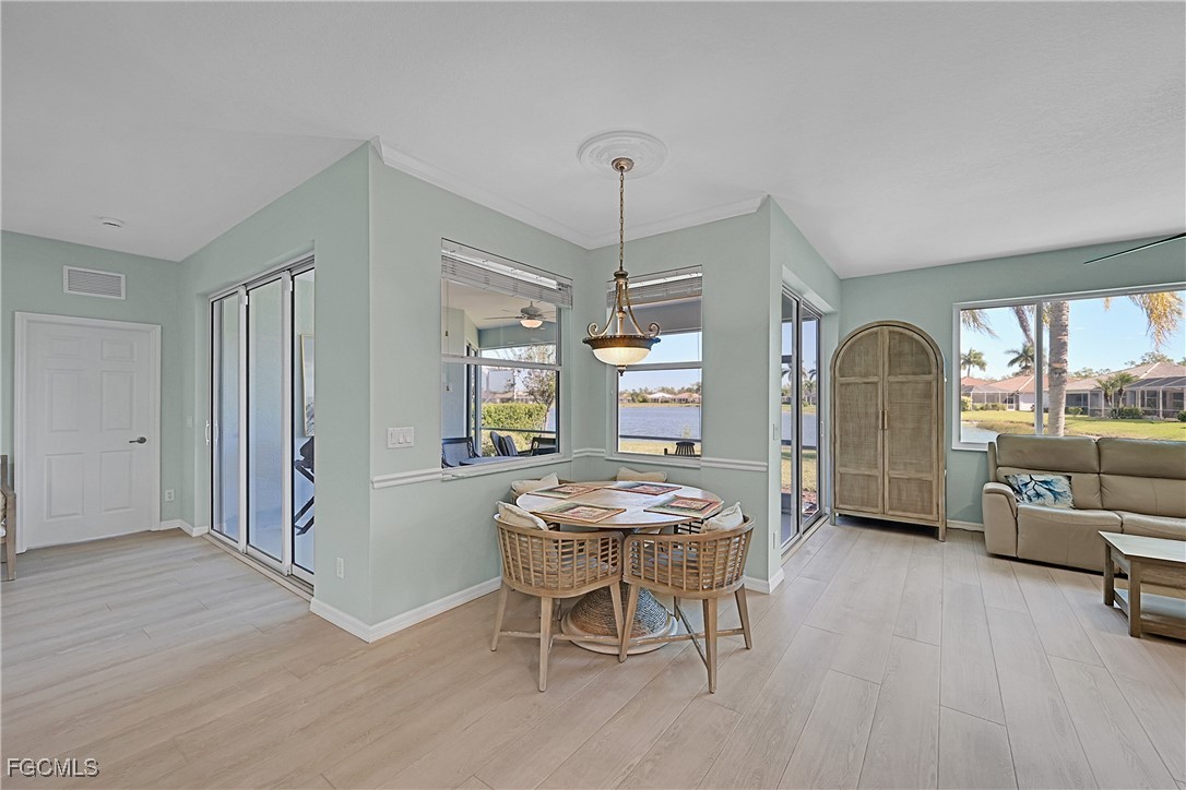 Nestled in the prestigious gated Herons Glen Golf & Country Club community, the Eagle Model is a beautifully updated 3-bedroom, 3-bath home with 2,133 square feet of living space, offering serene lake views and a refined Florida lifestyle. Highlights include a freshly painted coastal interior, brand-new impact-resistant hurricane windows and front glass doors, stylish new flooring, and fully renovated kitchen and baths with sleek finishes. The home features new stainless steel appliances with extended warranty and a recently replaced tile roof built to last. A standout feature is the screened-in lanai, which transforms into an air-conditioned Florida room with remote-controlled roll-down hurricane screens. The split-bedroom layout ensures privacy, while the expansive great room, screened lanai/ Florida room, and dining area provide ideal spaces for relaxation and entertaining. Residents enjoy access to resort-style amenities such as an 18-hole golf course, clubhouse, heated pool and spa, fitness center, tennis, pickleball, and more—all within a secure, vibrant community.