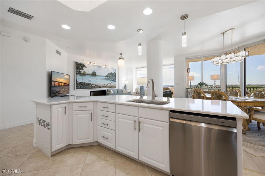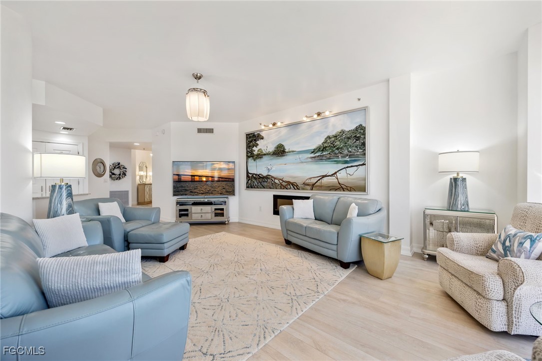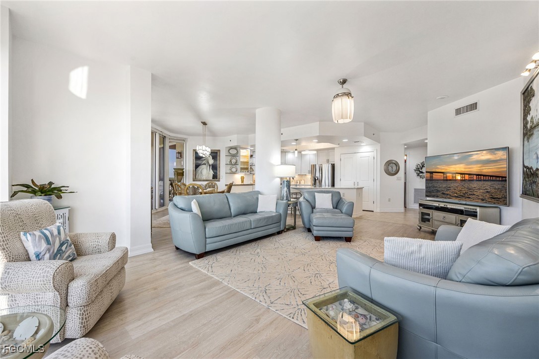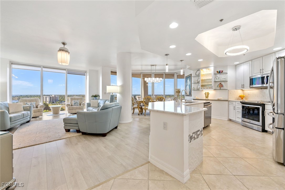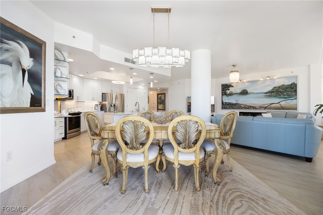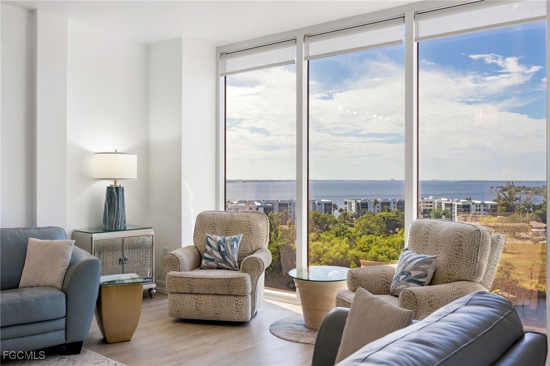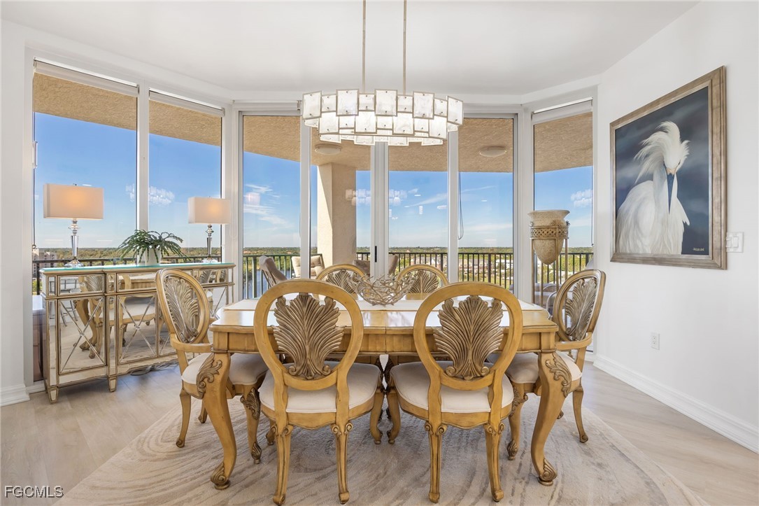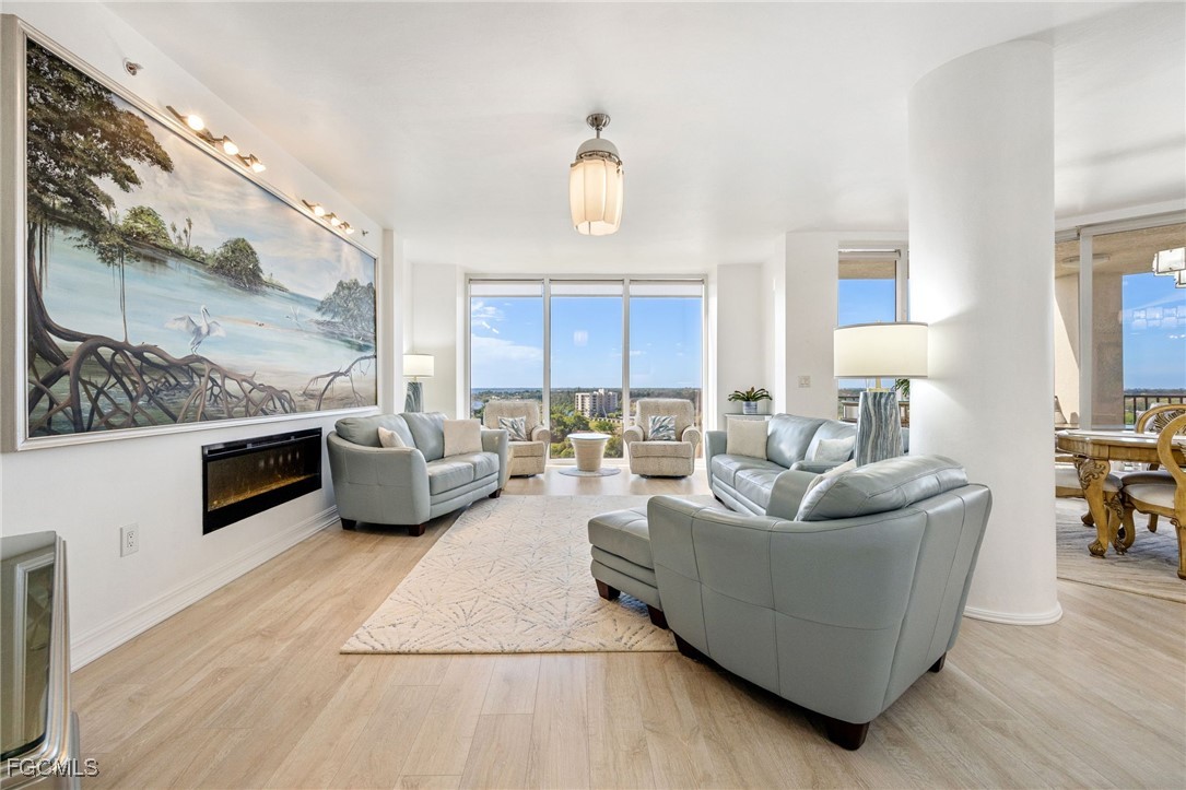 The open-concept living and dining area is surrounded by floor-to-ceiling tinted impact windows, bathing the space in natural light while showcasing unobstructed views of the Caloosahatchee River. The electric recessed fireplace, custom blinds, and elegant fixtures add to the inviting yet refined atmosphere.