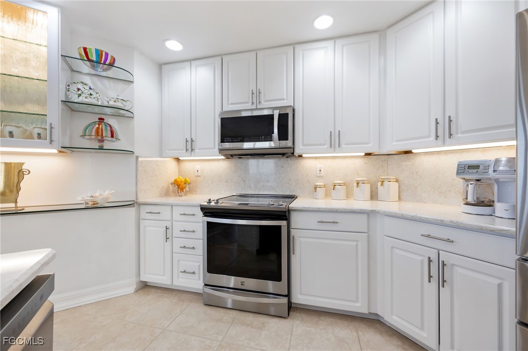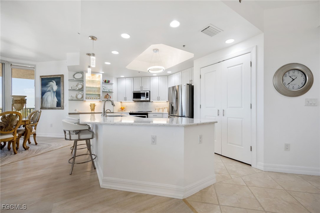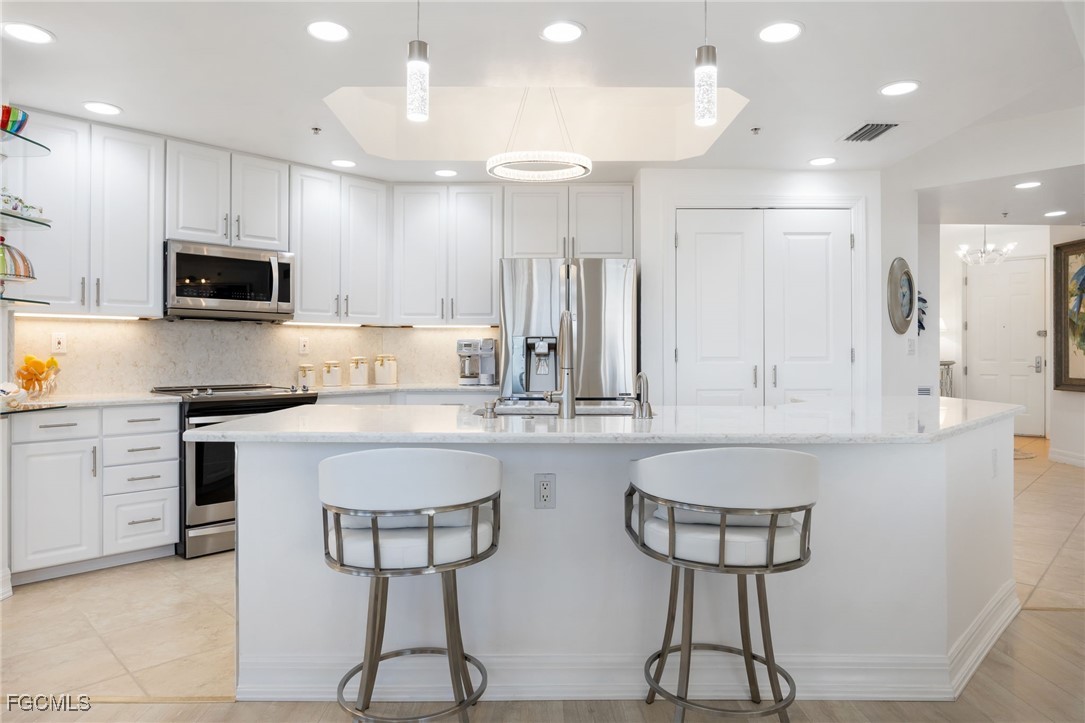 The gourmet kitchen is a centerpiece of style and functionality, featuring quartz countertops, 42-inch soft-close cabinetry with pull-out drawers, tempered glass shelving, stainless-steel appliances, designer tile accents, and an on-demand filtered hot water system—perfect for tea, coffee, or cooking convenience. A double-wide pantry and ambient lighting complete the kitchen’s sleek, modern aesthetic.