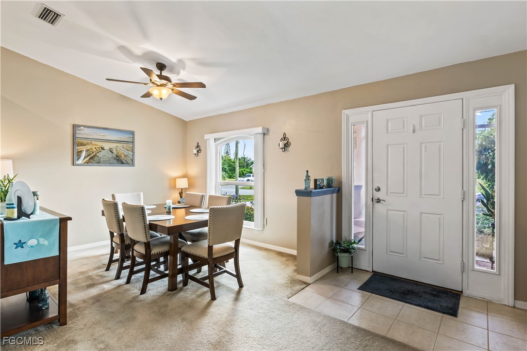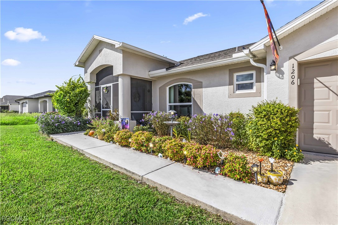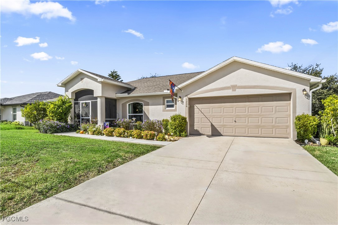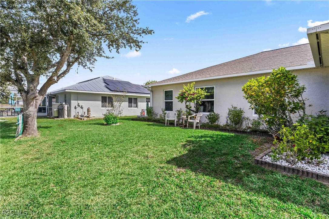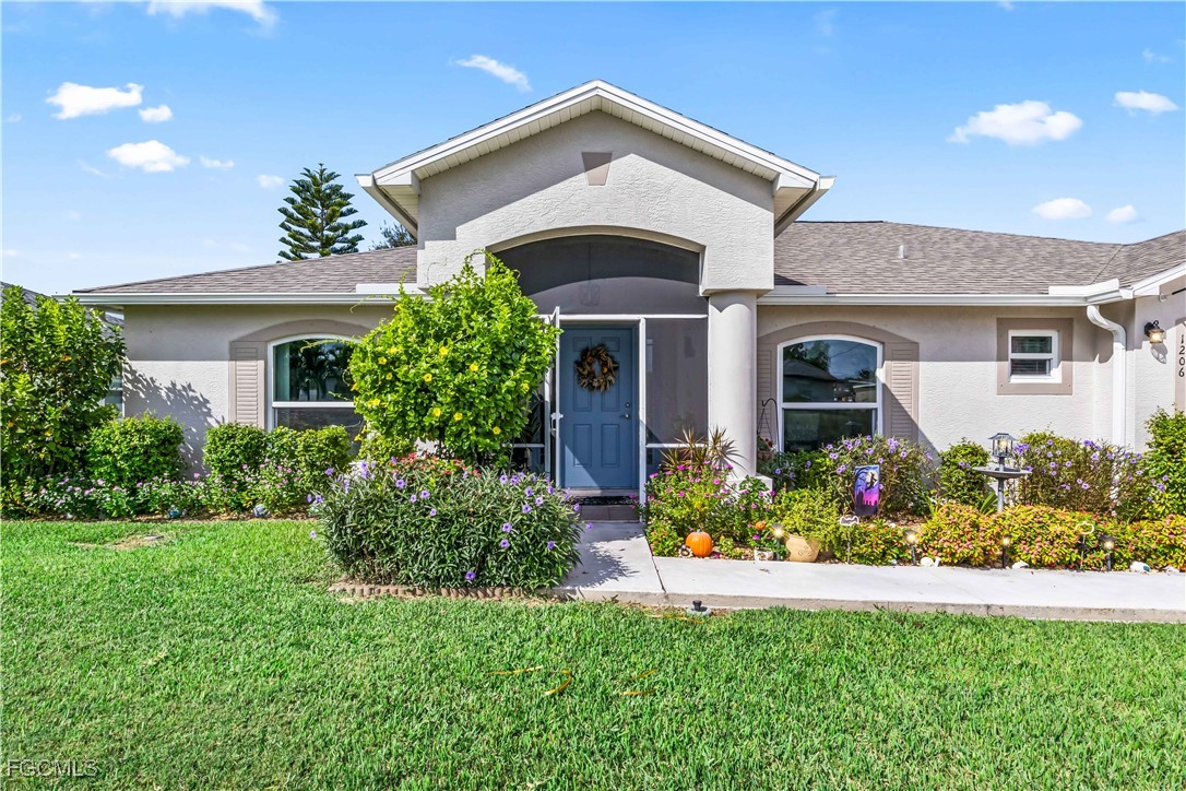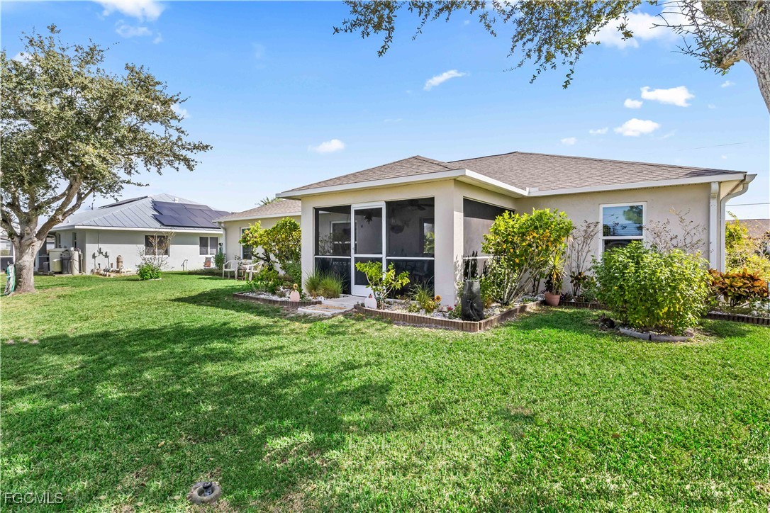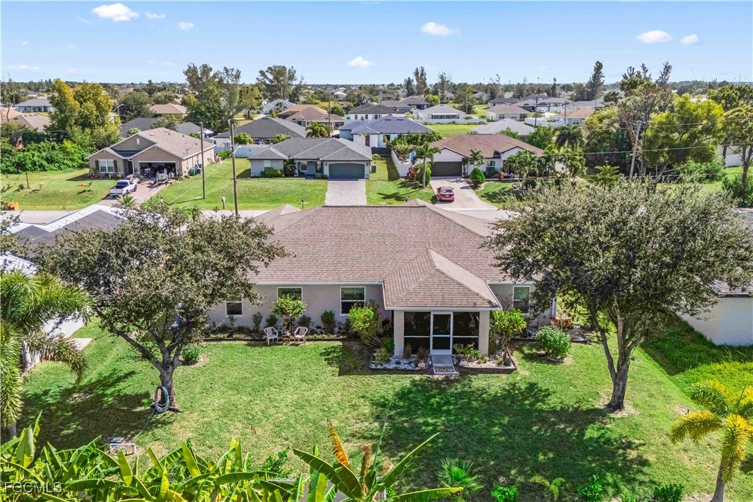 Great 3/2/2 home in NW Cape Coral and Not in a Flood Zone! Enter through the screened front porch area to the open floor plan. Home features a formal dining room, living room, great room plus eatin kitchen. The primary bedroom has a walk in closet and the bath has double sinks and separate soaking tub and shower. Updates include Hurricane windows (2020), New roof (2022) washer/dryer 1 year old, upgraded kitchen counters, and gutters. Very nicely landscaped in the front and the back. Sit out back in your screened lanai and enjoy all the greenery. Close to Coral Oaks Colf course, a new linear trail and the Pine Island Corridor that has plenty of shopping and restaurants. Call today to schedule your showing.