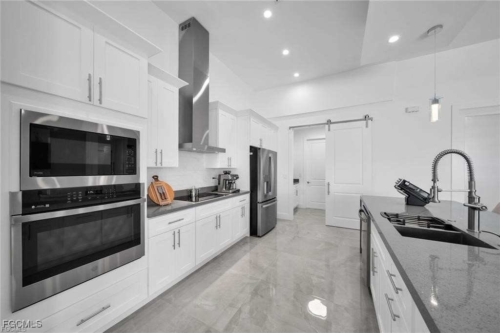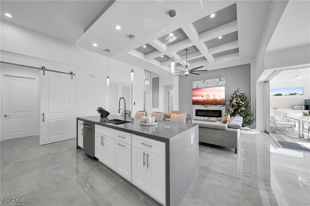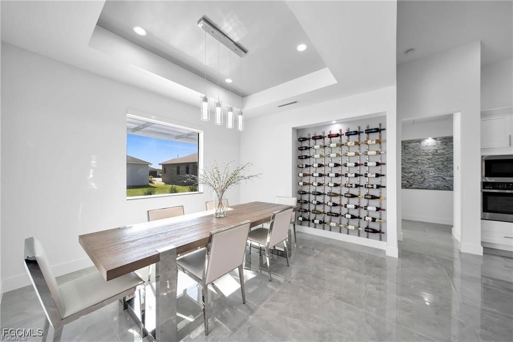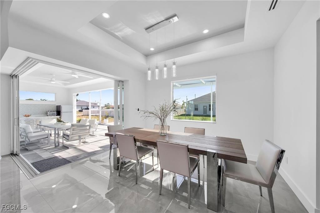 EXTRAORDINARY AND CONTEMPORARY HOME ! near a Golf Course. NO HOA , FLOOD INSURANCE IS NOT REQUIRED. Connected to city water, sewer and irrigation. This house is conveniently located off the newly widen Burnt Store Road and Embers Parkway, near Publix, Walgreens and restaurants, one of the fastest growing areas of the Cape. Open floor plan featuring 3 large bedrooms plus den and 3 beautifully designed bathrooms with upgraded tile, glass shower doors and custom cabinetry. Spacious living room opens to the kitchen and dining area. Kitchen features modern stainless steel appliances. Quartz counter tops throughout the kitchen including a waterfall countertop island, bathroom, laundry and window sills. Impact glass windows and doors throughout. Wood cabinetry and 32”x32” porcelain tile used throughout the house. Master bedroom includes his and hers walk in closets with wooden shelves in all of the closets. Living area, dining room, master bedroom, and lanai all feature captivating tray ceilings. Metal roof, insulated garage doors and LED light all around to save energy. Gorgeous lighting fixture package. Exterior soffit lighting located in the front and back of the house. Electric garage door opener, garage floor painted with epoxy. Pavers on driveway, walkway, lanai. Plenty of room for pool!