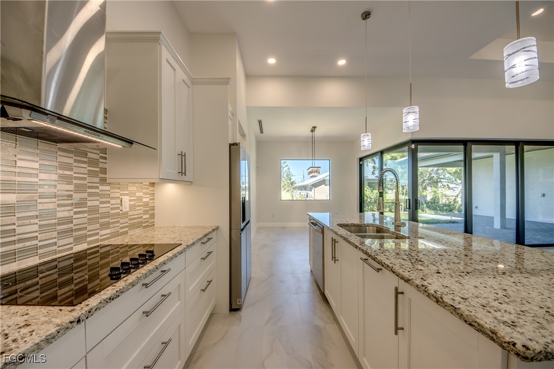 NEW CUSTOM CONSTRUCTION HOME with UPSCALE FEATURES . . . Experience luxury living in this stunning 4-bedroom, 3-bathroom home with a 3-car garage. From the moment you arrive, the grand 9’ high arched iron entry doors set the tone for elegance and quality. Inside, state-of-the-art lighting highlights the soaring 12’ ceilings in the open living area, enhanced by a tray ceiling. The dining and bedrooms feature 10’ ceilings with tray details, while 8’ solid wood doors and 90-degree sliding glass doors seamlessly connect indoor and outdoor spaces. Single-hung windows add timeless charm. Envision the inviting ambiance of the great room, where a stunning stacked-stone entertainment wall, adorned with backlit niches, beautifully frames the electric fireplace. The modern kitchen is a chef’s dream, featuring soft-close white wood cabinetry, granite countertops, and stainless-steel appliances, including a combo wall oven/microwave and glass cooktop. The spacious kitchen island, with its stylish pendant lighting, houses the sink and dishwasher, providing ample seating and a perfect spot for entertaining. A designated area above the wine chiller is ideal for a coffee or wine bar, while the glass-front cabinets beautifully display your finest glassware. Retreat to the private owner’s suite, where sliding glass doors offer outdoor access, and a stunning wood & glass barn door leads to the spa-like ensuite. Indulge in the freestanding soaking tub and walk-through shower with glass doors. The ensuite also features multiple shower heads, dual sinks, and a backlit mirror, plus a linen closet and two spacious walk-in closets with built-ins. The guest ensuite includes a private vanity and a glass-enclosed shower. The guest bath features dual vanities, a glass-enclosed shower, and exterior access. The laundry room is equipped with LG washer/dryer, cabinetry, and a laundry sink. Elegant tile throughout, with engineered wood in all bedrooms. Every exterior opening is impact resistant. The three-car garage boasts a finished non-skid floor, pull-down attic stairs, and impact-resistant doors. Open-cell attic insulation helps maintain a consistent home temperature and reduces energy costs. This exquisite home includes a 1-year builder’s warranty and a transferable ADT security contract. Not in a flood zone. Room for a pool.