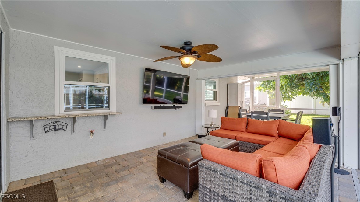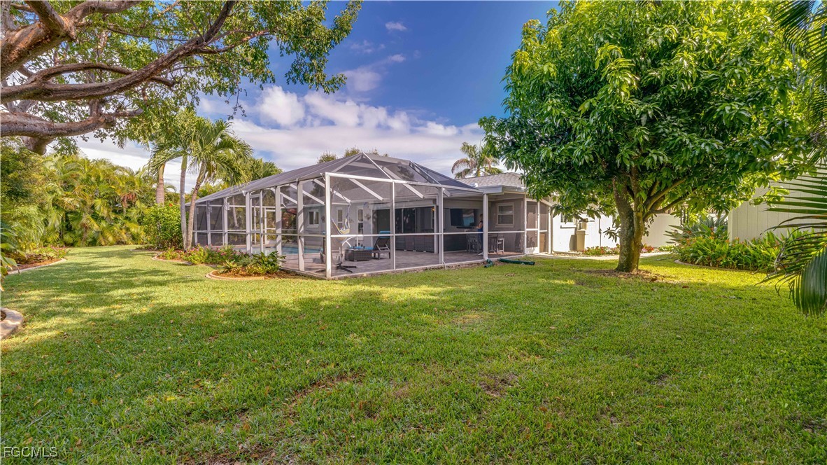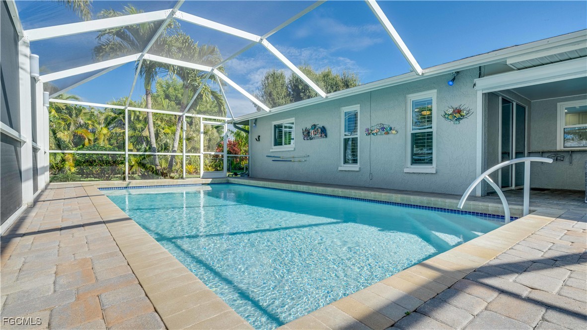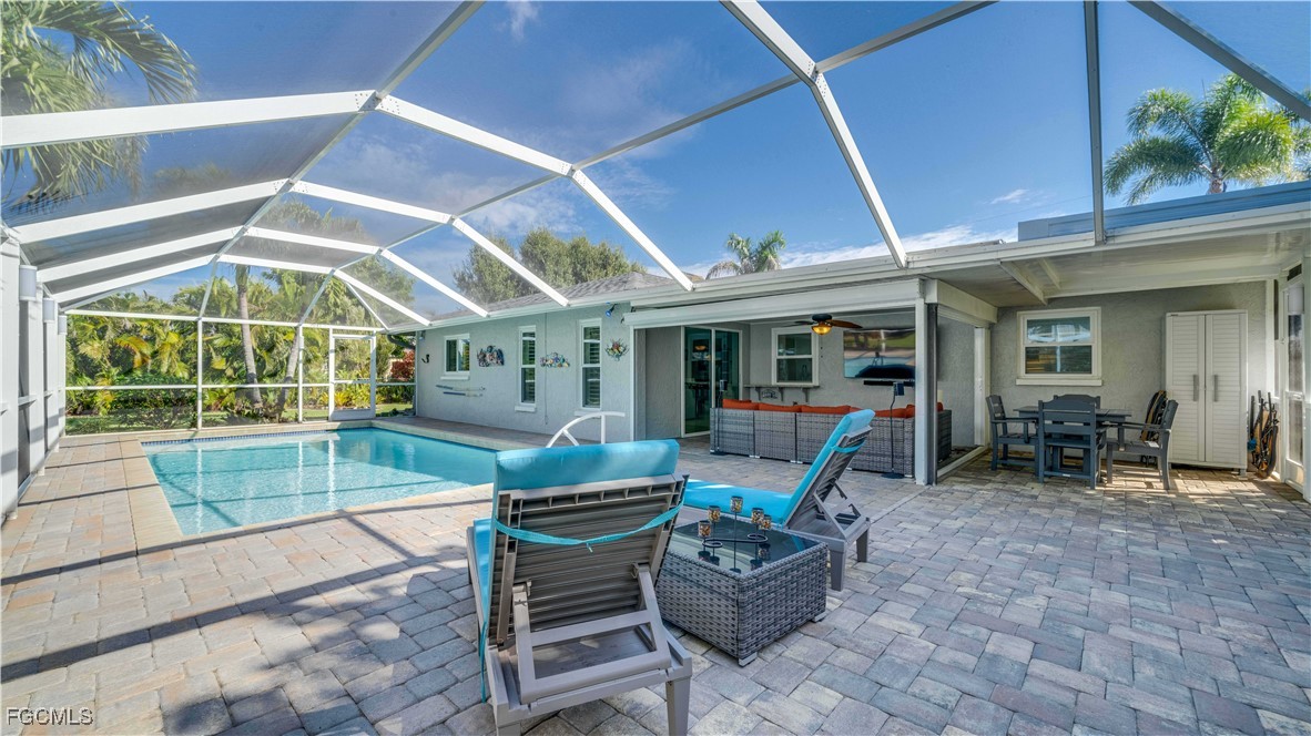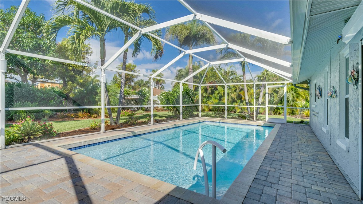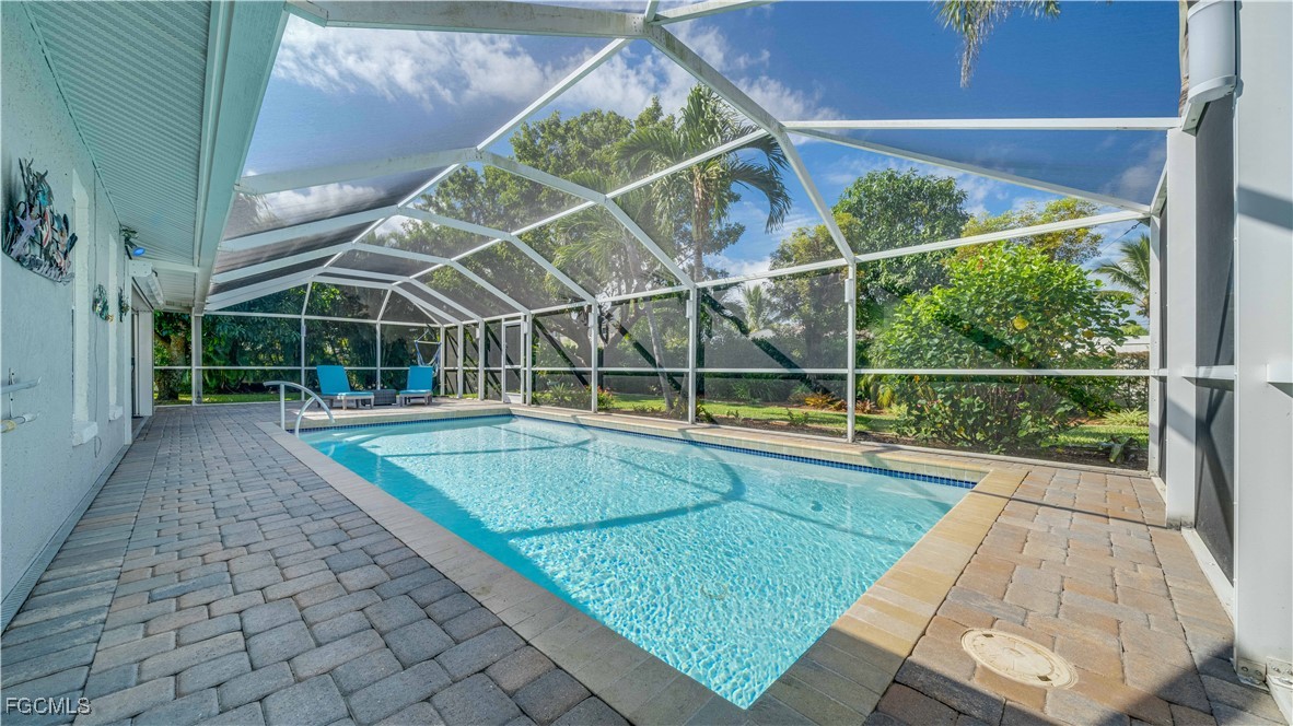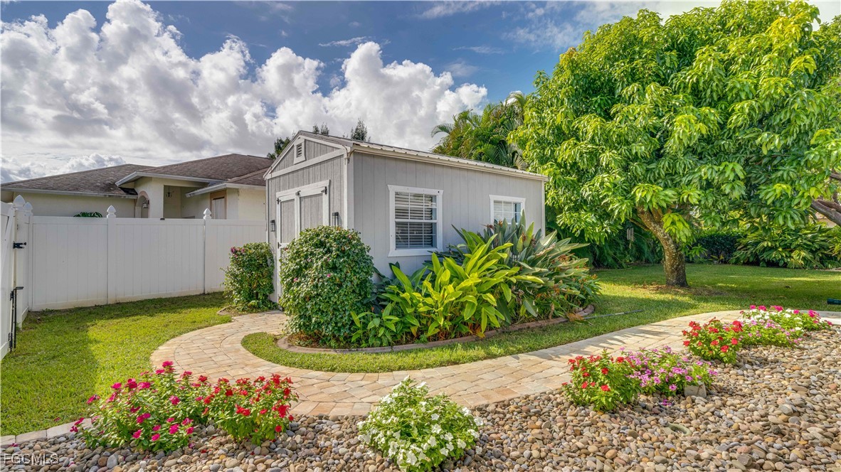 Welcome Home! This is the one you’ve been waiting for! This beautifully remodeled 3-bedroom, 2-bath home on a spacious, triple lot is truly move-in ready. The modern kitchen features soft-close cabinetry, quartz countertops, stainless steel appliances (including a wine fridge), and a convenient pass-through to the lanai. Elegant 24-inch tile flooring flows throughout the main living areas, while plantation shutters and a split floor plan add both style and privacy. Enjoy peace of mind with Impact windows, an Impact-rated front door, and a fully fenced yard. This home has not sustained any damage or flooding from Ian or other storms. Step outside to your private oasis, the pool and lanai area have undergone a 32K renovation. Including a resurfaced pool, new Salt Gen, new hand railing, expanded lanai, sealed pavers, surround sound in the seating area and remote-controlled color-changing lights. The detached 160 sq. ft. shed is air-conditioned, powered, and perfect for a gym, studio, or workspace. It even has its own storm shutters. Surrounded by mature landscaping, colorful flowers, concrete curbing and a fruit-bearing Valencia mango tree, this property combines comfort, security, and Florida charm — all with assessments paid in full! Sellers are offering a One-year Home Warranty thru American Home Sheild. There is a transferable flood policy currently at $1,074. This home offers everything, don't miss out!