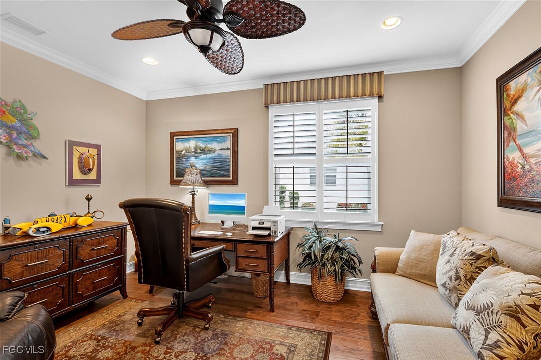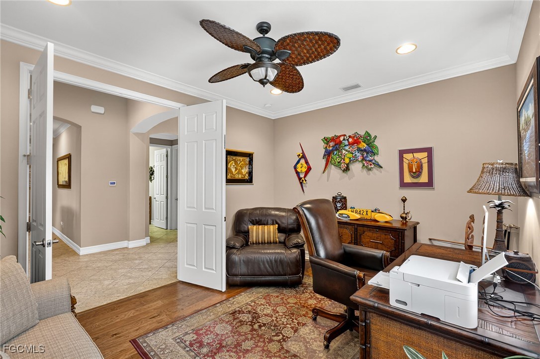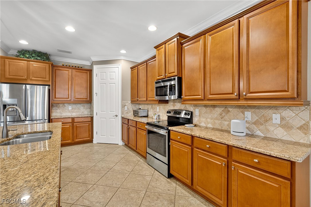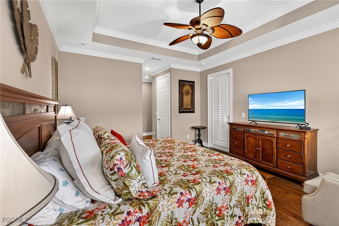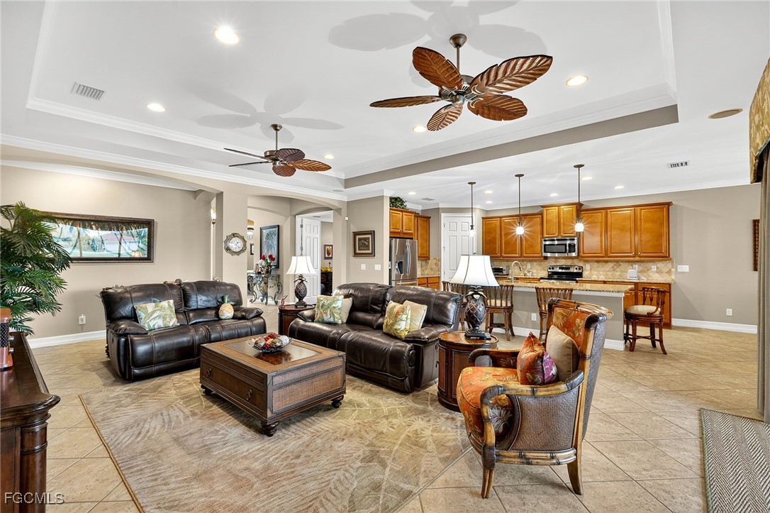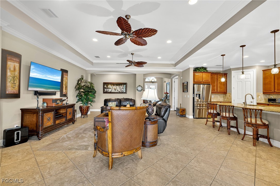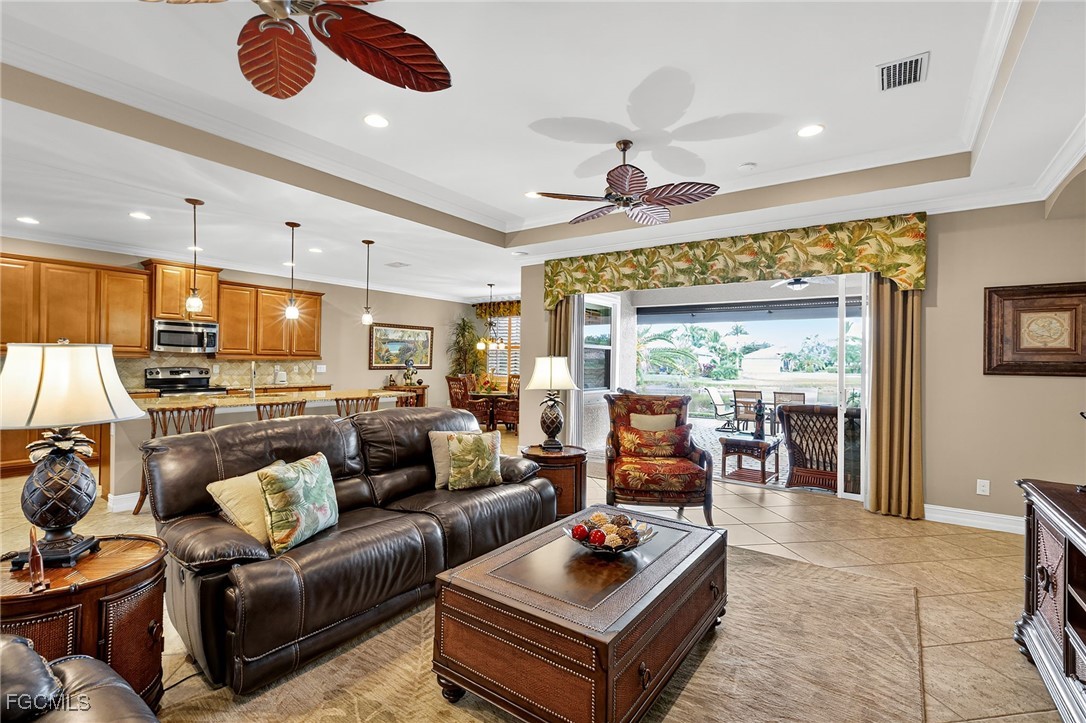Beautifully decorated, Fully Furnished, 3 Bedroom plus Den, 3 Full Bath, 3 Car Garage, Waterfront Home in the Exclusive Gated Community of Moody River Estates. This 2013 home has almost 2600sf of indoor living plus a screened-in porch and patio with almost 800sf overlooking a lake so you can enjoy the SW Florida weather. Large open concept living area with tray ceilings, crown molding, and huge triple pocket sliding glass doors with great views of the Lake. The spacious chef’s kitchen has newer high-end appliances, a large island, pantry, granite counters, and lots of storage. The extra large owners suite has two walk-in closets, and an extra large bathroom with dual, separated sinks, large soaking tub, and supersized walk-in shower. There are two additional guest bedrooms, one of which has an en suite bathroom, and there is a good sized den/office with French doors. The home comes tastefully furnished with high-end Tommy Bahama furniture. The laundry room has brand new LG washer and dryer, sink, large linen closet, and lots of storage shelves.