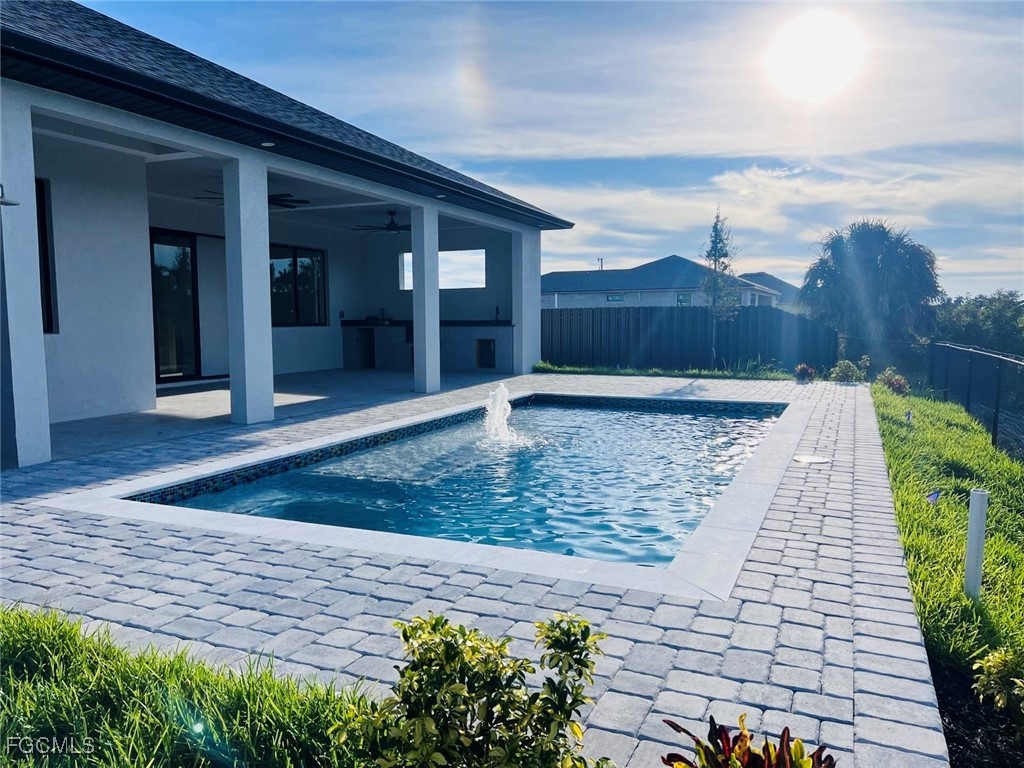 Step into luxury living with this exquisite brand-new residence in the heart of Lehigh Acres. Designed with a blend of Italian sophistication and contemporary Florida charm, this home features 4 spacious bedrooms, 3 full bathrooms, and a flexible den—perfect for work, guests, or relaxation. The open floor plan seamlessly unites the living, dining, and kitchen areas, creating an inviting atmosphere ideal for gatherings or daily life. The gourmet kitchen is a showstopper, showcasing imported Italian cabinetry, a striking quartz island, premium stainless steel appliances, and a sleek built-in oven with electric cooktop—perfect for those who love to cook and entertain. Elegant tile flooring extends throughout the home, adding a refined and cohesive touch. Retreat to the primary suite, where luxury meets tranquility. It offers dual vanities, a spacious walk-in closet, and a spa-inspired shower for a resort-style experience. The additional bedrooms are bright, airy, and generously sized to accommodate family or guests comfortably. Enjoy the Florida lifestyle outdoors with a fully fenced backyard offering both privacy and security, plus a covered lanai perfect for lounging or hosting friends. Situated on a 0.23-acre lot (approximately 10,000 sqft), the property strikes the perfect balance between spaciousness and easy upkeep.Constructed with quality and safety in mind, the home includes impact-resistant windows and doors, a paved driveway, and a two-car garage. Conveniently located near top-rated schools, parks, restaurants, and shopping centers, this residence offers an unbeatable combination of elegance, comfort, and accessibility. No HOA. No flood zone—just pure Florida living at its best.