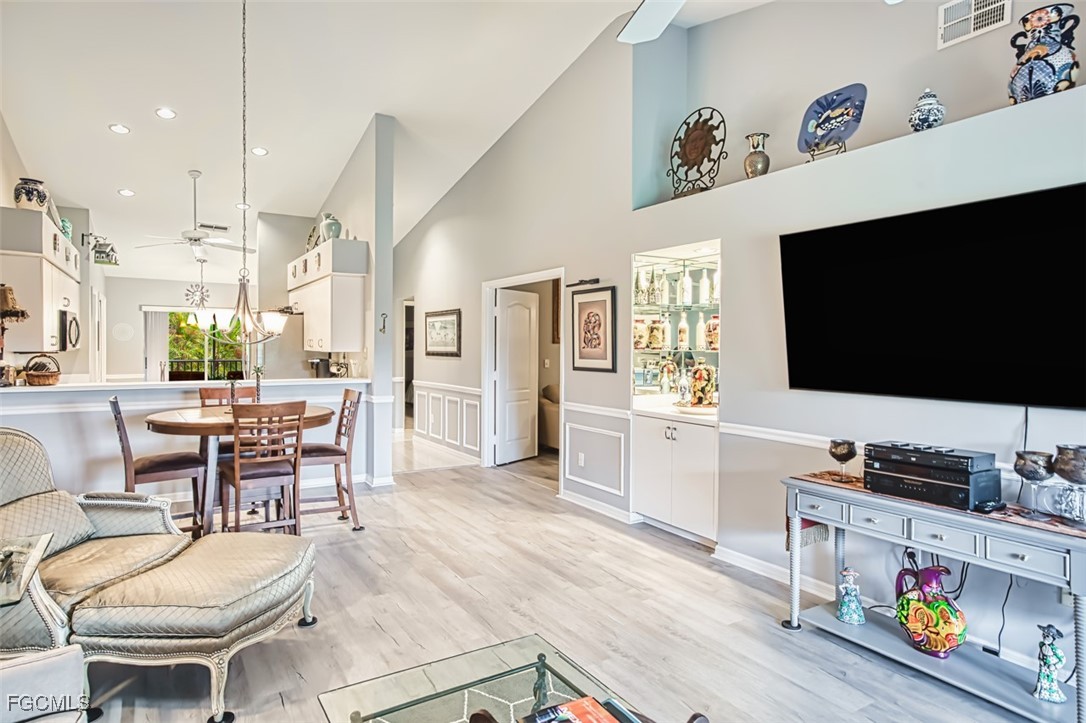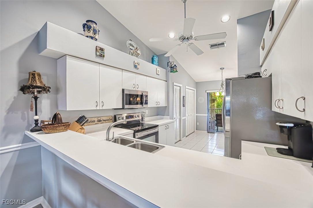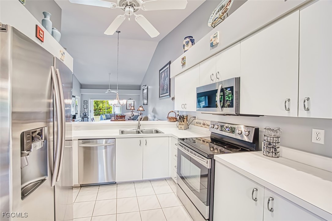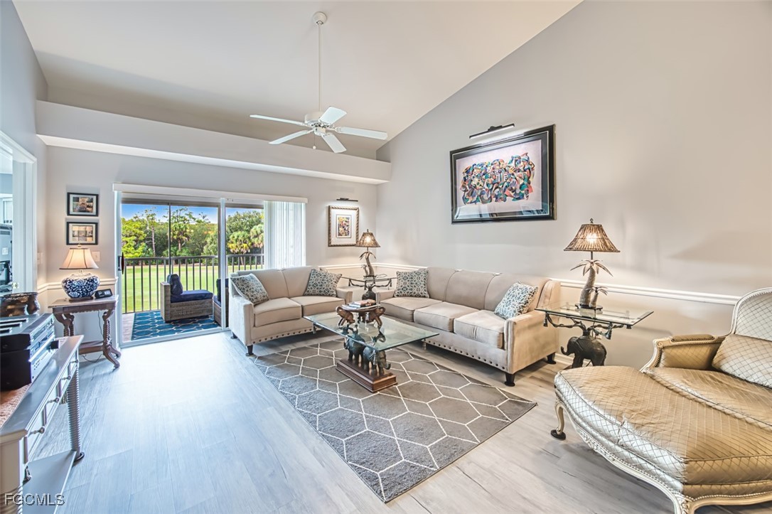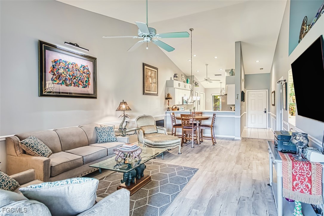 Golfers paradise- This stunning 2 bedroom 2 bath plus den condo in the prestigious community of Olde Hickory Golf and Country Club. Large eat in tiled kitchen with stainless steel appliances, recessed lighting, 2 large panties and sliding doors to your front screened lanai. Cathedral ceilings in living room, built in bar and sliding doors to your back lanai with golf course views overlooking the 7th fairway where you can enjoy a beautiful sunset while enjoying some refreshing beverages. Owners suite offers 2 large walk in closets, recently upgraded bathroom with custom tiled walk in shower and doors, raised vanity and LED mirror. Guest bath has been upgraded as well with custom tile, raised vanity and LED mirror. A beautiful den separates the 2 bedrooms giving both you and your guests complete privacy. Den can also be used a 3rd bedroom for those extra guests from the north. New luxury vinyl in most of living space, guest room has carpet. Separate detached 1 car garage. Olde Hickory is a true Country Club lifestyle with Resort style pool, fitness center, Bundled golf, tons of amenities, 22,000 sq ft clubhouse, close to I-75, Red Sox and Minnesota spring training stadiums . Building has new roofs and has been freshly painted. Be sure to tour the amenities !!! Beautiful community you won't be disappointed.