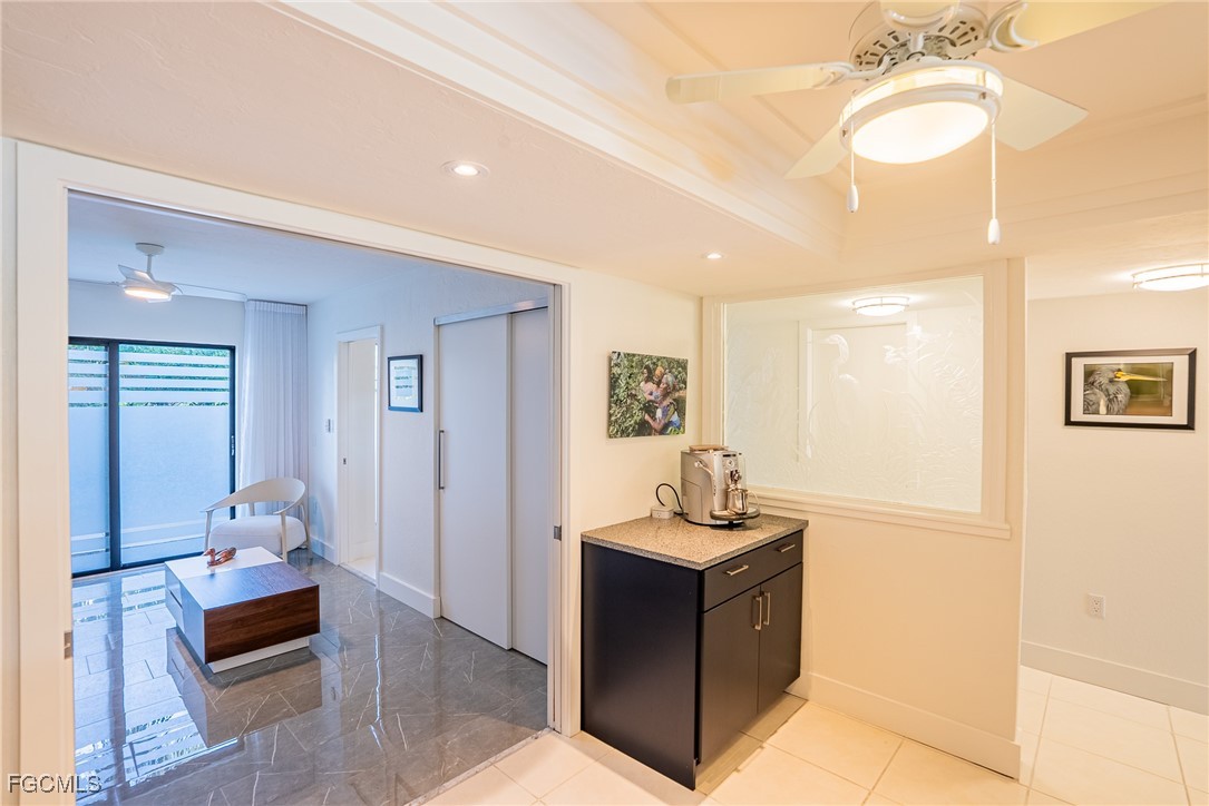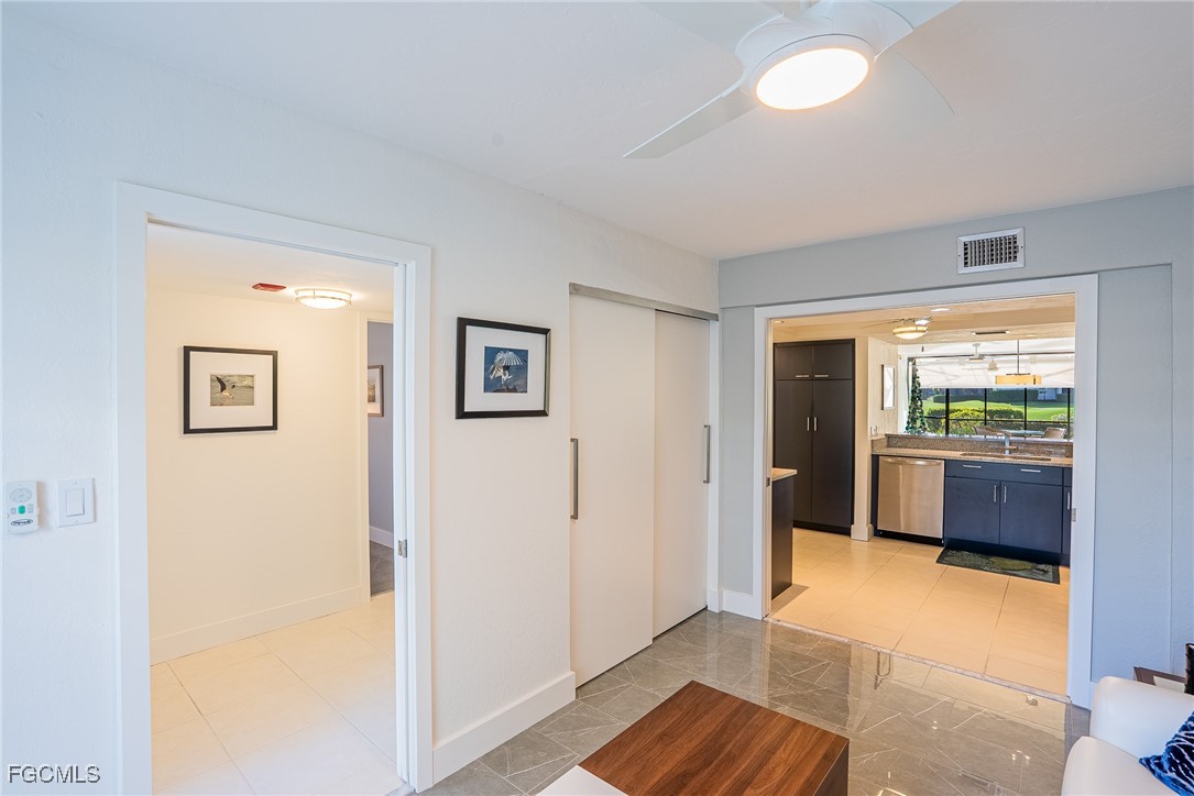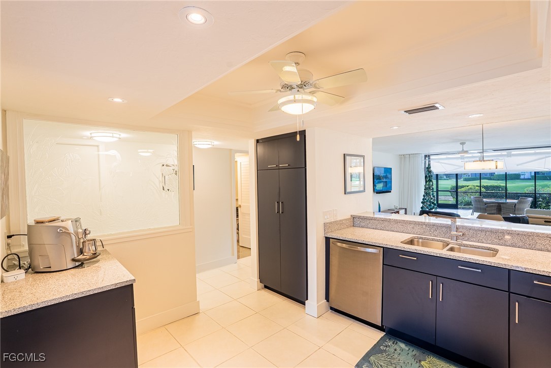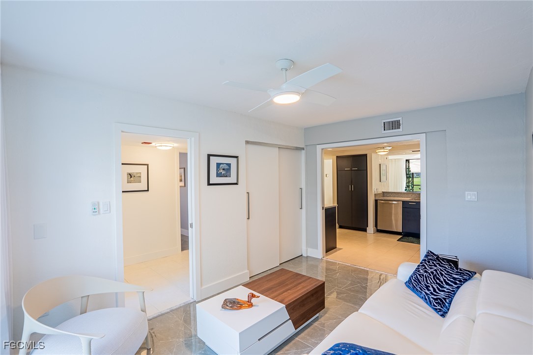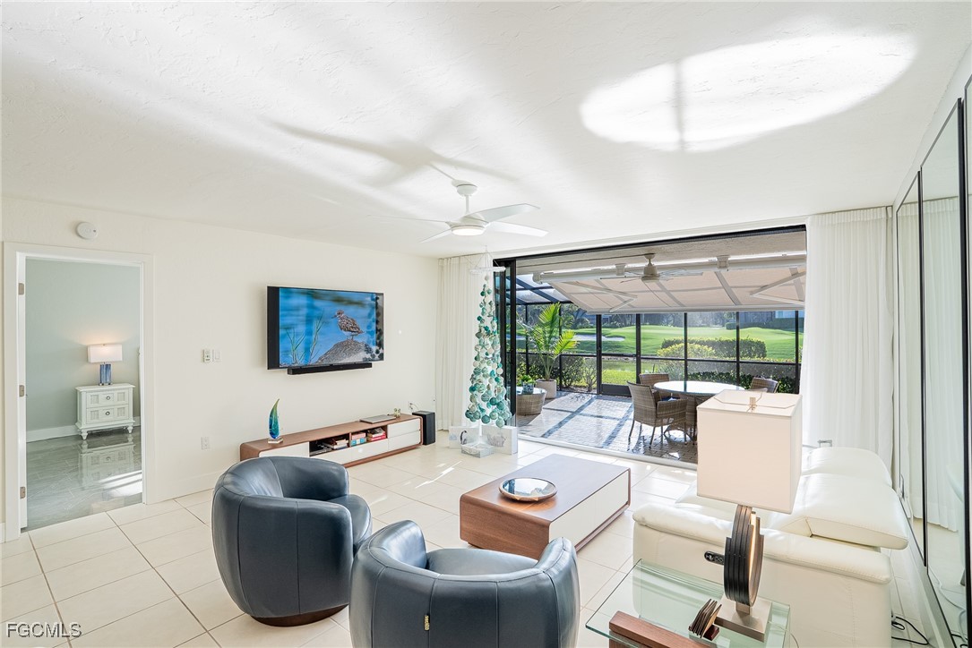 Simply Gorgeous 1st Floor Condo, Furnished Turnkey, and with Lake and Golf Course Views! Located in Dove Hollow at The Forest! Fantastic Huge Tiled Screened Lanai with Expansive Water Views, Ceiling Fans, Electric Sun Awning with Remote, and Hurricane Impact Sliders. New Roof! Beautiful, Bright, and Modern Home with Open Floor Plan! Lovely Main Bedroom with Sliders that lead out to the Lanai and Walk In Sized Closet. Large Tiled Open Living and Dining Areas with Contemporary Built in Cabinetry and Inviting Breakfast Bar. Stunning Kitchen with Lots of Storage and Counter Space, Matte Navy Blue Cabinetry, White Gloss Contemporary Cabinetry, Granite Countertops, Dual Sinks, All Appliances in Place, Custom Glass to Hallway, and Opened up to the Living and Dining Area for Easy Entertaining and Views! Guest Bedroom with Walk In Sized Closet. Guest Bath with Granite Countertop and Large Tiled Shower with Built In Nook and Glass Door. PLUS a Den or Third Bedroom with Closet and Sofa Bed. Other Notes and Features: Remodeled, Beautifully Furnished, Custom Mirrors, Custom Doors, Upgraded Fixtures and Fans, Etched Glass Hallway Feature, Two Tone Kitchen Cabinetry Wood and Contemporary. Tiled Laundry Room with Full Sized Washer and Dryer. Detached Carport and Guest Parking Available. Please See Aerial Photos, Floor Plan, and the Video Walk Through! Dove Hollow has it's own Community Pool. Memberships to the Forest County Club are Available and are Optional, Not Mandatory. Some of the Listed Amenities Herein require Memberships. The Forest is a Premier Residential Gated Community offering Great Amenities and a Central Location Close to Major Routes, Shopping, Dining, Lakes Park, RSW International Airport, Sanibel, Captiva, Fort Myers Beach, Naples and the many Beaches of SW Florida! The Forest offers Two Championship Golf Courses, Tennis Club, Pickle Ball, Bocce, Active Social Activities, Grand Club House, and Fine and Casual Dining. This Home is A Must See! Schedule Your Showing Today!