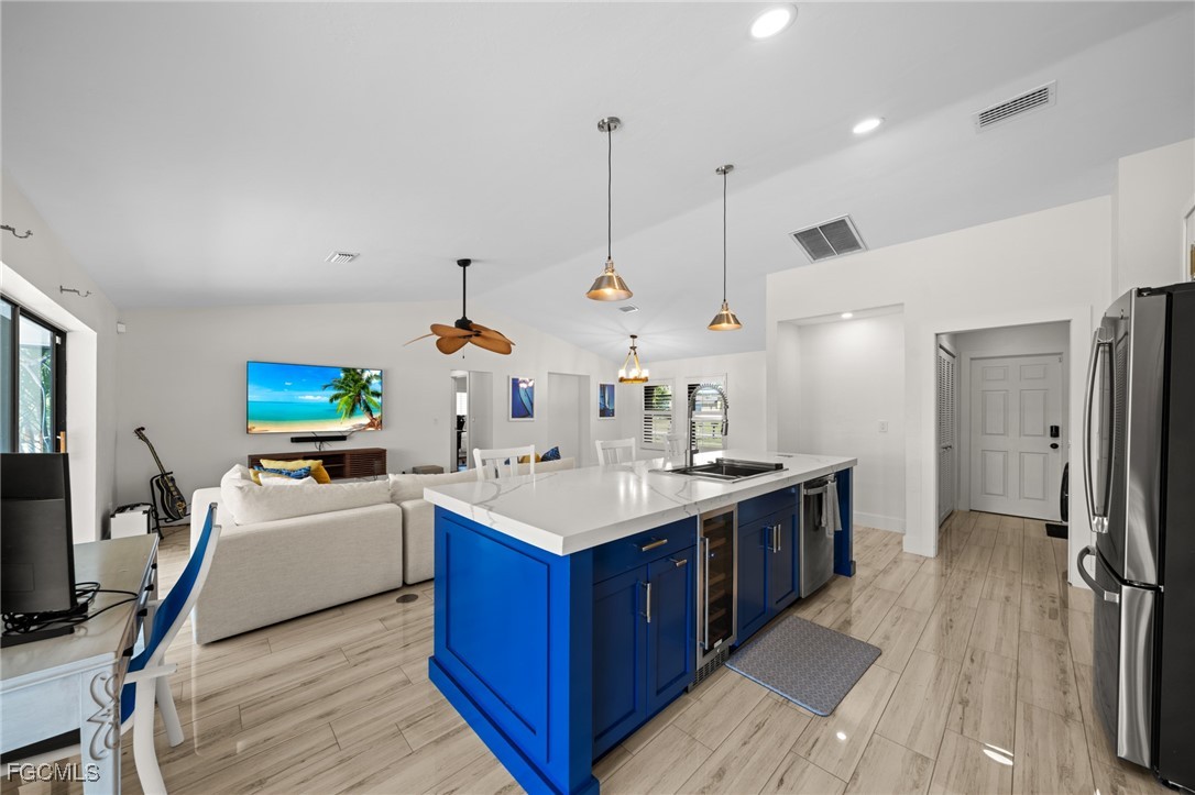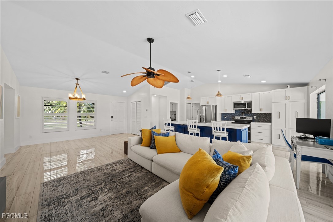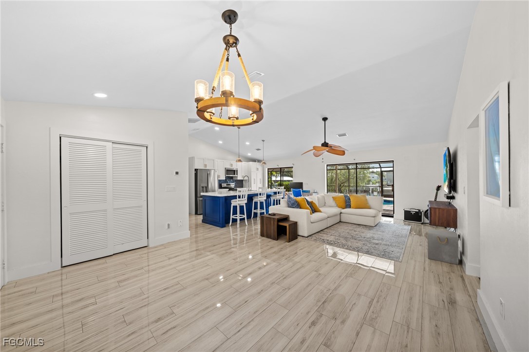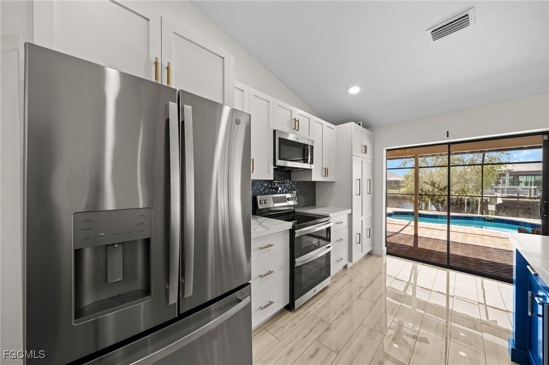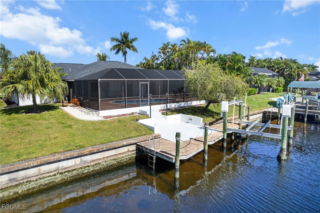 Fully updated Gulf Access Pool Home—a true showcase with sunny southern exposure pool and stunning wide canal views. Every day feels like a vacation as sunlight pours across the pool and lanai, reflecting off the sparkling waters beyond your private dock with boat lift. Step inside to discover a beautifully remodeled 3-bedroom, 2-bath home. The custom kitchen is the centerpiece—crafted with quartz countertops, soft-close cabinets, stainless-steel appliances, a convenient pot filler, wine refrigerator and a designer sink. Pocket sliders from the living room and master suite disappear to create seamless indoor/outdoor living. The expansive lanai offers generous seating areas, a sparkling pool, pool bath, and an outdoor shower—all overlooking the tranquil intersecting canals. This turnkey furnished home is move-in ready—just bring your toothbrush and bathing suit. With a private dock and boat lift, you’ll enjoy gulf access to Fort Myers Beach & Sanibel Minutes from shopping, dining, and all that Cape Coral has to offer, this property delivers the ideal blend of convenience and coastal elegance. Whether you’re seeking a full-time residence, a vacation getaway, this home embodies the best of Florida living—Recent improvements include a newer roof, AC system, replumbed, resurfaced pool, and newer pool heater, newer washer/dryer and epoxied garage floor.