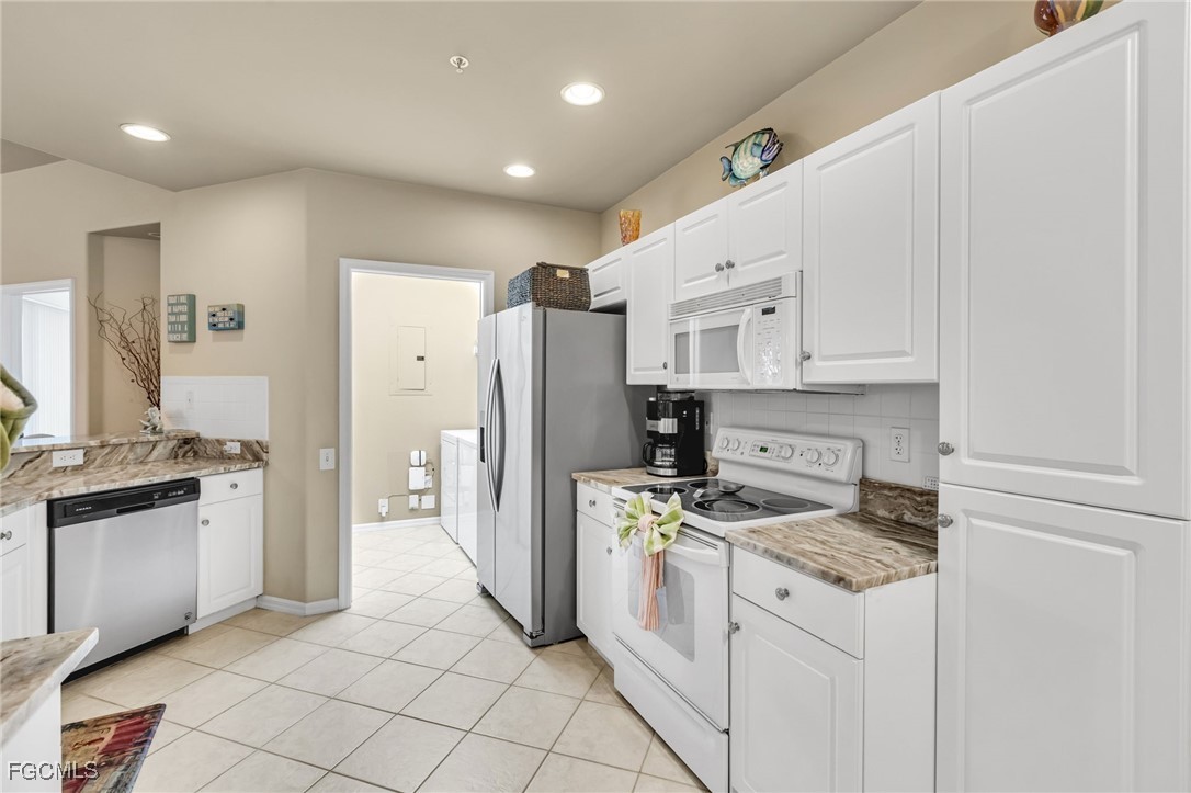 Enjoy a large lanai with a small lake view—a comfortable and relaxing space to enjoy Florida living. The lanai has electric hurricane shutters, and the other windows feature roll-down shutters for storm protection.
