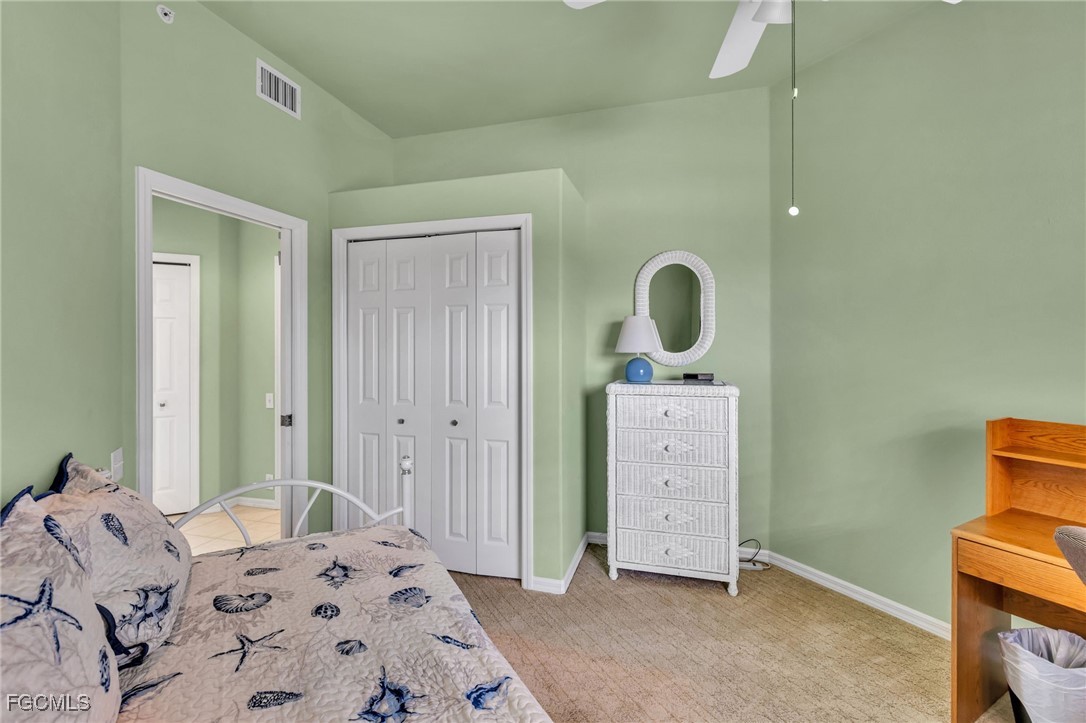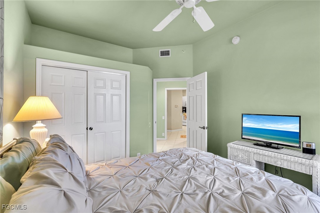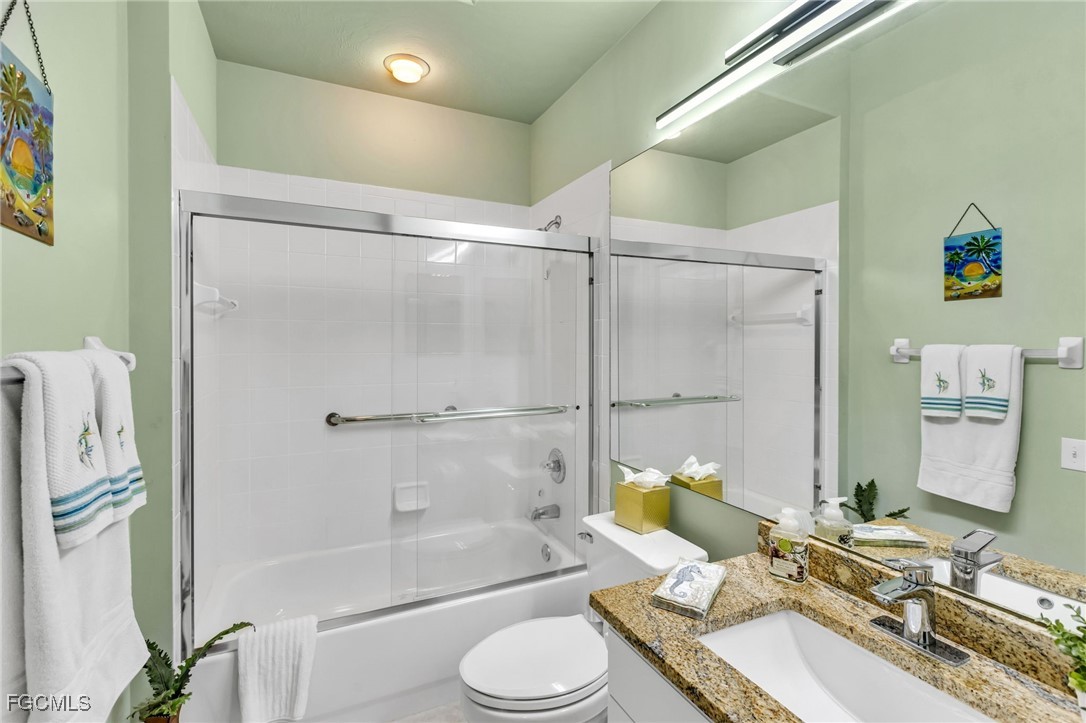 The two guest bedrooms are separated from the main living area with a sliding glass door, giving guests a private suite feel. The guest bathroom includes a shower/tub combination and granite countertop.