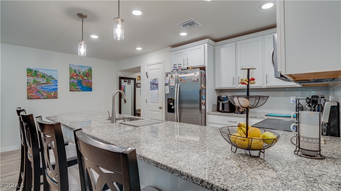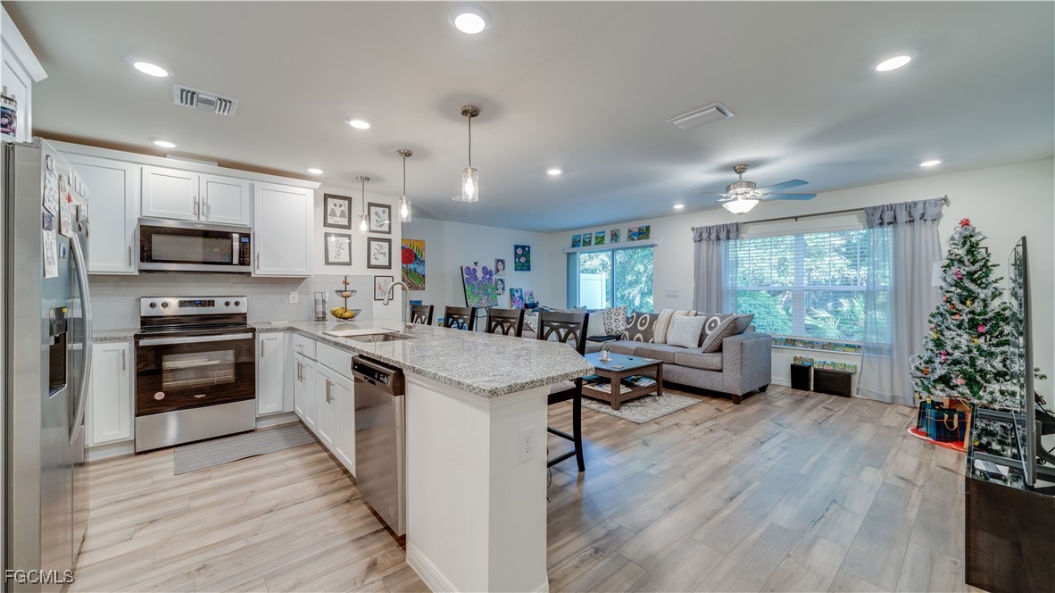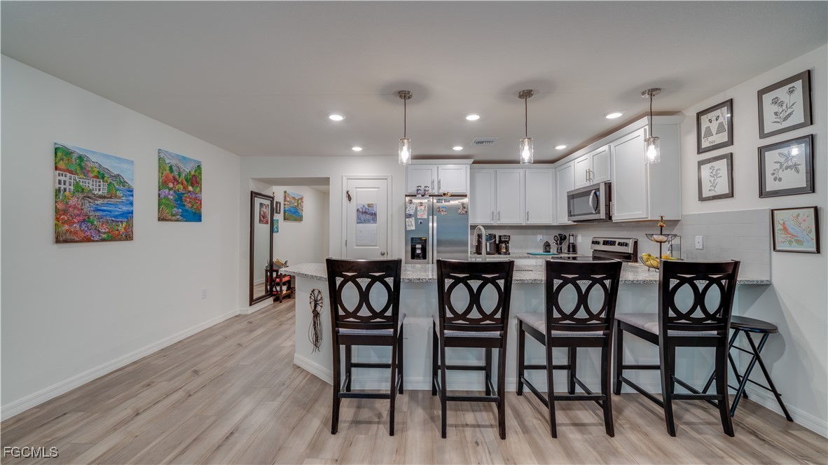 The kitchen is a standout feature, offering upgraded granite countertops, Whirlpool stainless steel appliances, attractive cabinetry, and a breakfast bar that’s great for casual meals or entertaining. The kitchen opens to the dining and living areas, where vinyl plank flooring on the first level adds a modern look and low-maintenance durability.