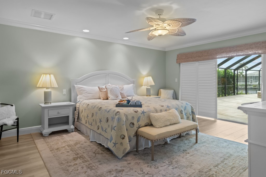 The sliding glass doors pocket completely, creating a harmonious connection between indoor and outdoor living spaces, perfect for year-round Florida enjoyment. The expansive primary suite offers direct access to the lanai and features an ensuite bathroom with generous storage and a spacious walk-in closet. The private water closet includes both a toilet and bidet, adding a touch of luxury to your daily routine.