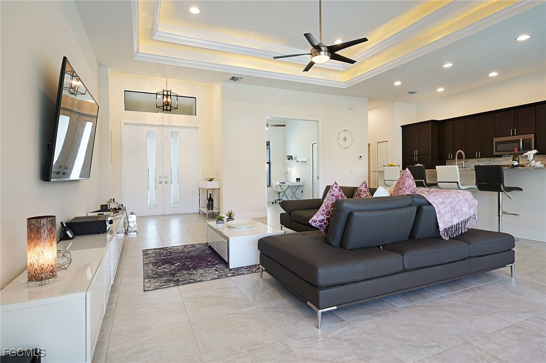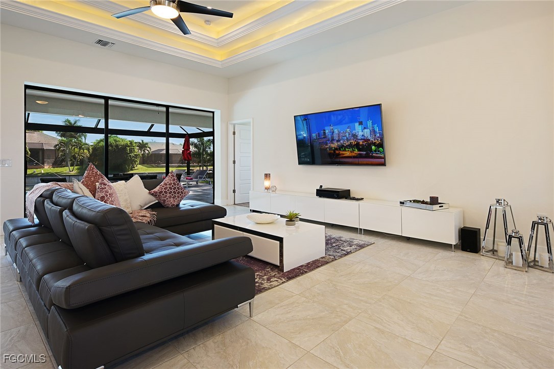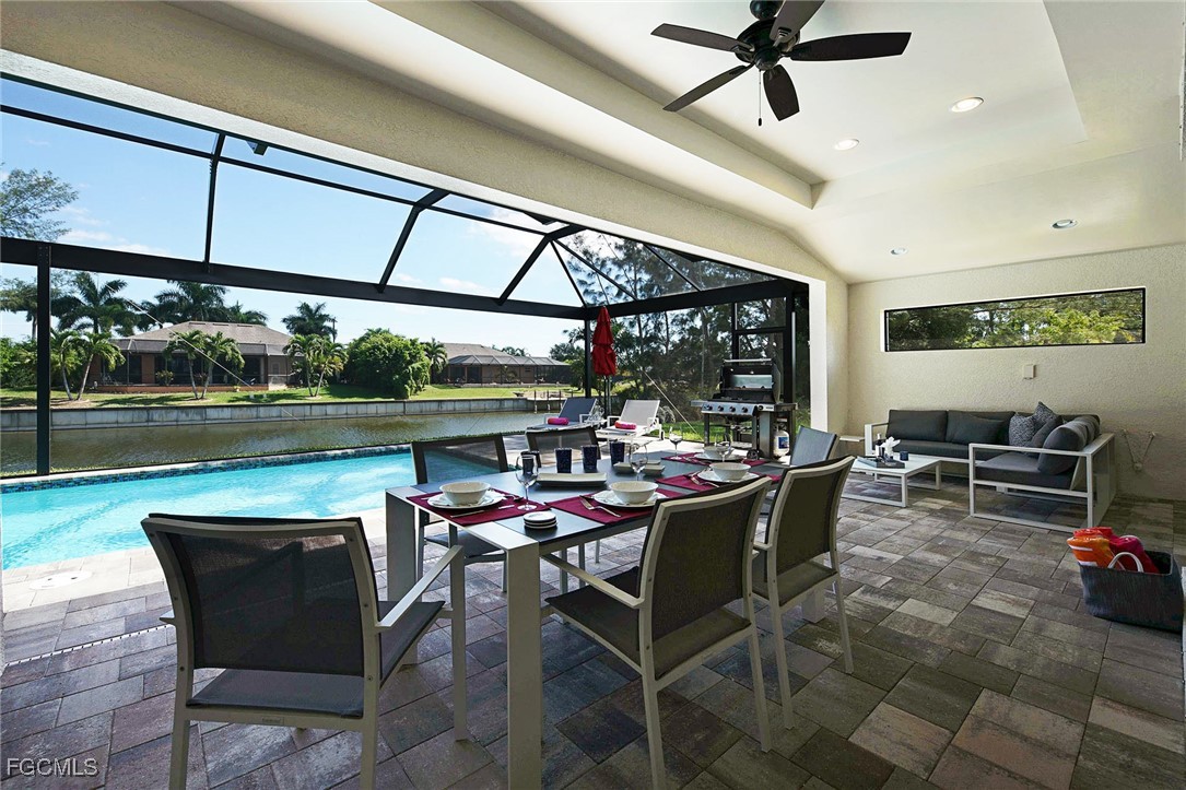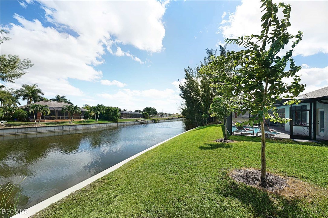 WELCOME TO PARADISE! Once you open the front door you will feel home at this beautiful Florida house. Enjoy each morning with a gorgeous SUNRISE. Great VIEW into intersection canal at the Tahiti Canal. – The house features over 2,100 sqft with 3 spacious Bedrooms, 2 bathrooms plus DEN and a large 3-car garage. You will love the open floor plan with illuminated high tray ceilings. Den could be used as 4th bedroom. – Lanai Doors open to the beautiful pavered pool area and the large screened-in Lanai. There is plenty of room for entertainment at the lanai. Outdoor kitchen is pre-installed. Fresh exterior Paint. There are much more attractive details. – This house is located in a quiet neighborhood with several new constructions. Centrally located to Shopping and Cape Harbour. – NO FLOODING at any Hurricane! – This property could be a great Investment Opportunity as Vacation Rental, since it is already in a Rental Program. But it could also be your new full-time Residence or your Seasonal Retreat. – So, don’t miss this chance to own YOUR PIECE OF PARADISE!!!