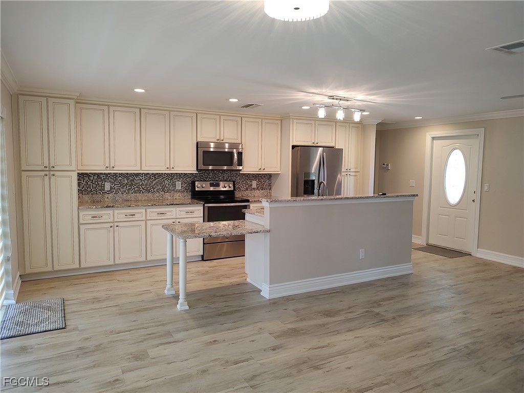 Welcome to this charming home that seems much larger than expected. The open great room windows and sliders are equipped with motorized zebra shades and remote controls. Gather in the breakfast nook or dining area at one end of a generous island kitchen with breakfast bar, gleaming granite countertops, custom cabinets, designer light fixtures, and upgraded appliances. Extra wide sliding glass doors show off a lovely view of your landscaped backyard and the oversized lanai has both screening and glass doors for year around activities. A small open stone patio offers even more possibilities to enjoy the Florida sun. Two large bedrooms on opposite ends of the home offer peaceful privacy to all occupants and guests with plentiful closet space. Guest room closet contains extra electronic hookups and shelving for a small office setup, if desired. Nicely updated features in bathrooms, and an oversized garage with laundry and storage. Well maintained and cared for, this home sits on a large corner lot in a beautiful, peaceful and highly desirable area with shopping, dining, medical, worship, schools, parks, and more just moments away.