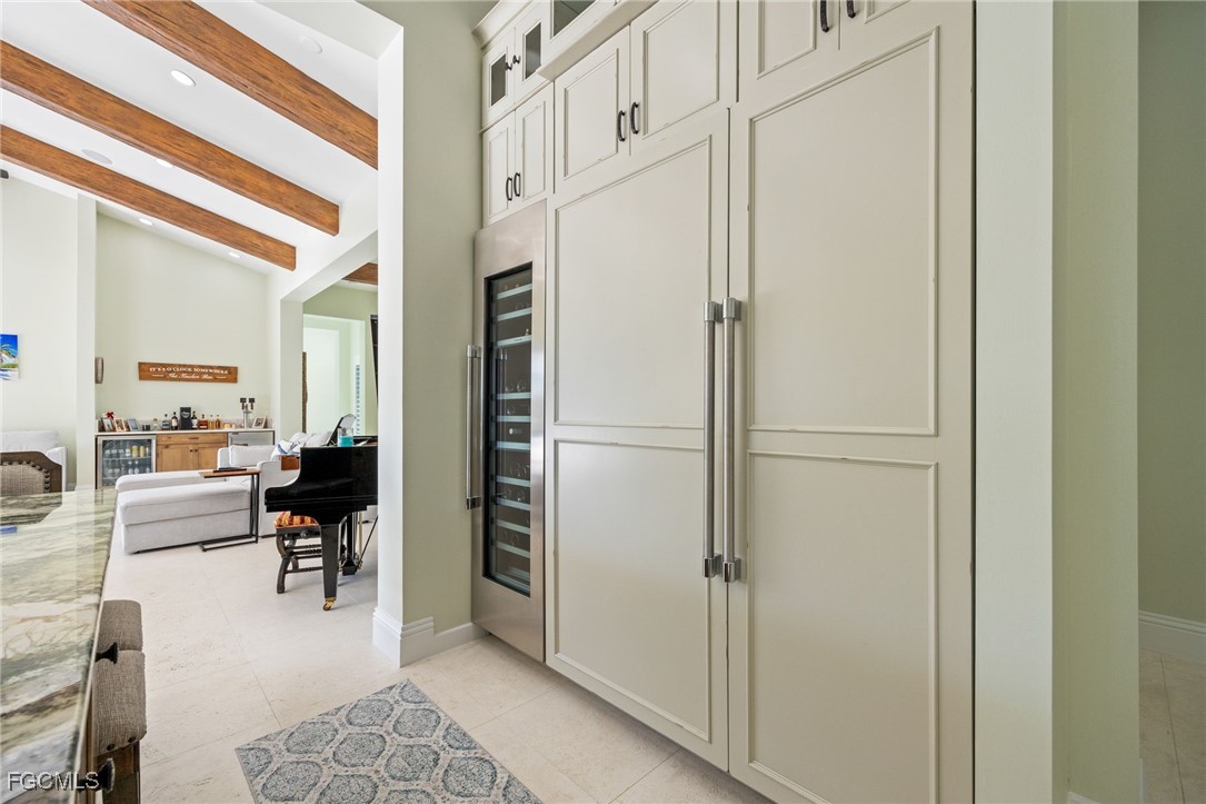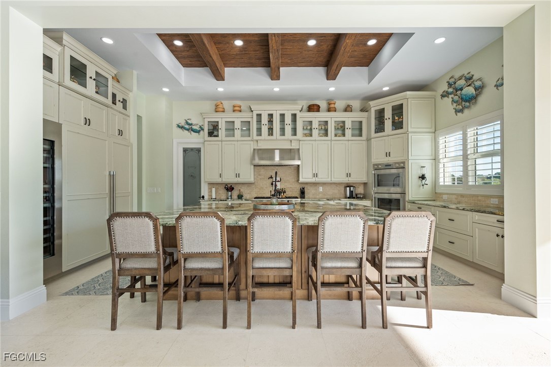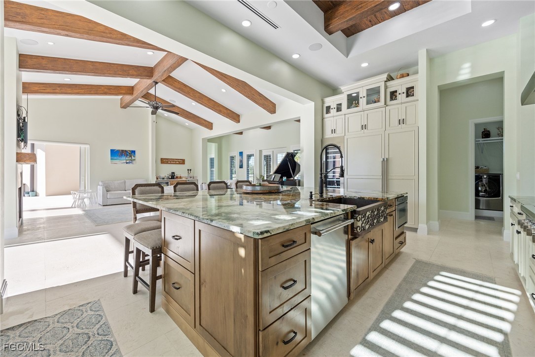 Step inside through a grand foyer featuring impressive 16-inch-thick walls. The interior offers tile flooring throughout and soft-close cabinetry throughout the home. The living room showcases a wood-burning fireplace complemented by striking wooden beam accents, creating warmth and character, and flows seamlessly into the chef’s kitchen. The kitchen is complete with high-end Thermador appliances, a gas cooktop with pot filler, an expansive walk-in pantry with a dedicated freezer, and a beautiful wooden tray ceiling with coordinating beam accents. A large laundry room with laundry tub adds everyday convenience.