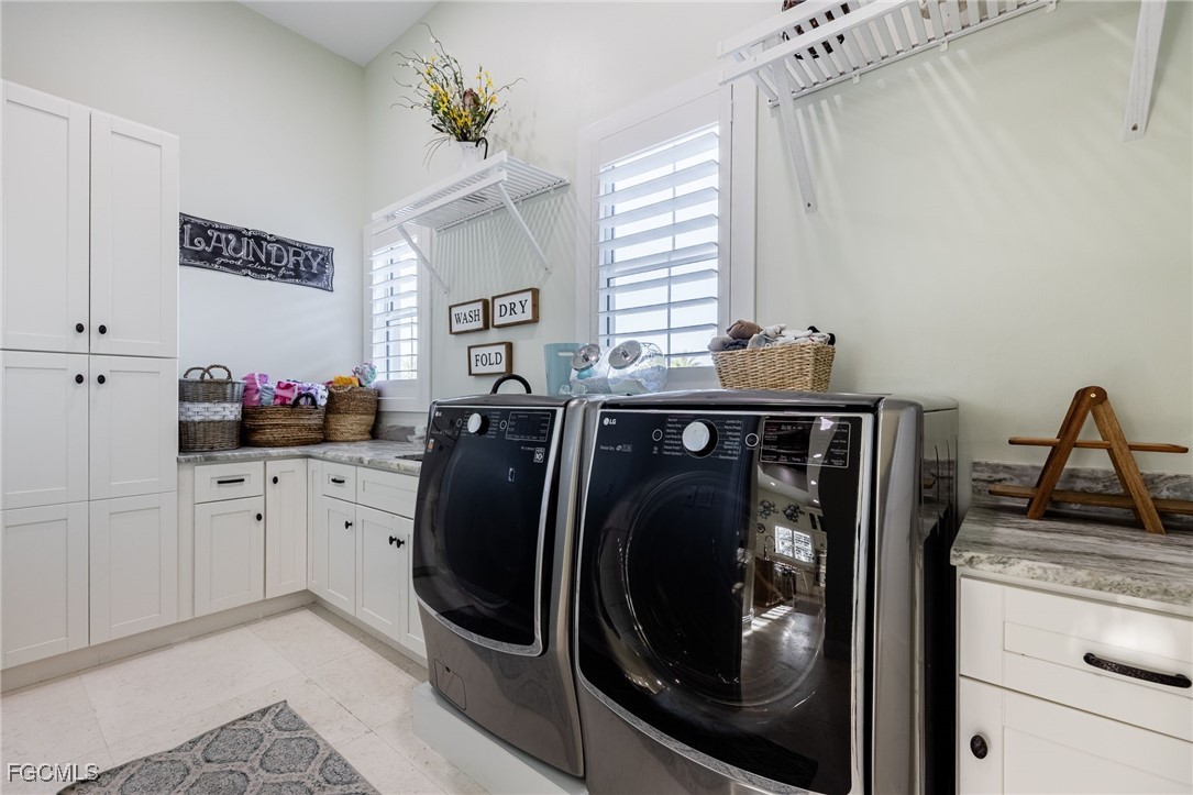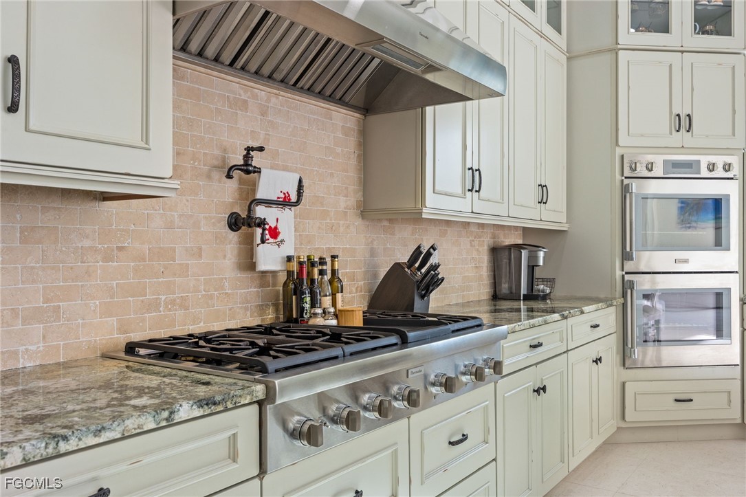 Outdoor living is elevated with an open lanai featuring a gas fireplace, sparkling pool, and color-changing lanai lighting that can coordinate with music. Cut limestone enhances all exterior areas on the back deck, creating an elegant and durable outdoor living space. Soffits are finished with plywood, then stuccoed and painted for long-term quality. The manicured grounds include a full sprinkler system and lead to a private wooden dock equipped with two 7,000-lb boat lifts, electric, and fresh RO water—ideal for boating and waterfront enjoyment.