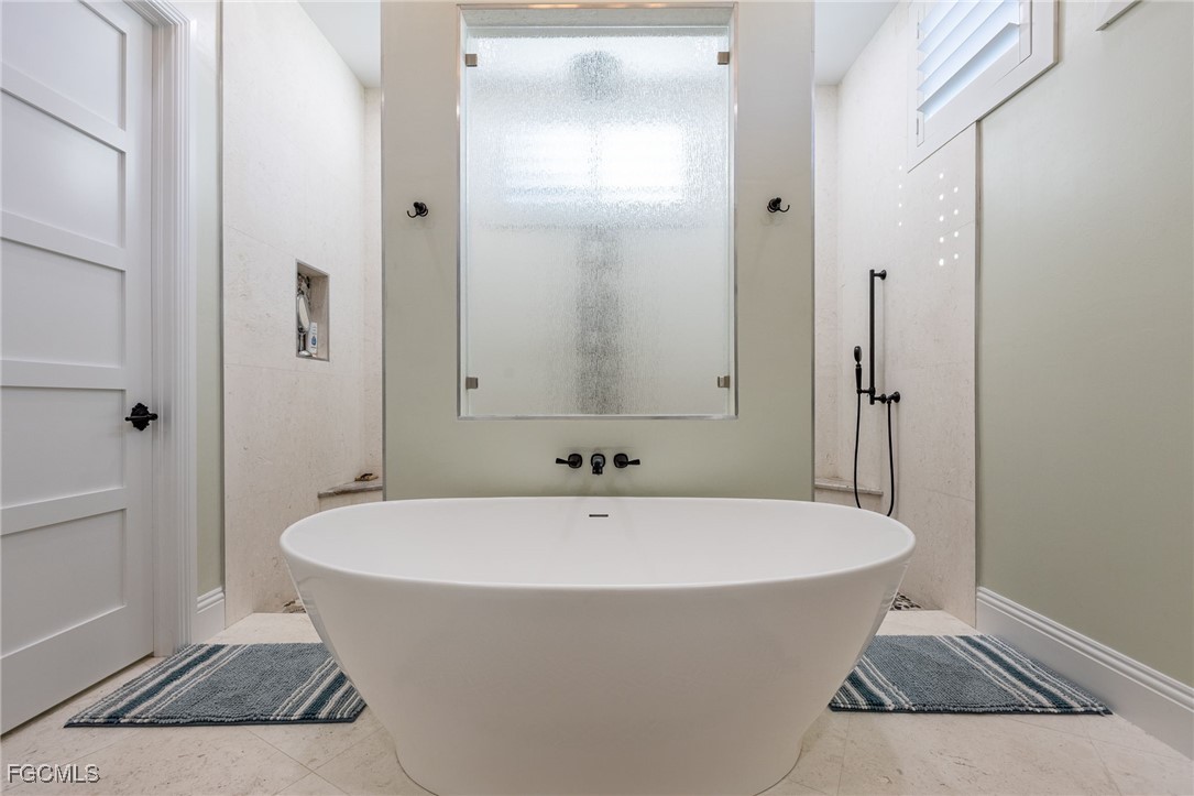 The primary suite is a private retreat, featuring elegant wooden beam accents and a spa-like bathroom with a walk-in shower offering dual shower heads, a separate soaking tub, and dual sinks.