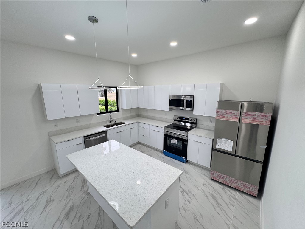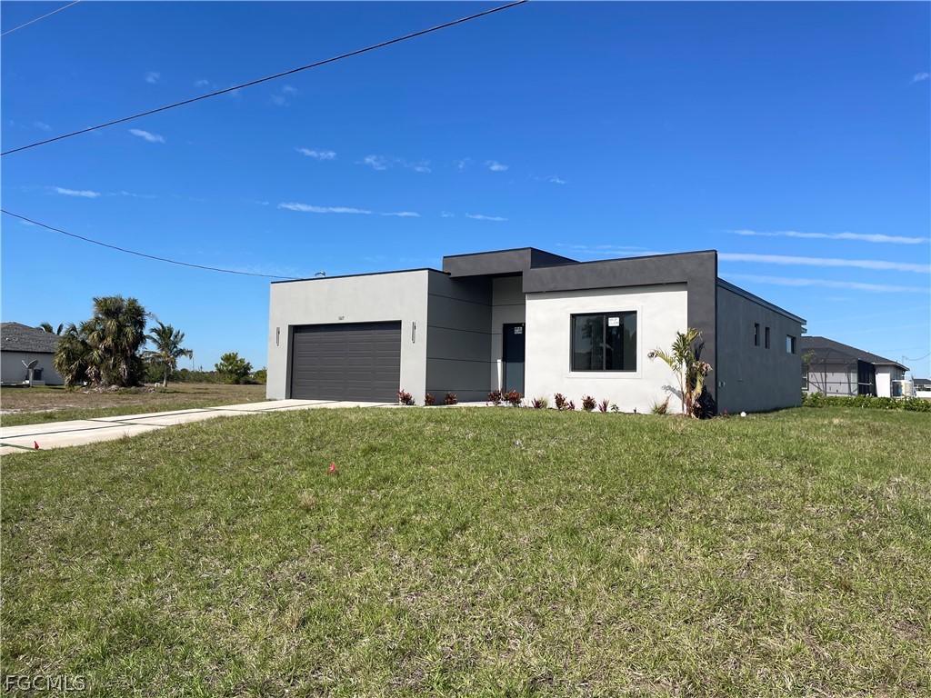 Discover this stunning, move-in-ready new construction home offering 1,904 sq ft of living area located in the fastest-growing area of Cape Coral. Featuring a sleek contemporary layout with 10-foot ceilings and elegant tile flooring throughout, this residence boasts 4 spacious bedrooms and 3 stylish bathrooms. Enjoy a gourmet kitchen with white cabinetry, quartz countertops in both the kitchen and bathrooms, and stainless steel appliances. Bathrooms feature frameless glass-enclosed showers, adding a luxurious touch. A washer and dryer are also included for your convenience. The open floor plan seamlessly connects living, dining, and kitchen areas, while the private backyard offers a peaceful retreat. Built with Stem Wall foundation for enhanced elevation and structural strength, this home also features impact-resistant windows and doors, automatic garage door, irrigation system, and high-end finishes throughout. This property is ideal for families, snowbirds, or investors. Plus, it includes a builder’s warranty 1-2 years and 10-year structural coverage offering peace of mind for years to come. Don’t miss this incredible opportunity to own a high-quality home in a booming location!-WITH SHELVES, FILTER AND BLINDS